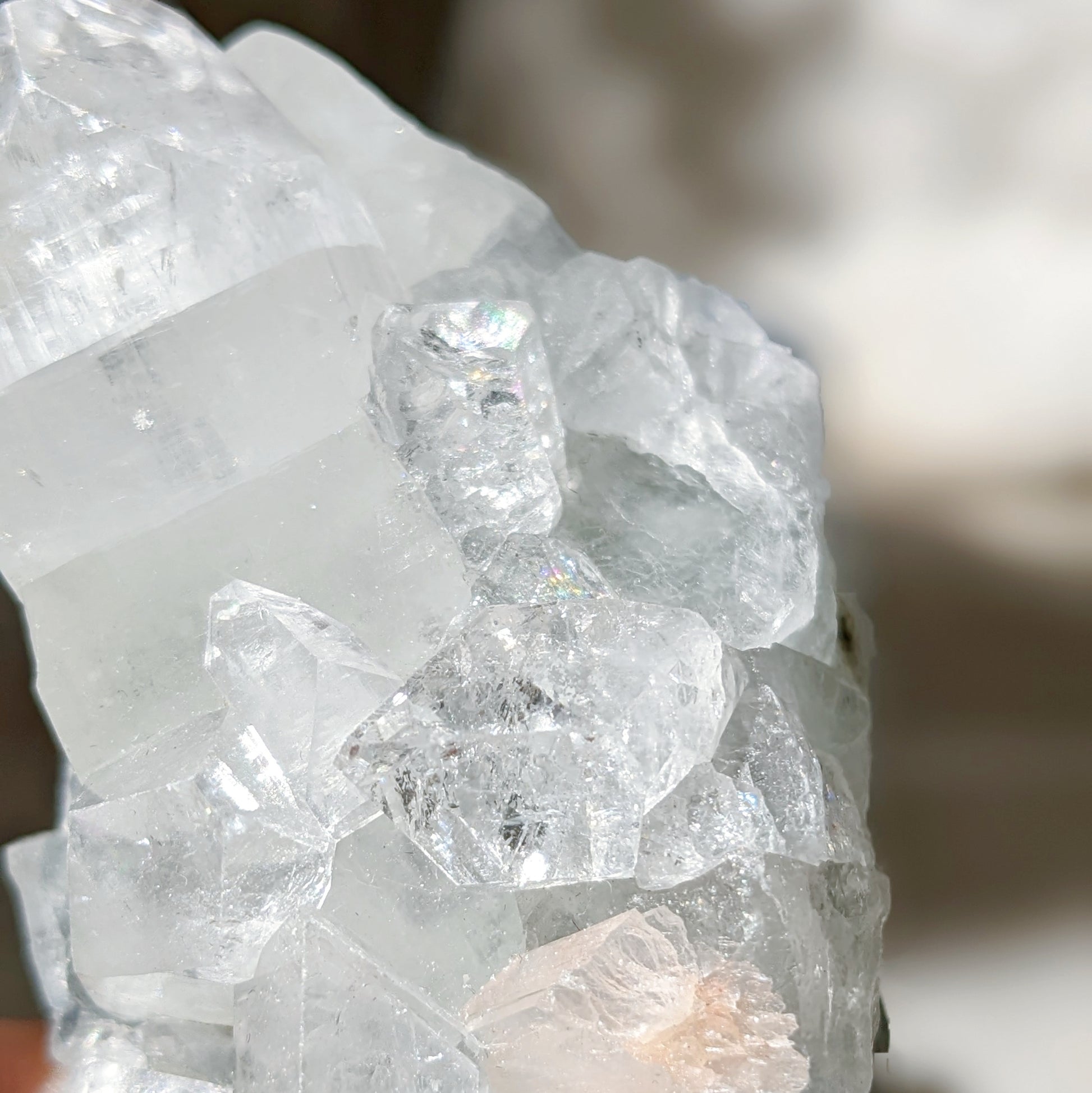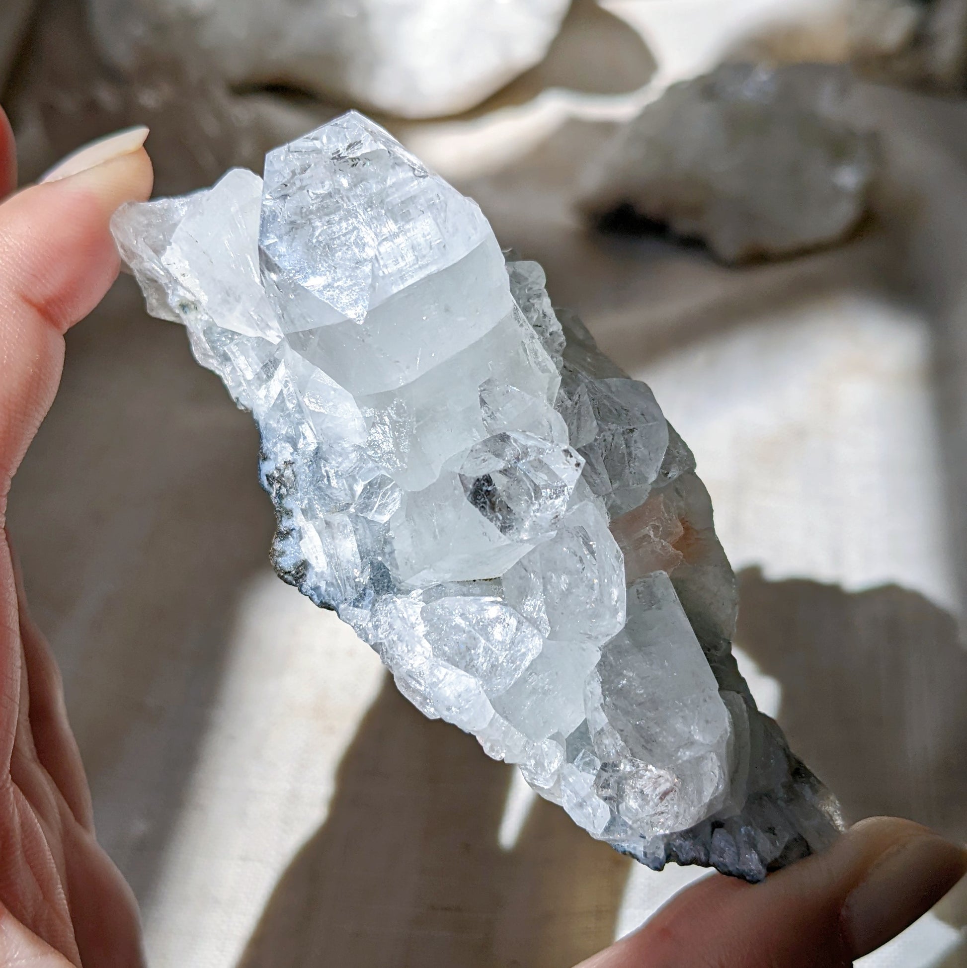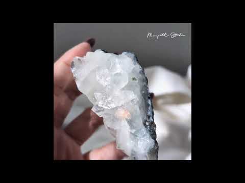 Apophyllite has high vibration that resonates with your spiritual energy, it stimulates the third eye chakra and crown chakra, and opens you up to spiritual awakening. They are commonly found in combination with stilbite, and includes little pyramids that are wonderful in transmitting energy. It's very effective on charging your crystal bracelets especially moonstone.