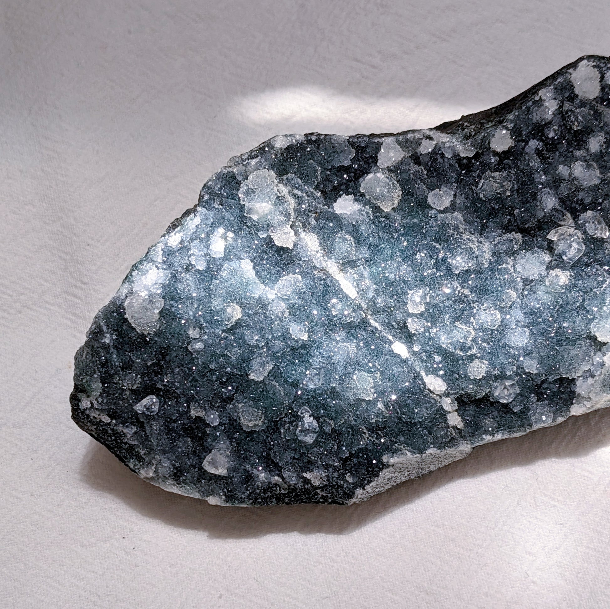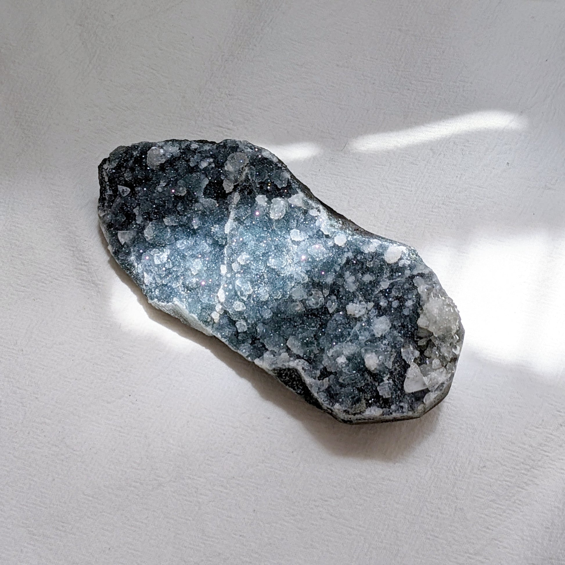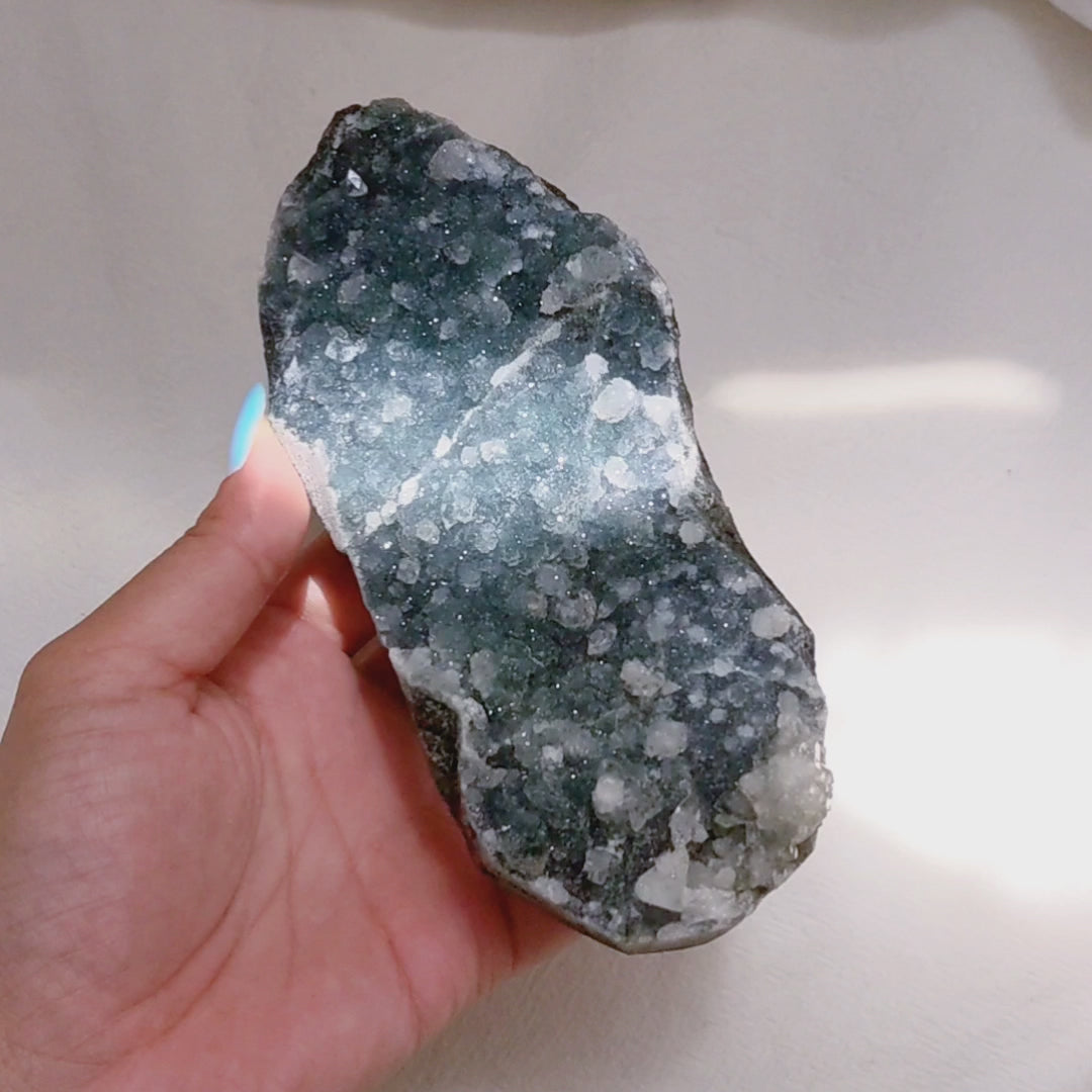 Apophyllite has high vibration that resonates with your spiritual energy, it stimulates the third eye chakra and crown chakra, and opens you up to spiritual awakening. They are commonly found in combination with stilbite, and includes little pyramids that are wonderful in transmitting energy. It's very effective on charging your crystal bracelets especially moonstone.