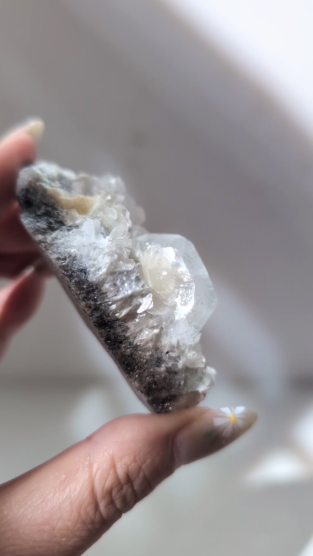 這顆海藍寶有很好看的生長紋,顏色淡藍清透,配上透薄閃亮的銀色雲母,海藍寶晶體上也帶著一朵小雲母花,而且是一顆資料庫水晶。