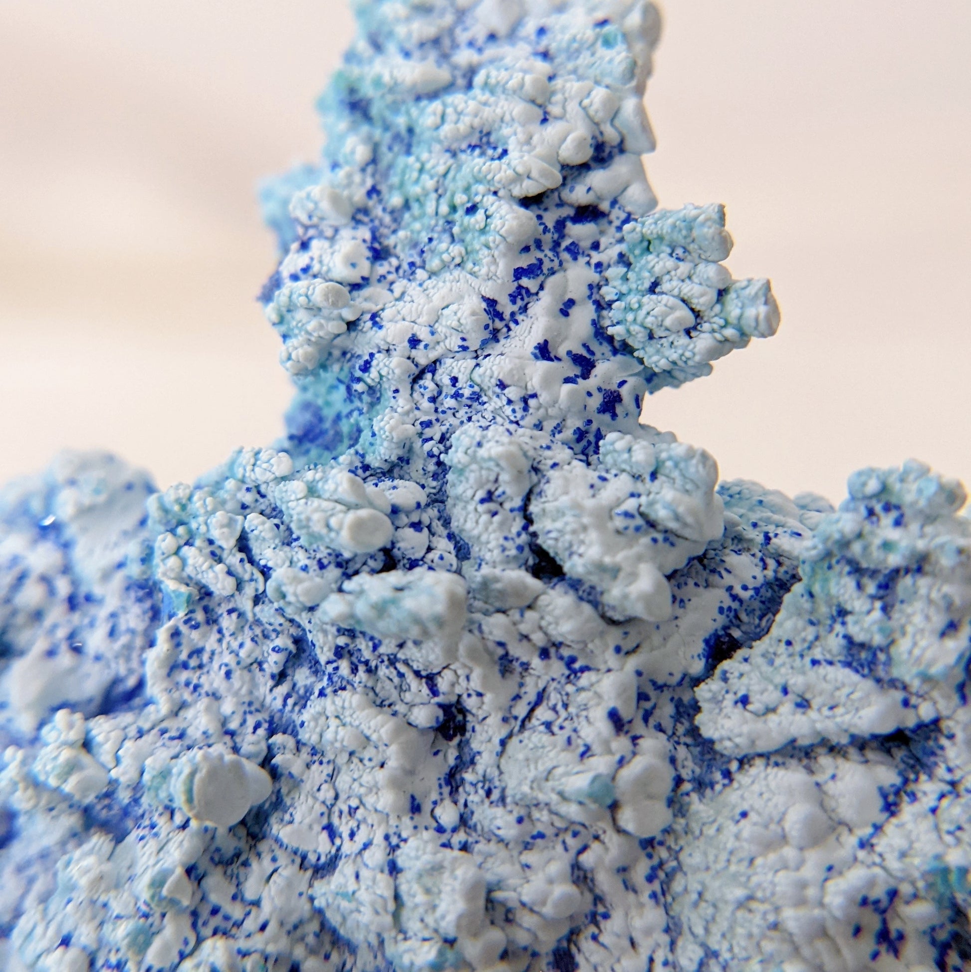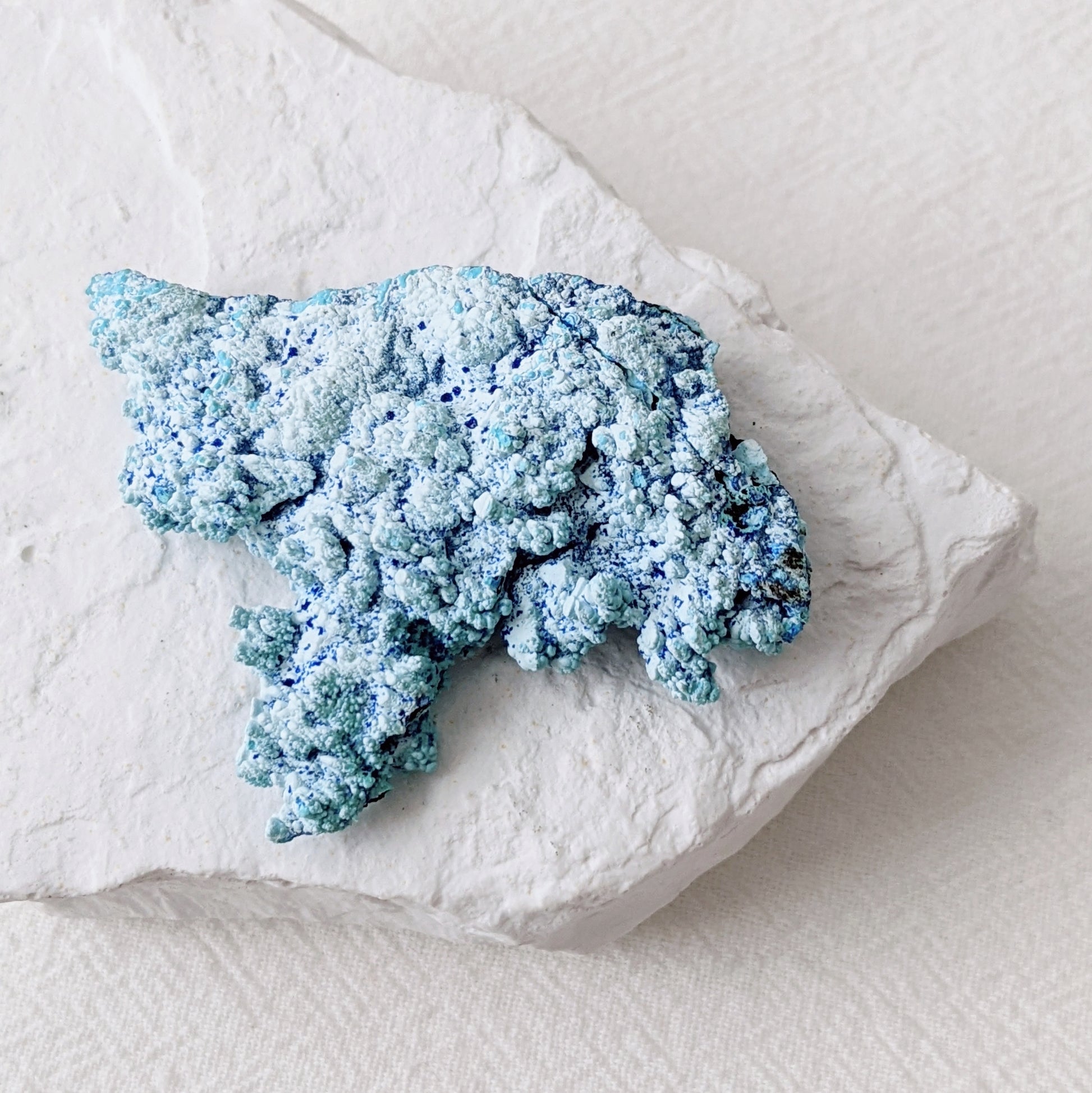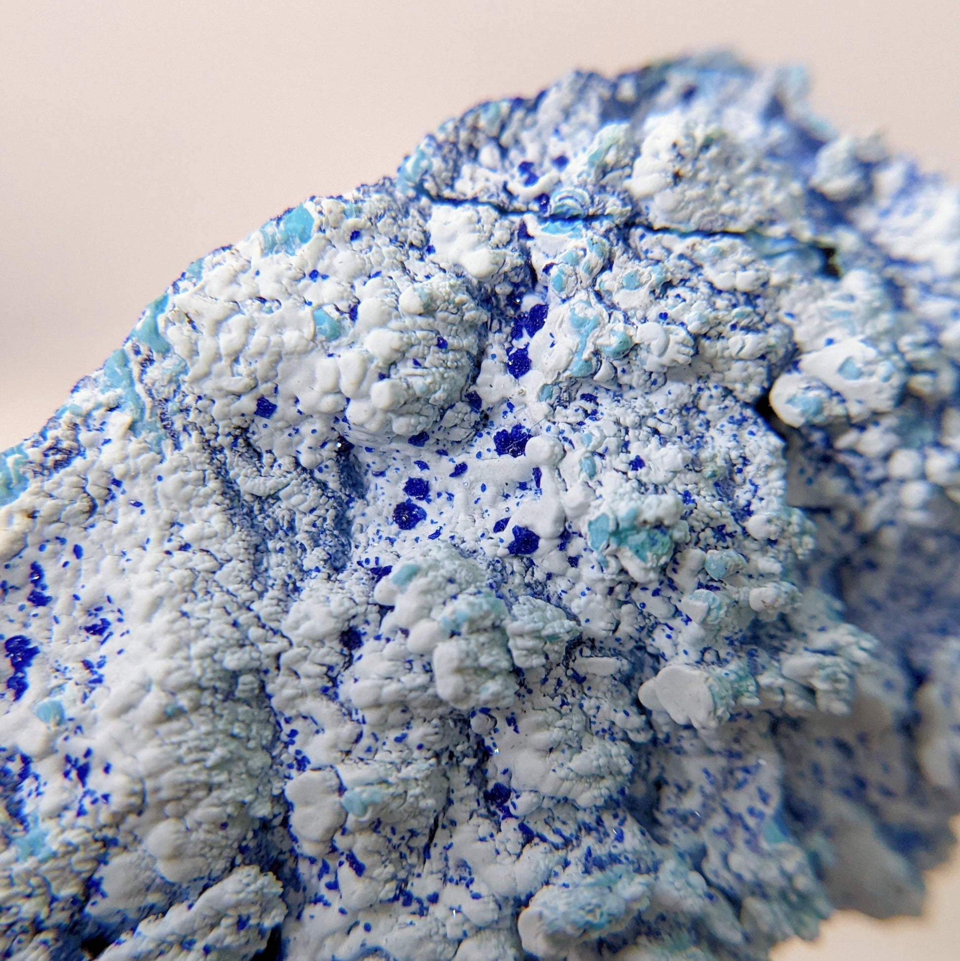 三水鋁是鋁的氫氧化物,晶體細小,顏色有白色、灰色、淺綠、粉紅、淺藍等。它們一般是半透明小球球狀,有時也會不以同形態出現,這顆的特別之處是跟顆粒藍銅礦共生。三水鋁能帶來好運,也能減輕壓力,讓我們更集中在內在的平靜。