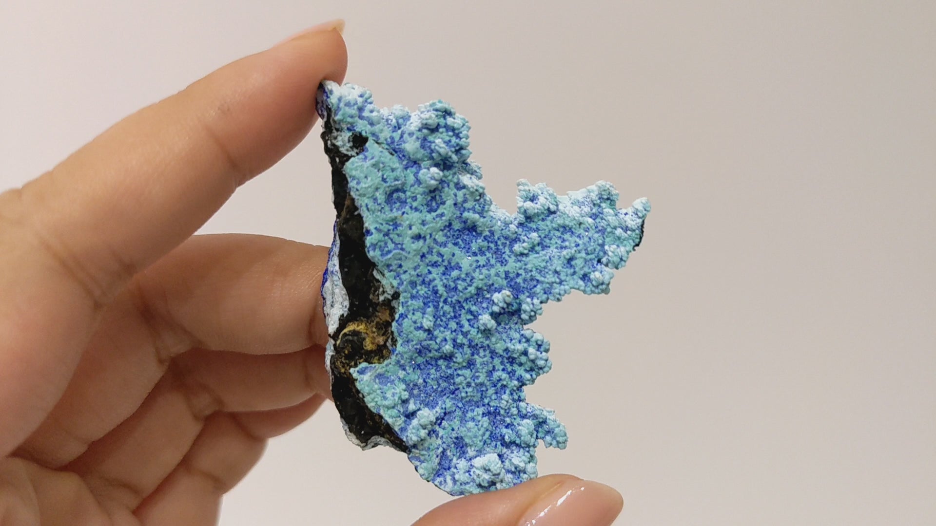 這是顆雙面的藍銅三水鋁,一邊是灑滿藍銅的湖水綠,一邊是形狀較凹凸分明的天空藍,而且是濃豔的藍銅礦,兩邊都在燈光下閃閃發光。