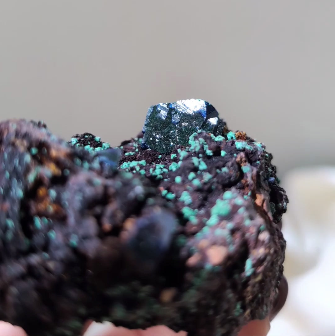 我們的藍銅礦都是精挑細選的小精品,晶體的閃亮度及完整度也是我們關注的,這顆長了幾顆晶體很大的藍銅礦十分少見,是完整片狀,旁邊是粉綠的孔雀礦是小球球狀長在啡紅的赤鐵礦上,很值得收藏。