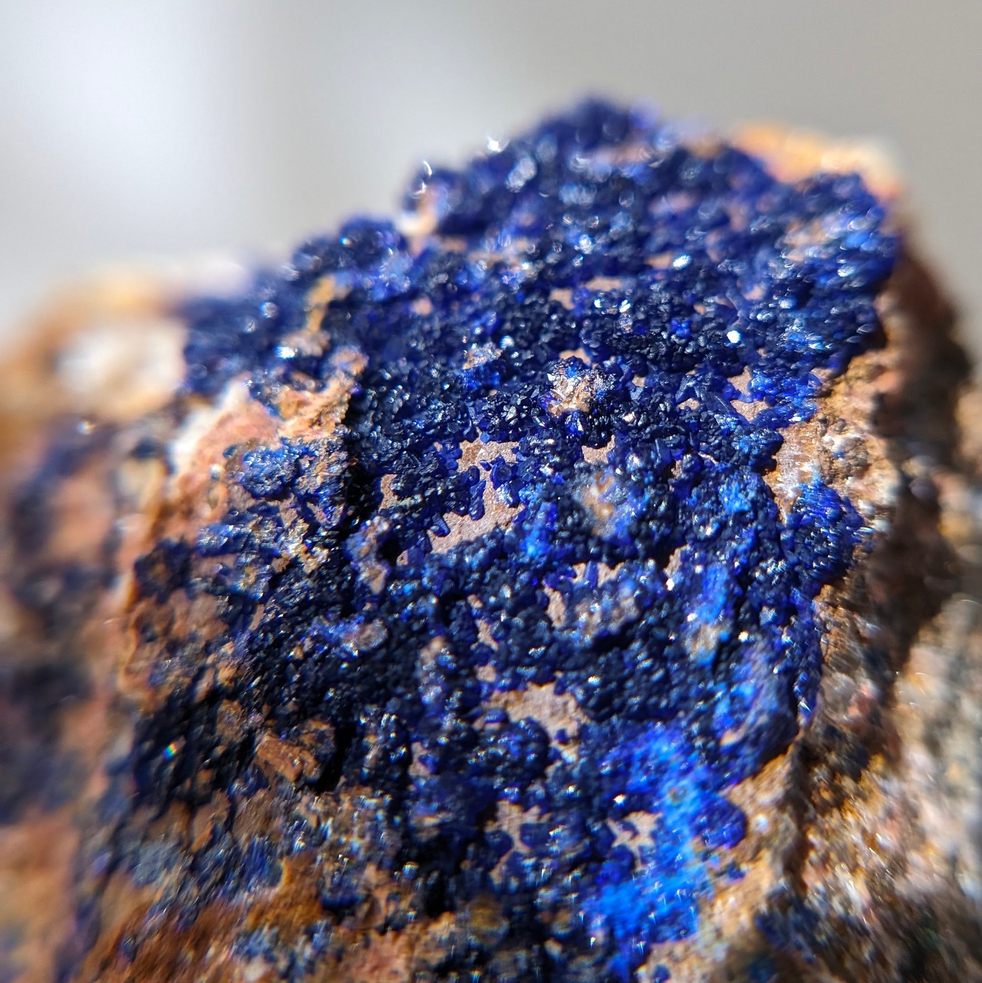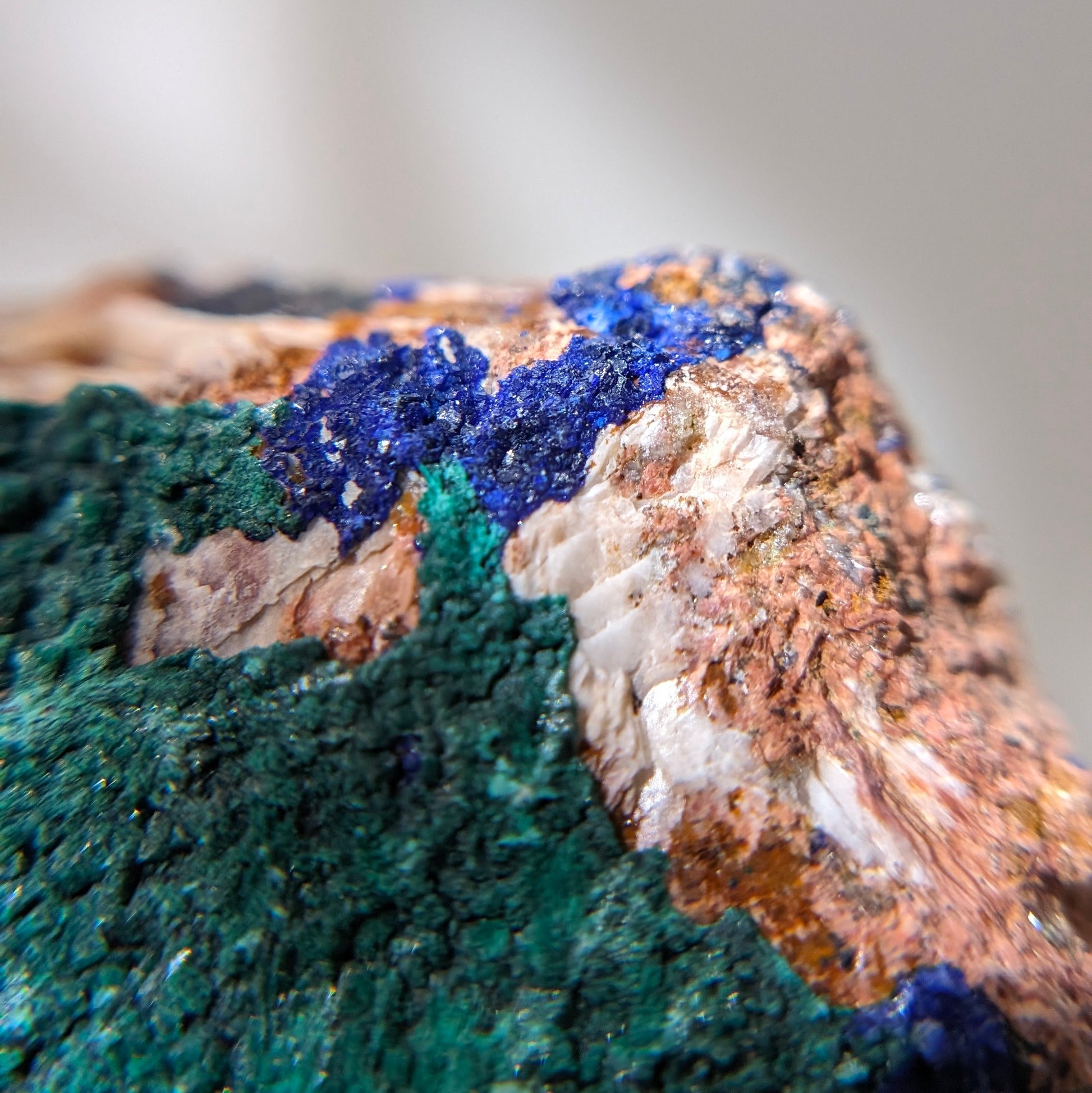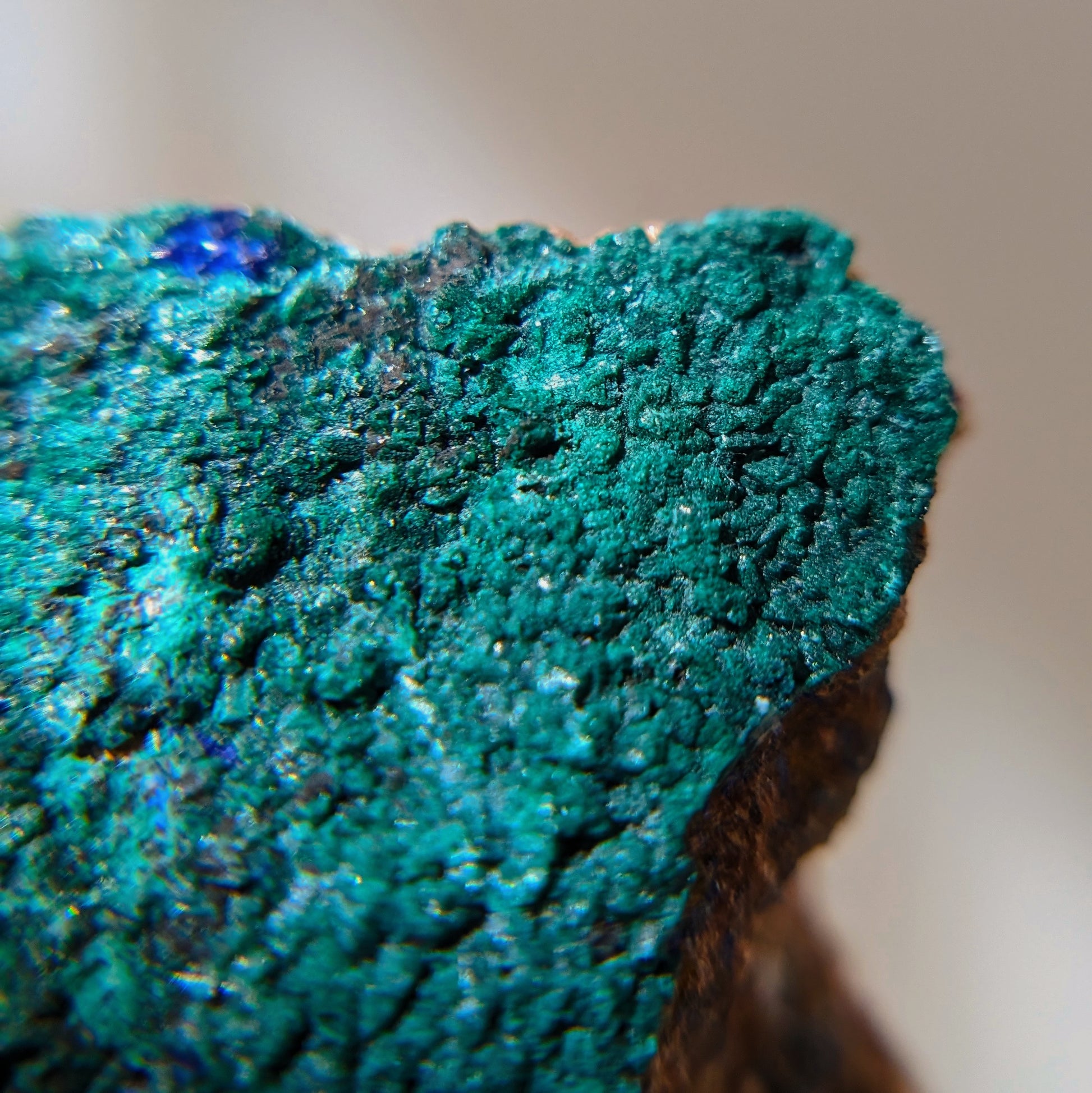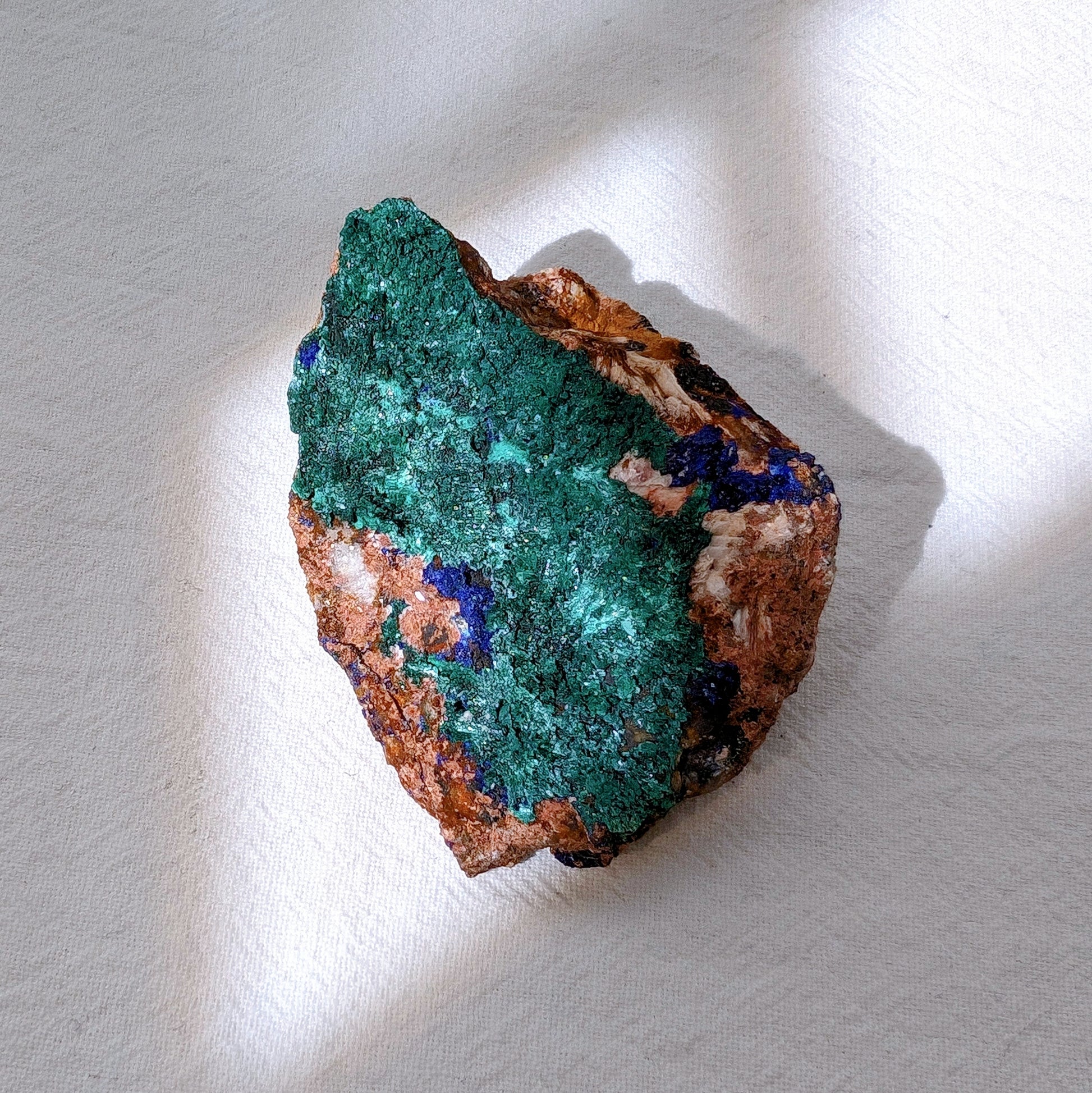 我們的藍銅礦都是精挑細選的小精品,晶體的閃亮度及完整度也是我們關注的,這顆是雙面的,一面是孔雀礦一面是藍銅礦,孔雀礦是一片絲絨狀,藍銅礦閃亮度很高,是地球色系。