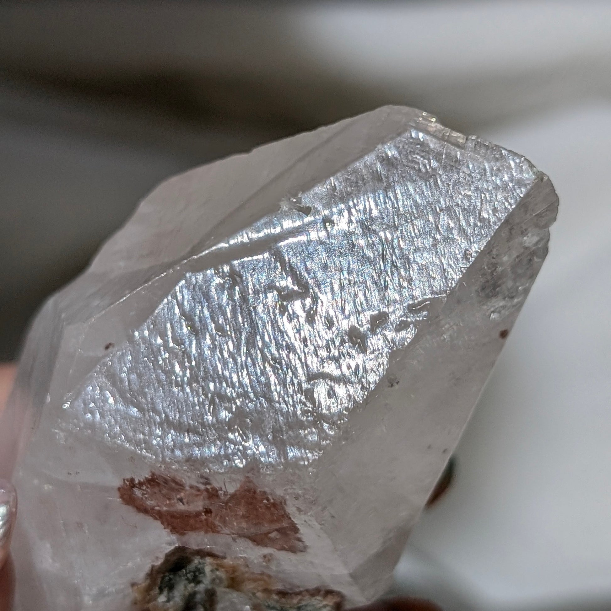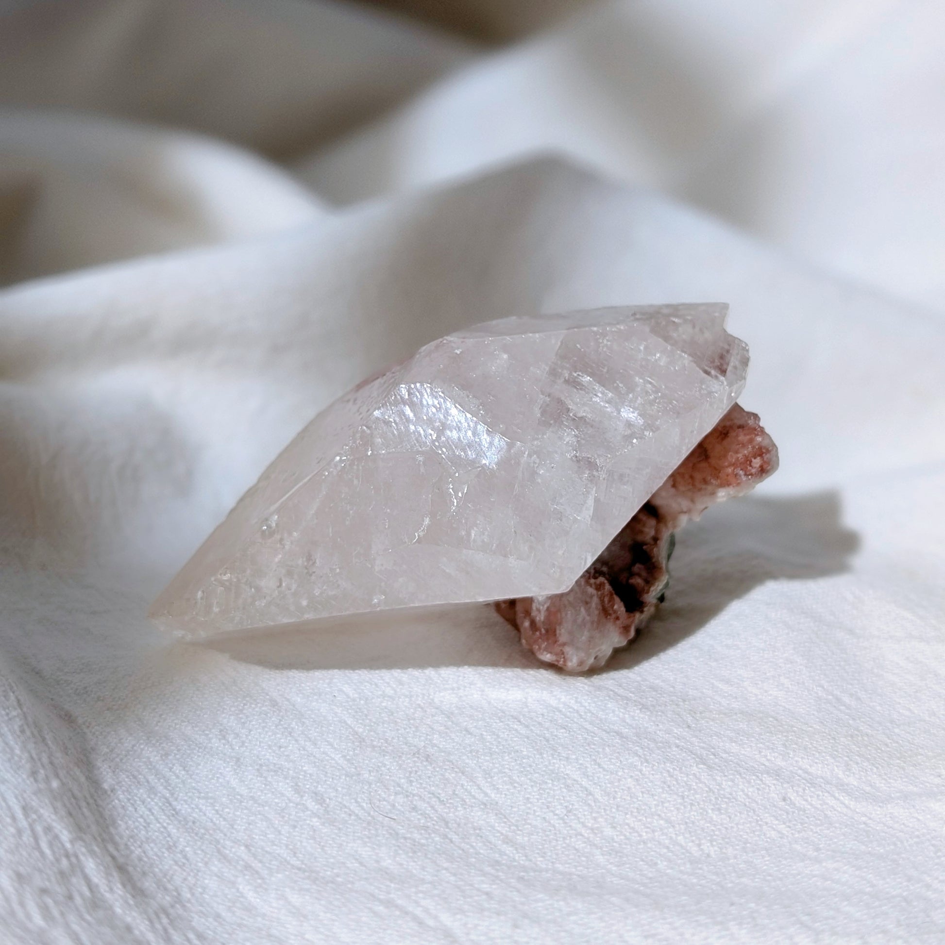 鑽石方解比較少有,照燈會有強紅色螢光,這顆是雙尖型態,也算透亮完整,上面有清晰的生長紋,而且裡面全是彩虹🤤 有少量紅方解共生。最後的照片可看紅色螢光。