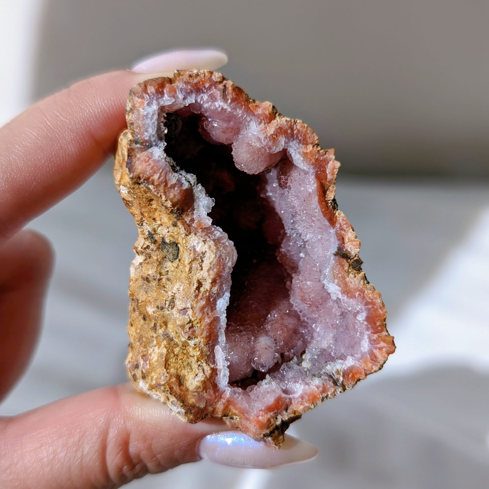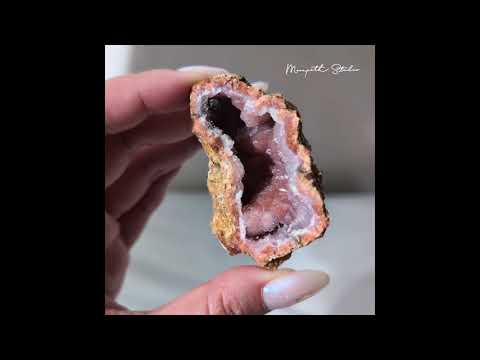 This is a rare piece of pink Chalcedony Stalactite Geode with quartz from Morocco, it's sparkly and has harmonious color combination.