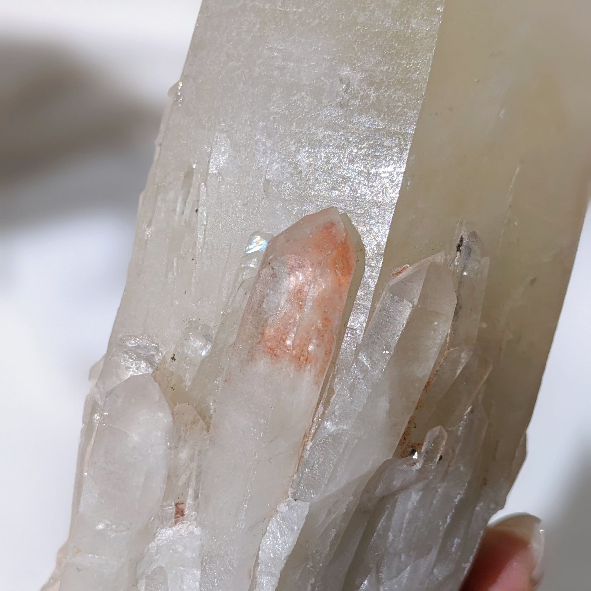 因為是全天然的無加熱處理,顏色較淺,晶體表面生長紋很好看,底部被小小的晶柱包圍,市面一般較少見這種天然的大晶體黃晶柱,這也是一顆資料庫水晶。