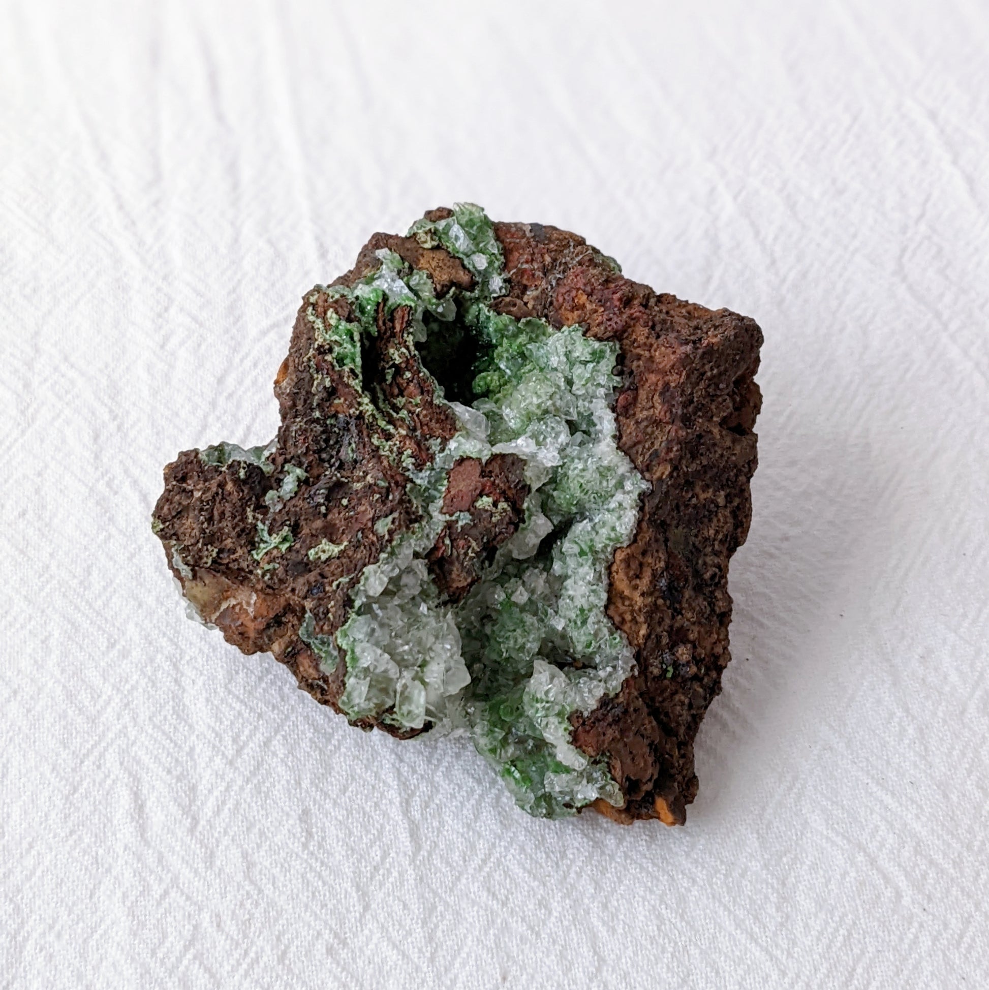 這是市面上比較少有而且品質較好的砷銅鈣石,之前已賣了好幾顆,方解石長在綠色的砷銅鈣石上,有一部份被包裹,方解石在uv燈下是藍色螢光。