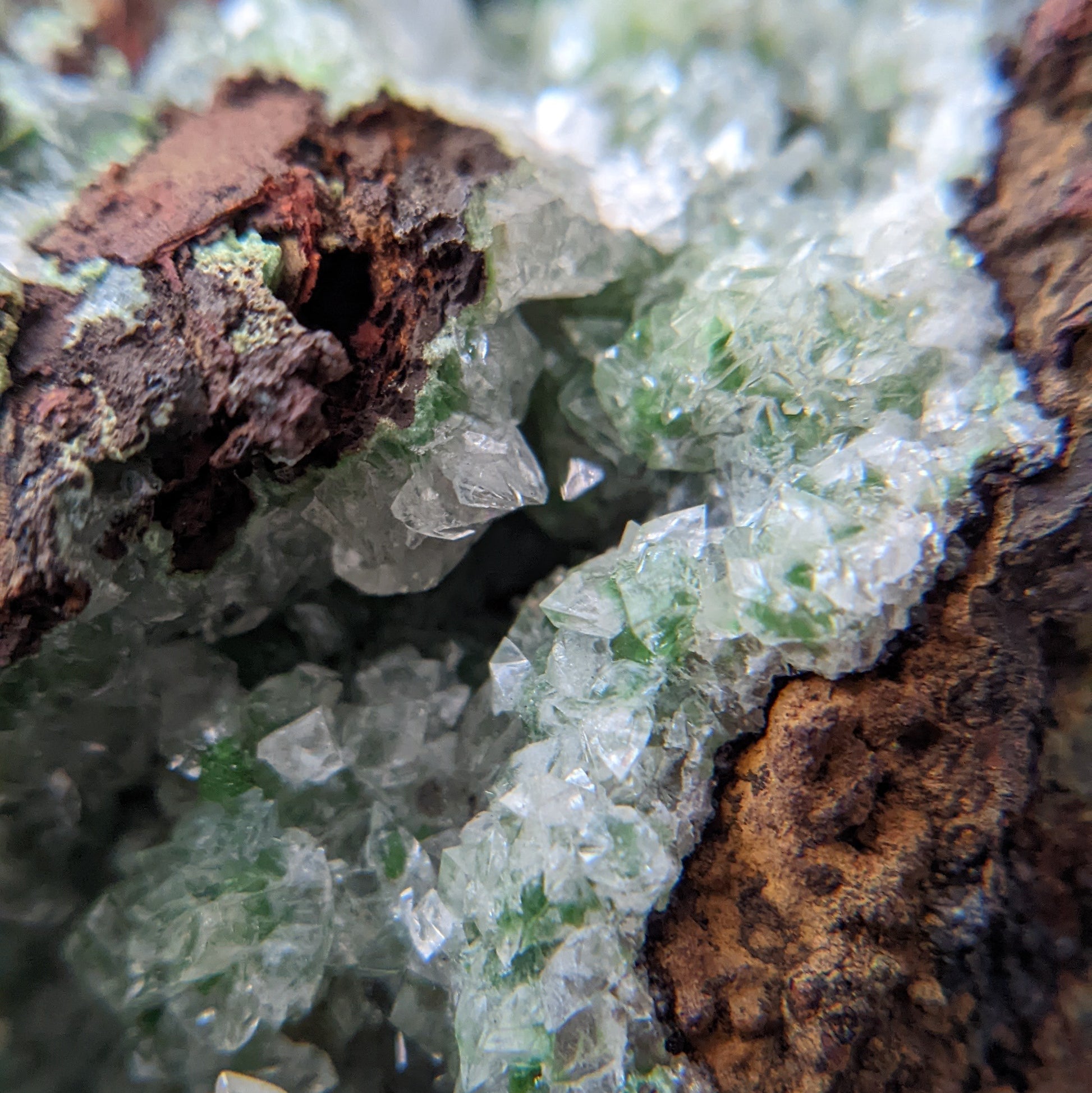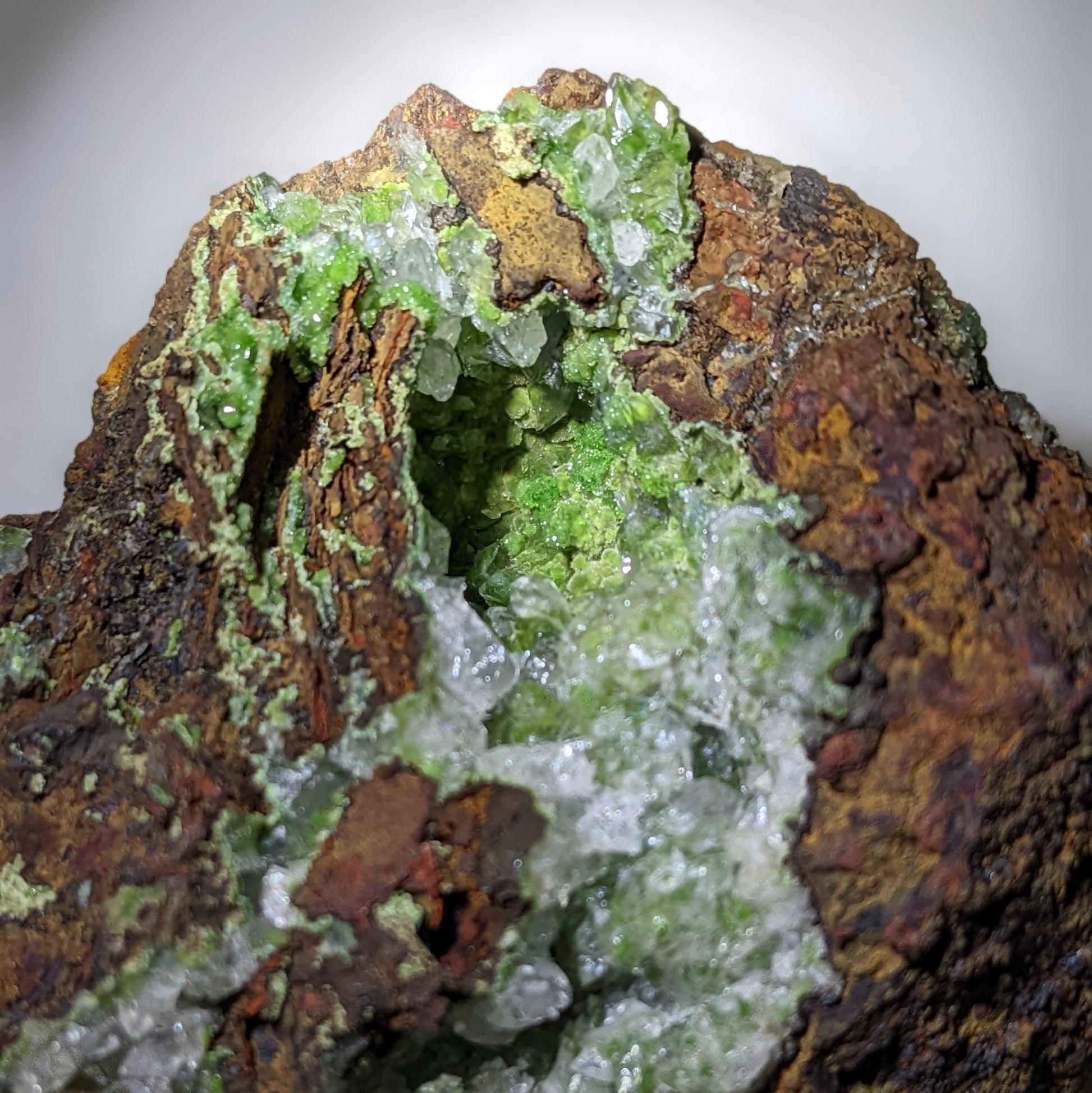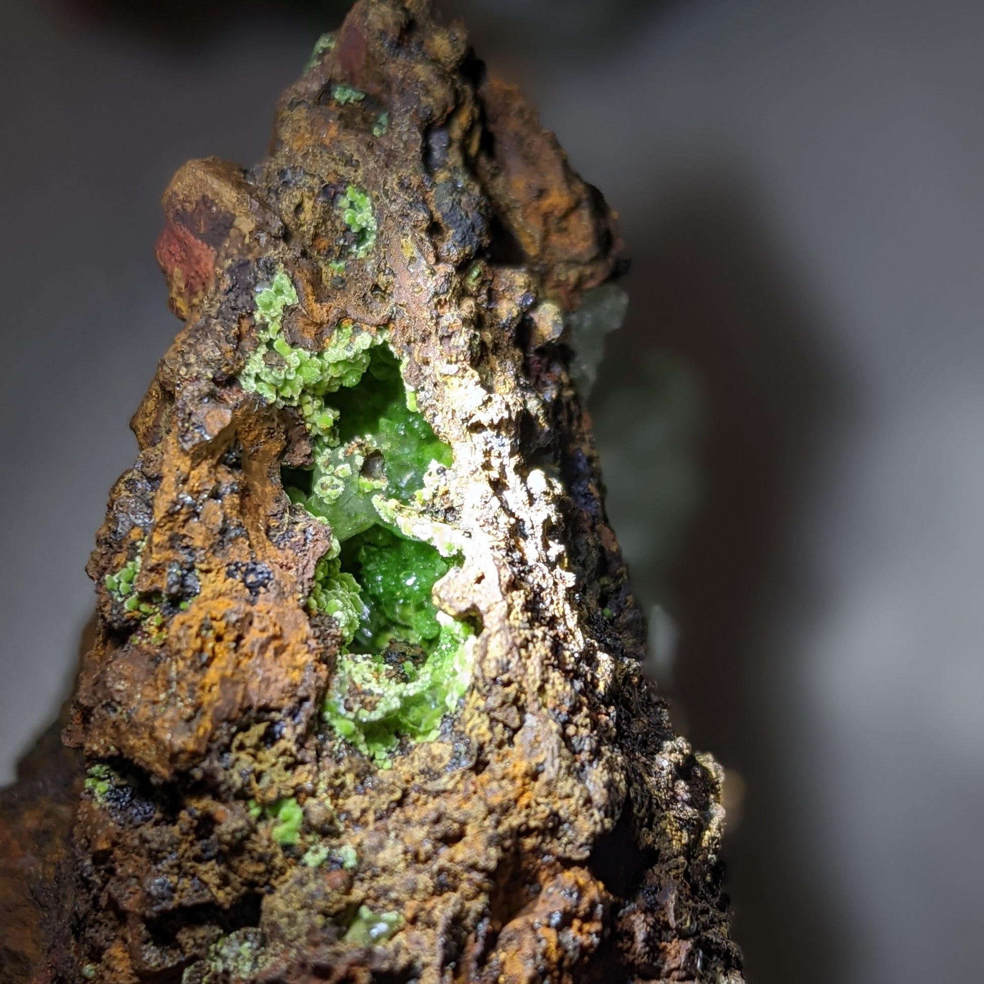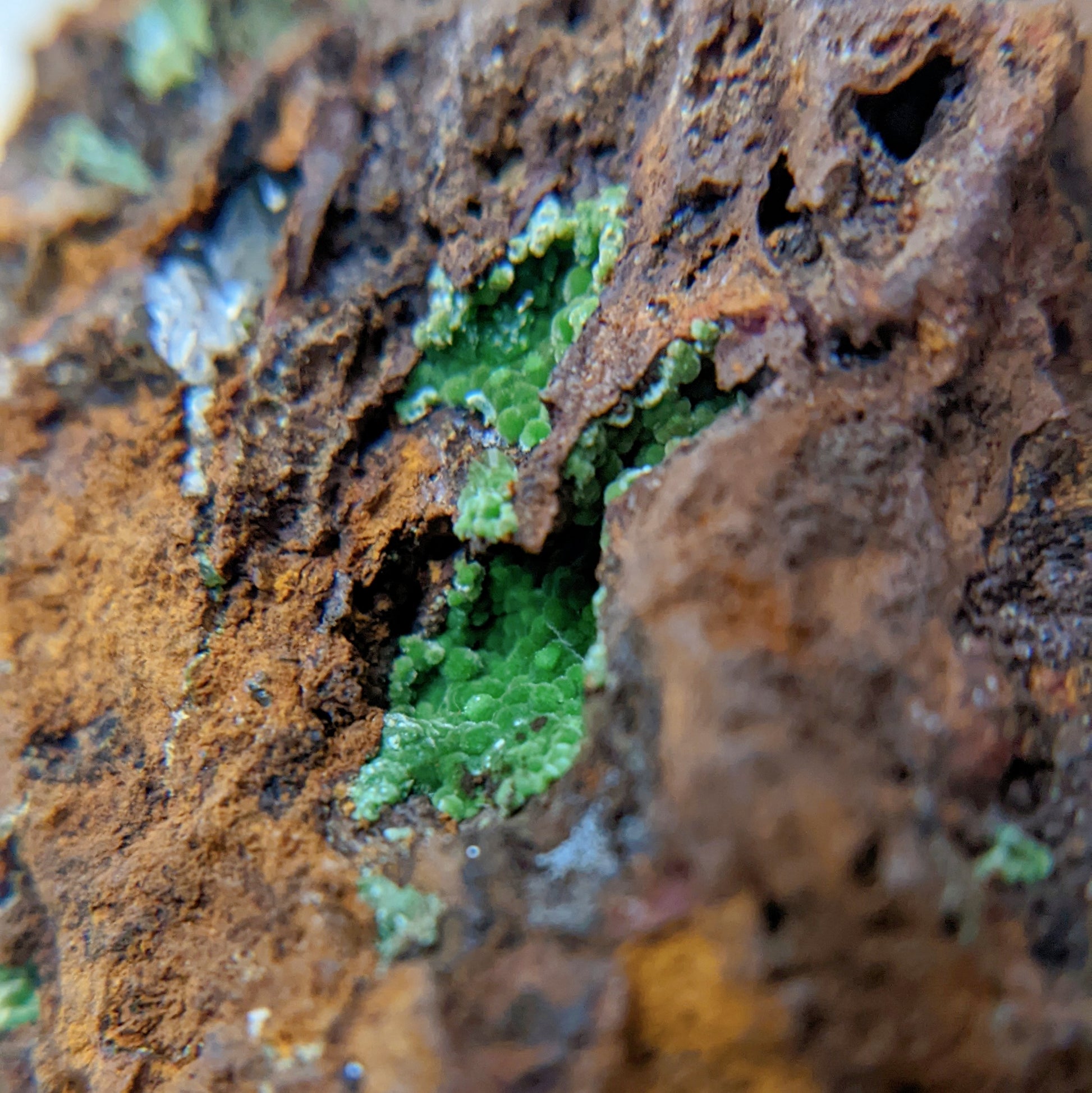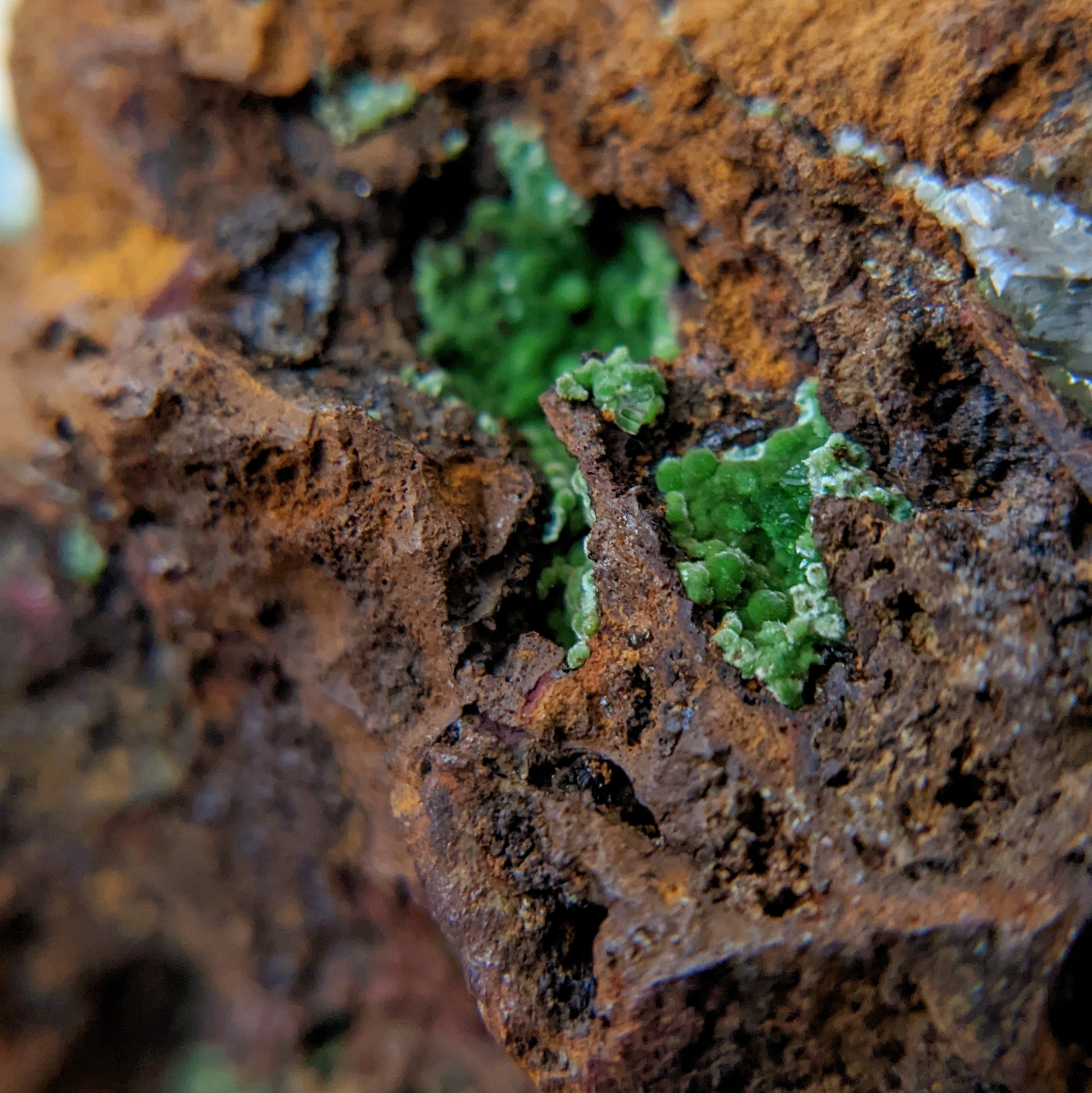 Rare found mineral specimen, calcite is uv reactive. Shiny calcite on Conichalcite matrix.