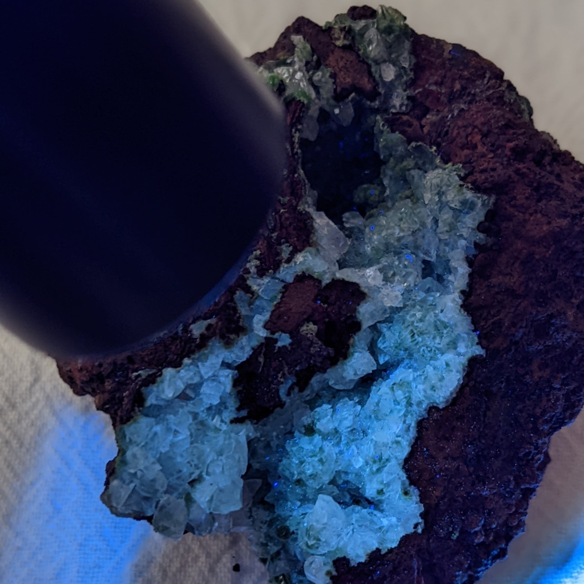 Conichalcite in Calcite • 方解石包裹砷銅鈣石(藍色螢光方解石)