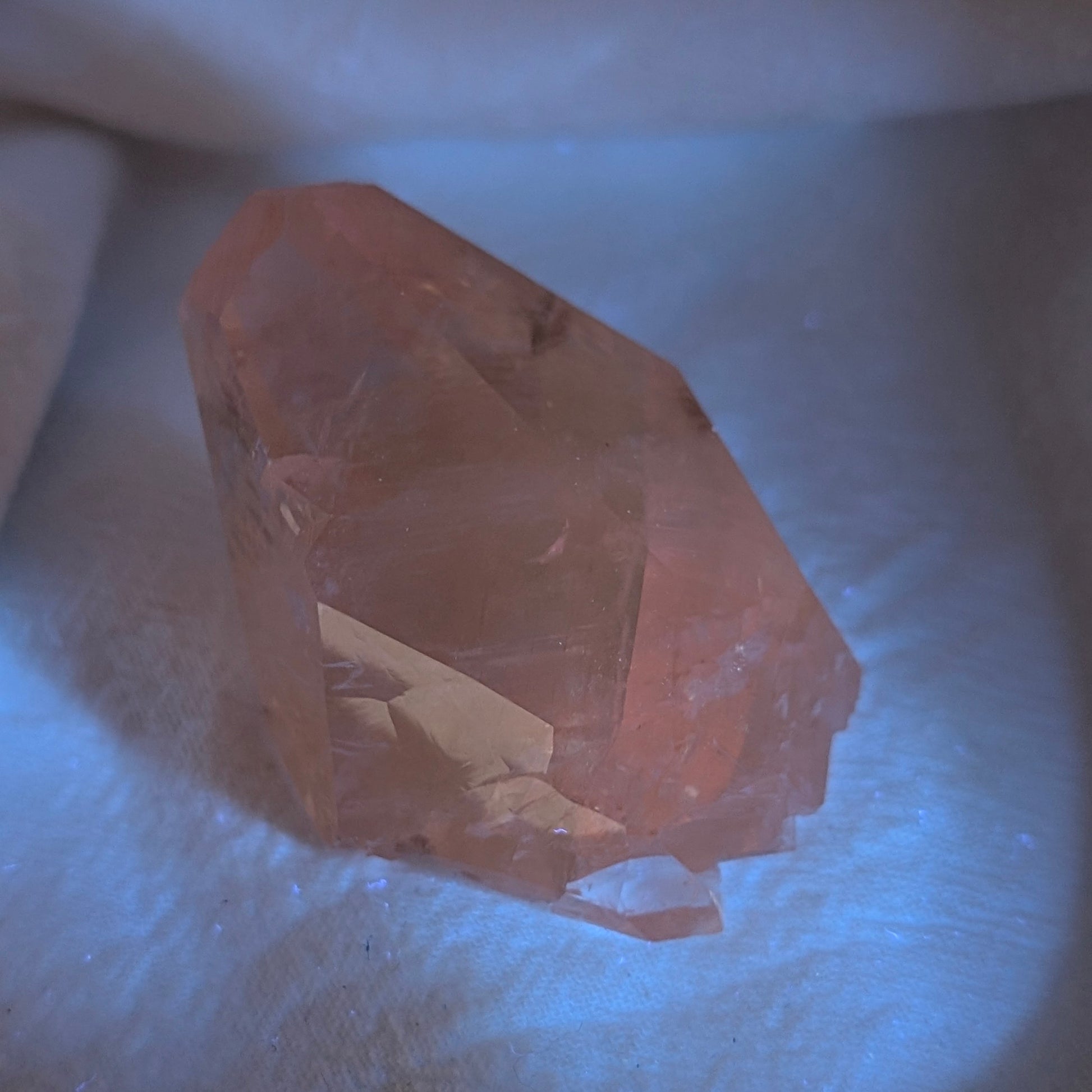 這種清透度的鑽石方解比較少有,照燈會有強紅色螢光,這顆十分透亮完整,上面有清晰的生長紋,而且裡面全是彩虹,超美的。最後的照片可看紅色螢光。