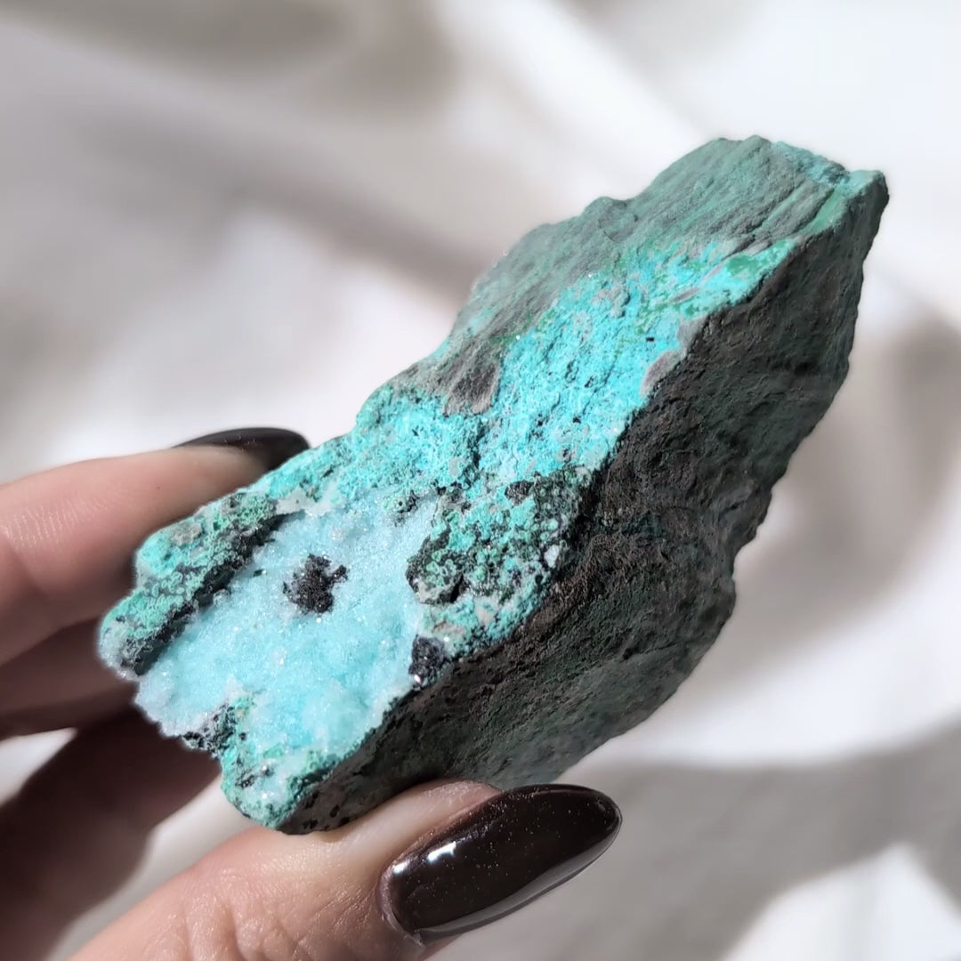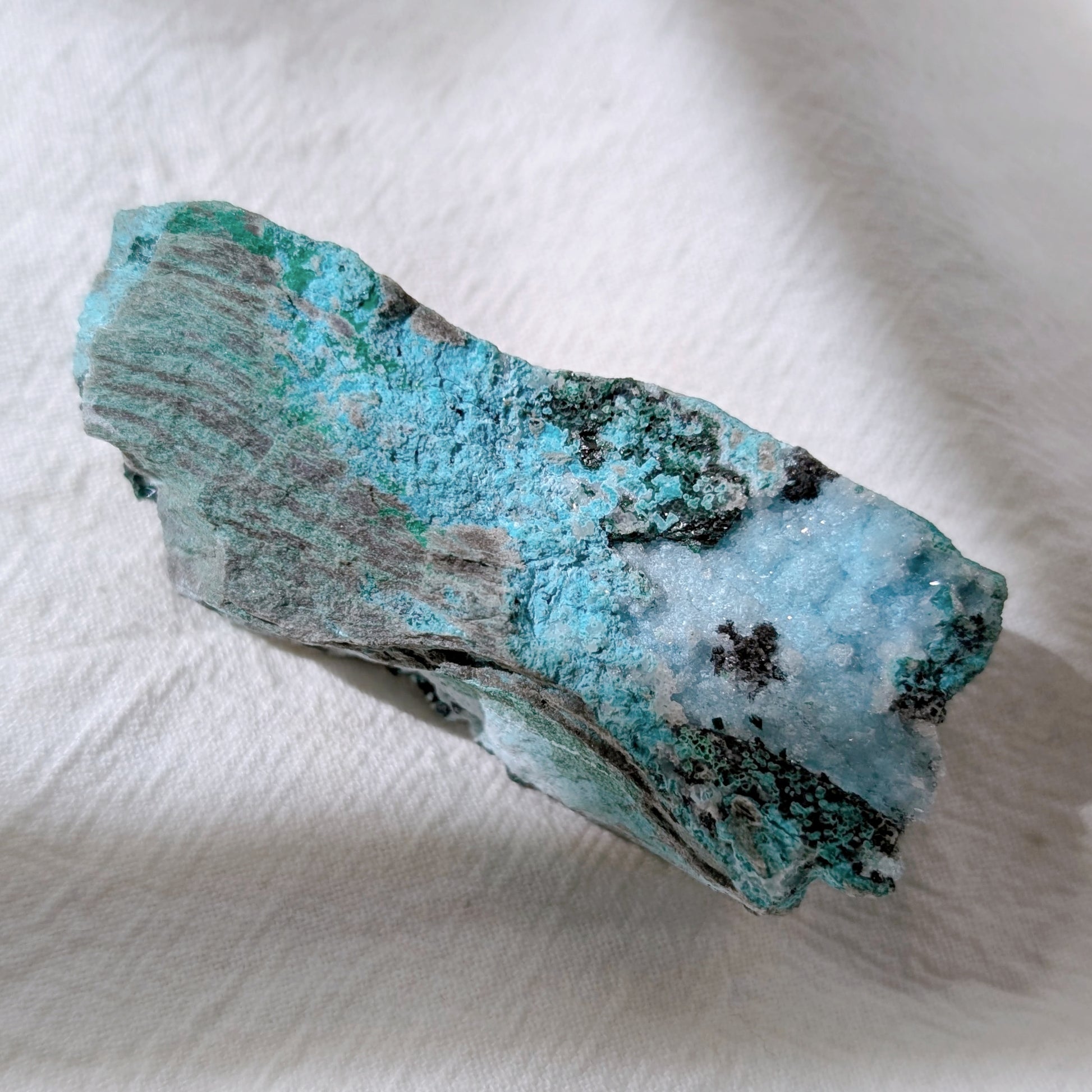 這硅孔雀石有少量孔雀礦及共生,表面是閃閃的石英二次結晶覆蓋著,非常好看。