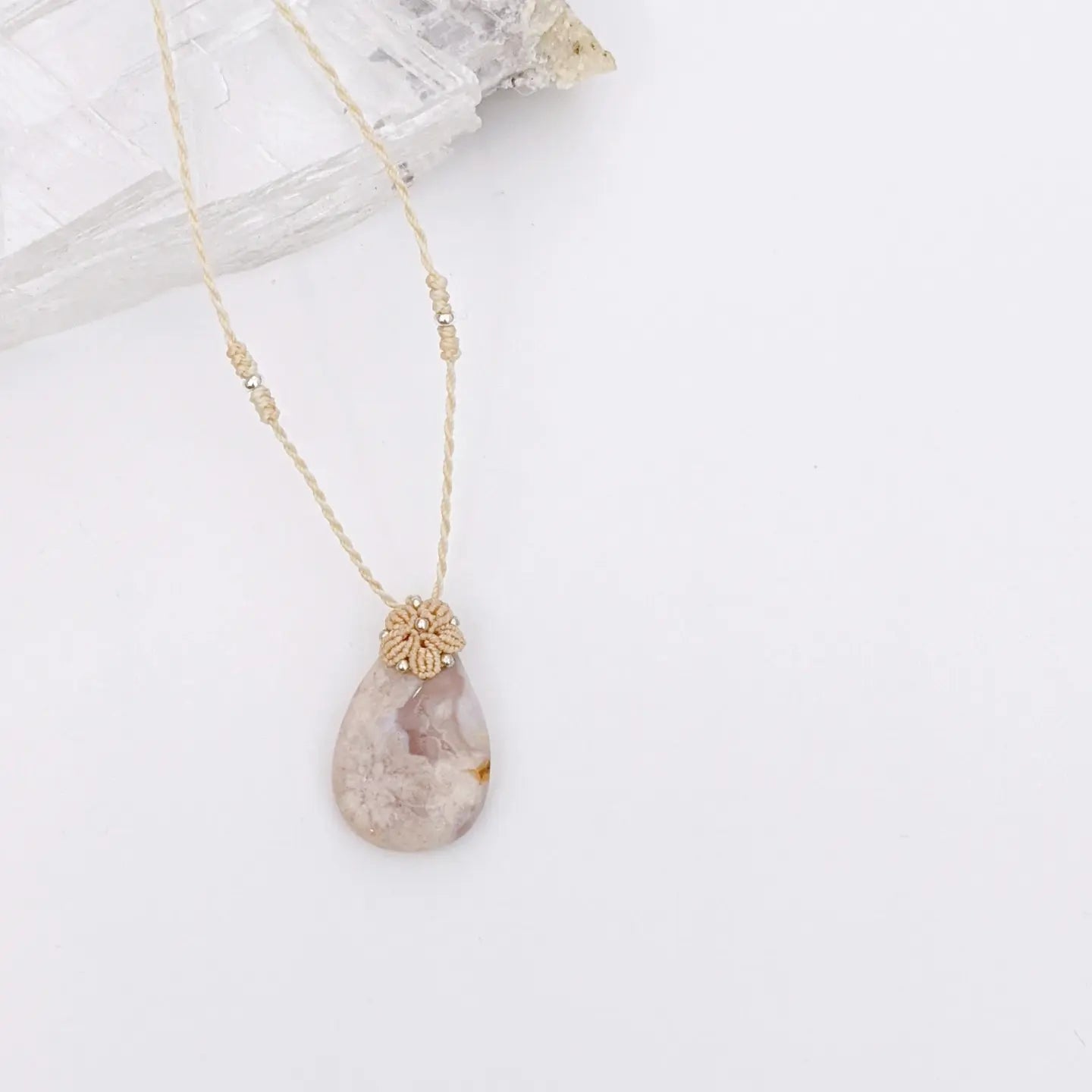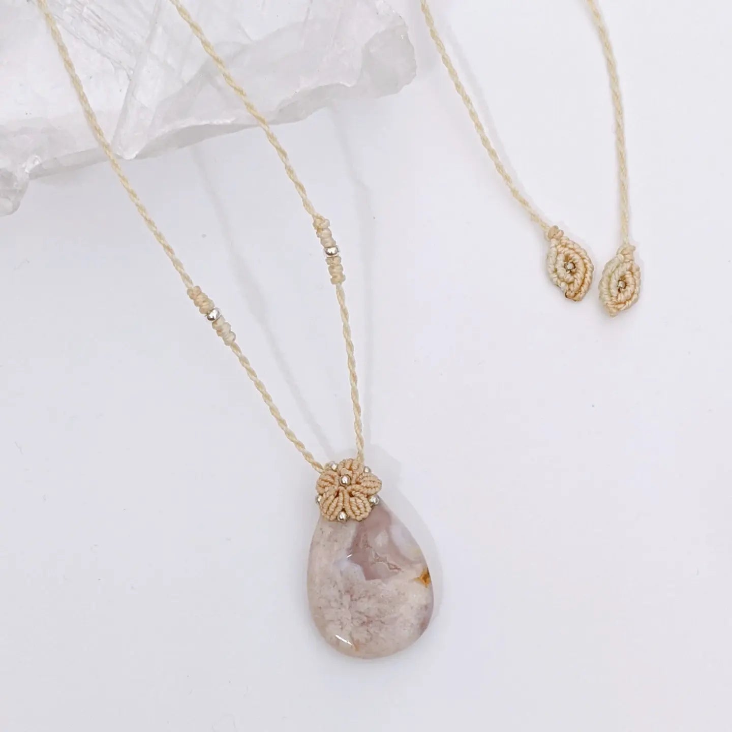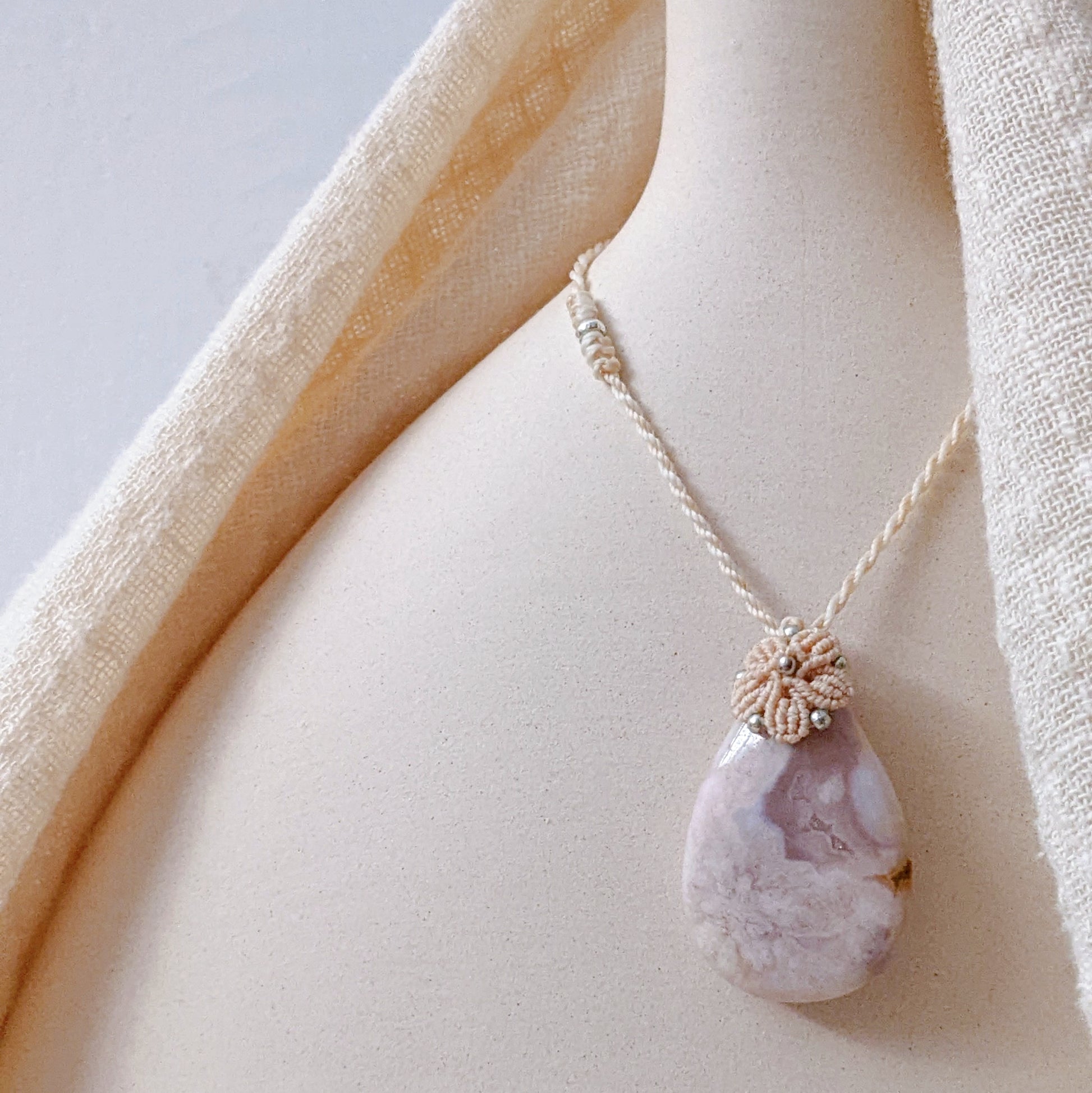 Flower Agate Pendant Macrame Long Necklace 櫻花瑪瑙吊咀編織長頸鍊