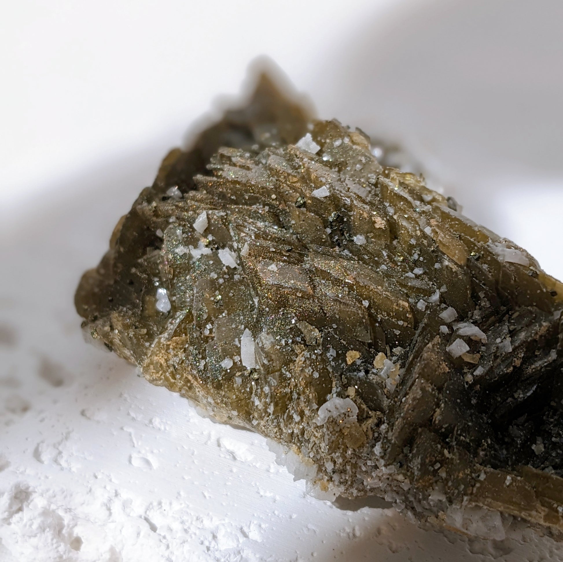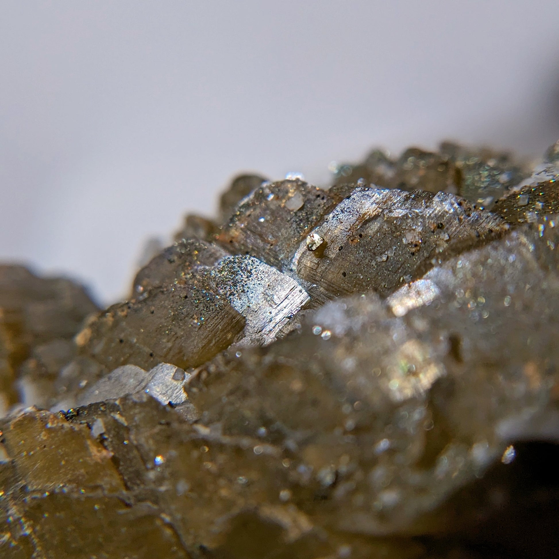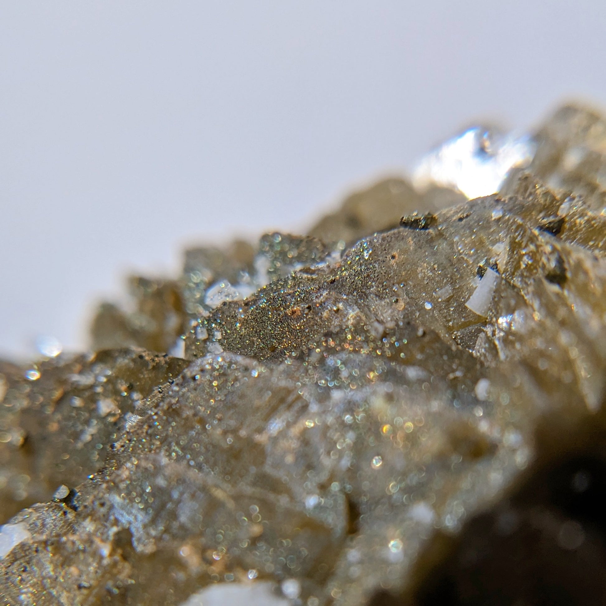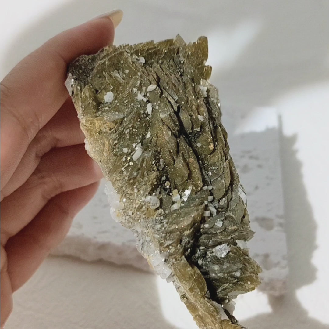 這是好久不見的菱鐵礦,是跟白雲石及閃閃的硫鐵礦共生,影片是陽光下的效果。這顆共生的品相很特別,具有收藏價值。菱鐵礦代表正念,它可以刺激我們的正面思維及幫助我們思考有建設性的主意。菱鐵礦能平衡及校準我們的脈輪,也能幫我們接地氣。