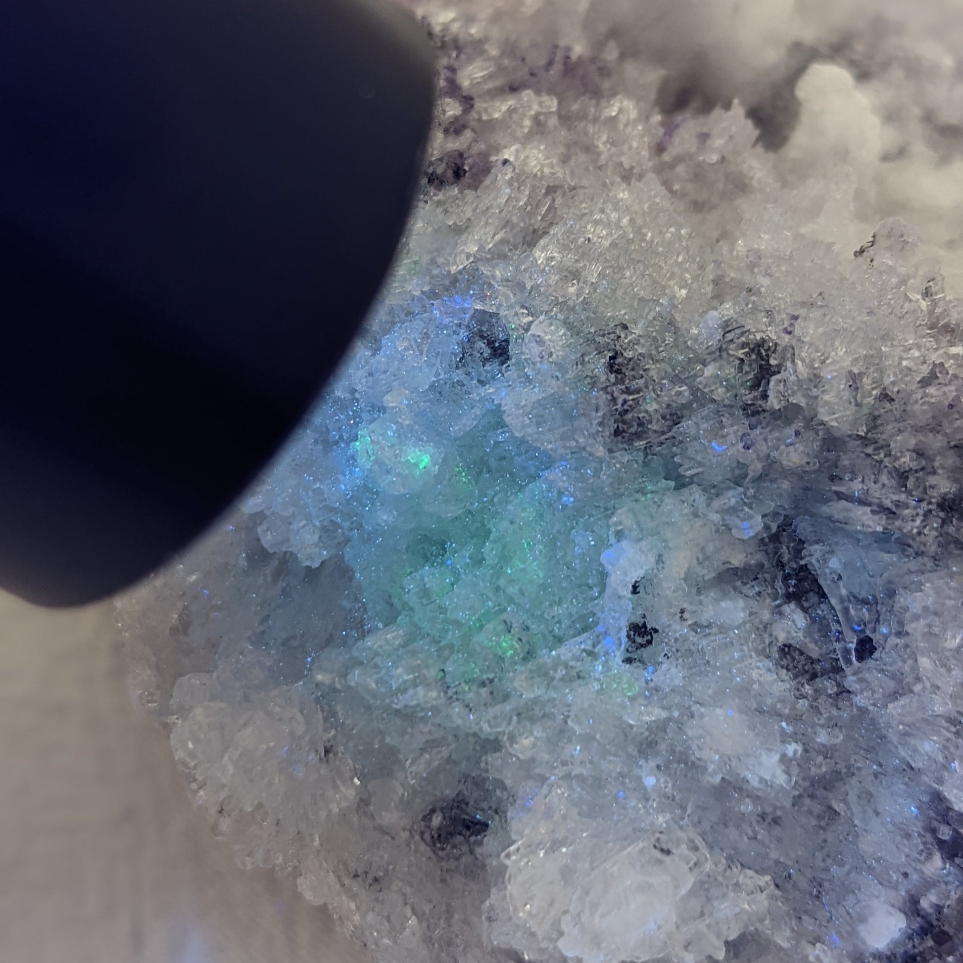 這顆氟鋁石膏是顏色是淡粉紫,整片母岩上長滿氟鋁石膏,晶體表面也有一些深紫色礦物共生,中間是一顆白色的,光線下閃閃發亮。氟鋁石膏下層的是玉滴石在uv燈下是綠色螢光,而且它的底部也有氟鋁石膏覆蓋。
