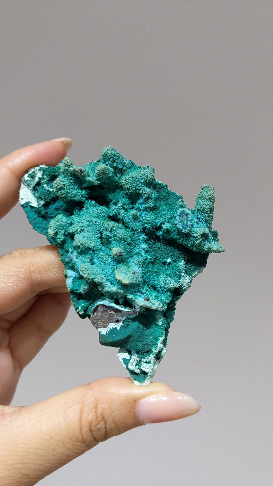 這硅孔雀石是比較少見的樹枝纖維狀,看上去像一個水底世界的珊瑚小樹林,燈光下能看到衪表面有一層閃閃的。