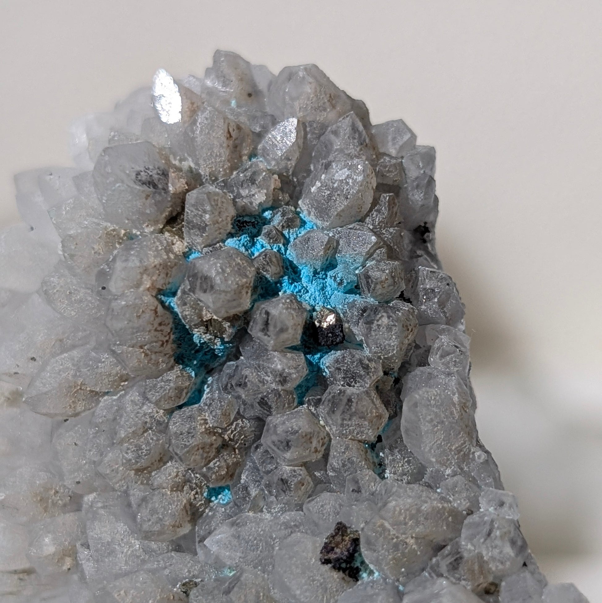 這矽孔雀石跟白水晶及黃鐵礦共生,是很漂亮的淺藍灰白配搭,非常好看。