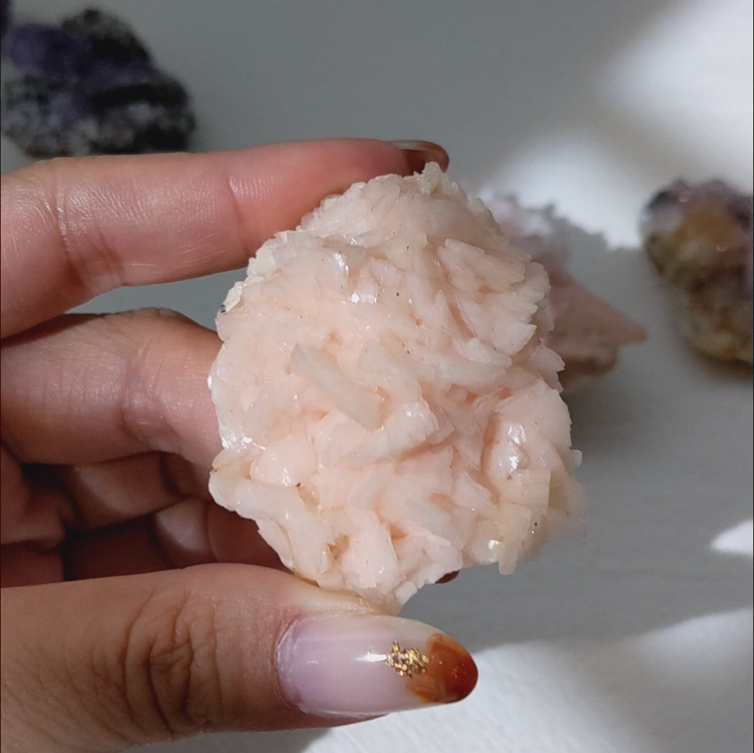 這種粉色雲石很少遇到,實物是粉粉嫩嫩的蝦肉色,而且是亮面,可以看到每塊晶體上的生長情況。上面的小啡點是黃鐵礦共生。雲石有很強的保護力,它可以為我們的空間平衡能量。它對於睡眠也很有幫助,特別是經常失眠或發惡夢的人士。它能使我們保持樂觀及激發我們的創意。它會打開我們的心輪把愛帶到我們的生命中。