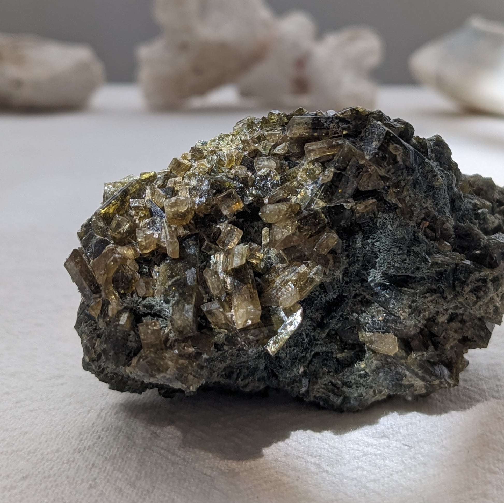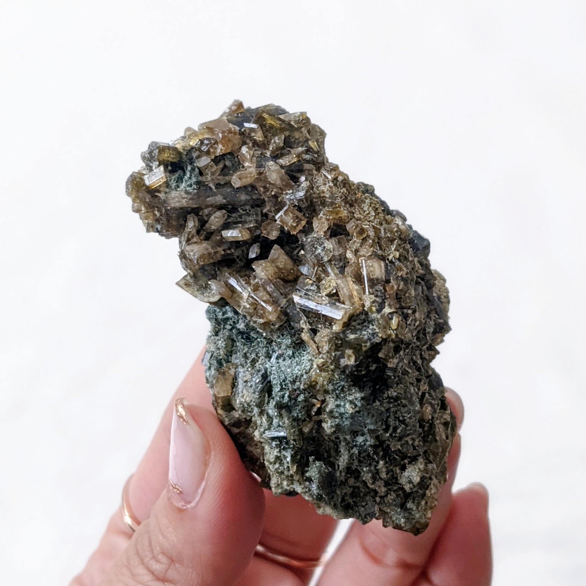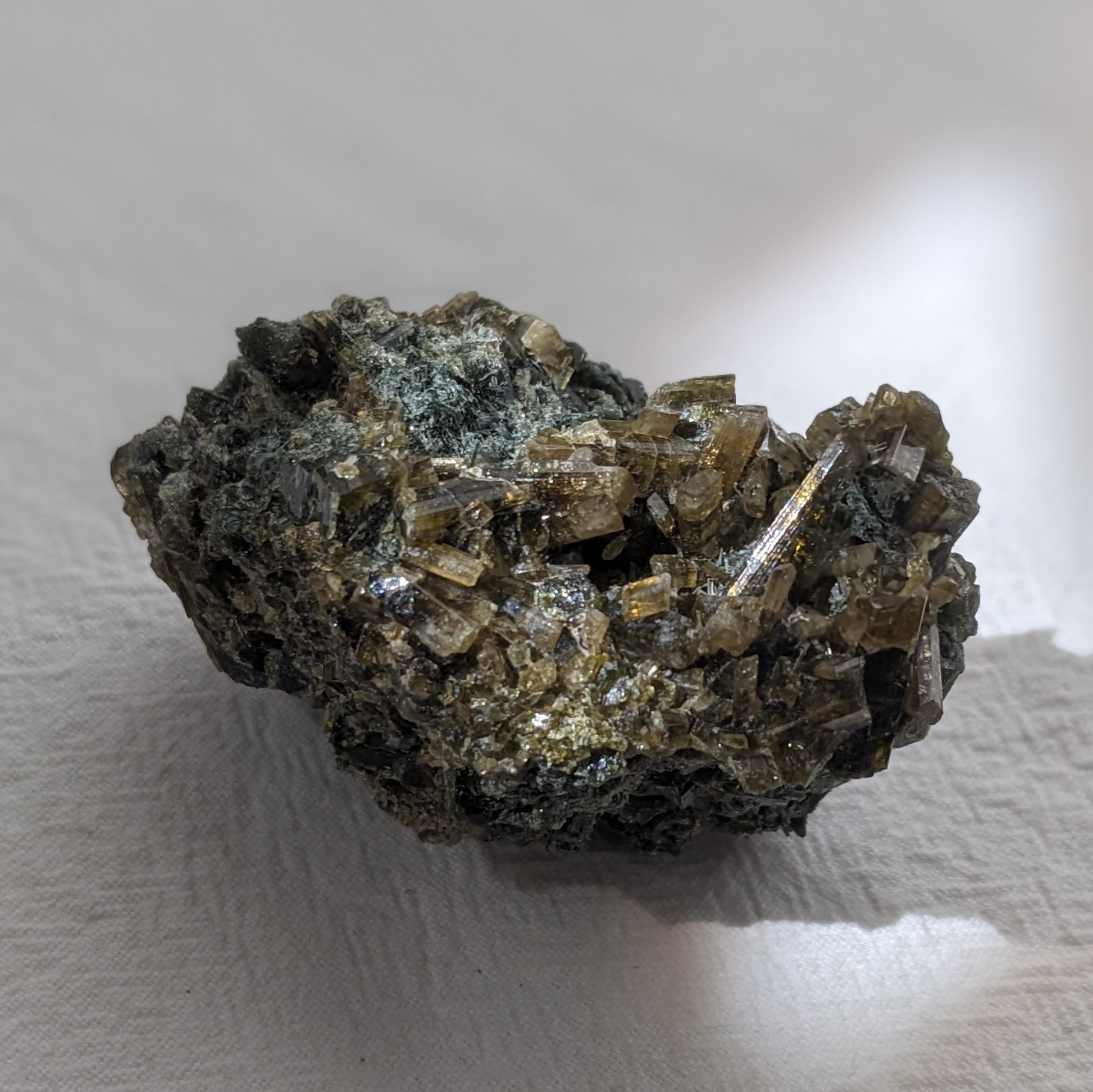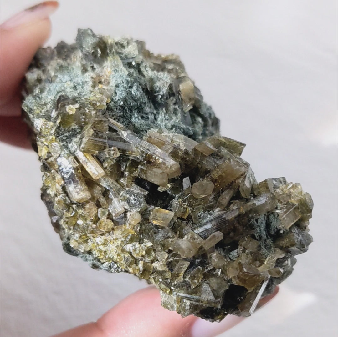 Epidote belongs to the Epidote group of minerals which is formed by calcium aluminium iron silicate hydroxide. It can increase our energy levels and it can strengthen our physical body. It's helpful for stamina, the nervous and immune system. It helps us reduce self criticism, and teaches us to set goals. It assists us to overcome our failures, and releases old patterns of negativity. It encourages optimism, and clears blockages in our physical body. It brings spiritual growth, and raises our vibrations.