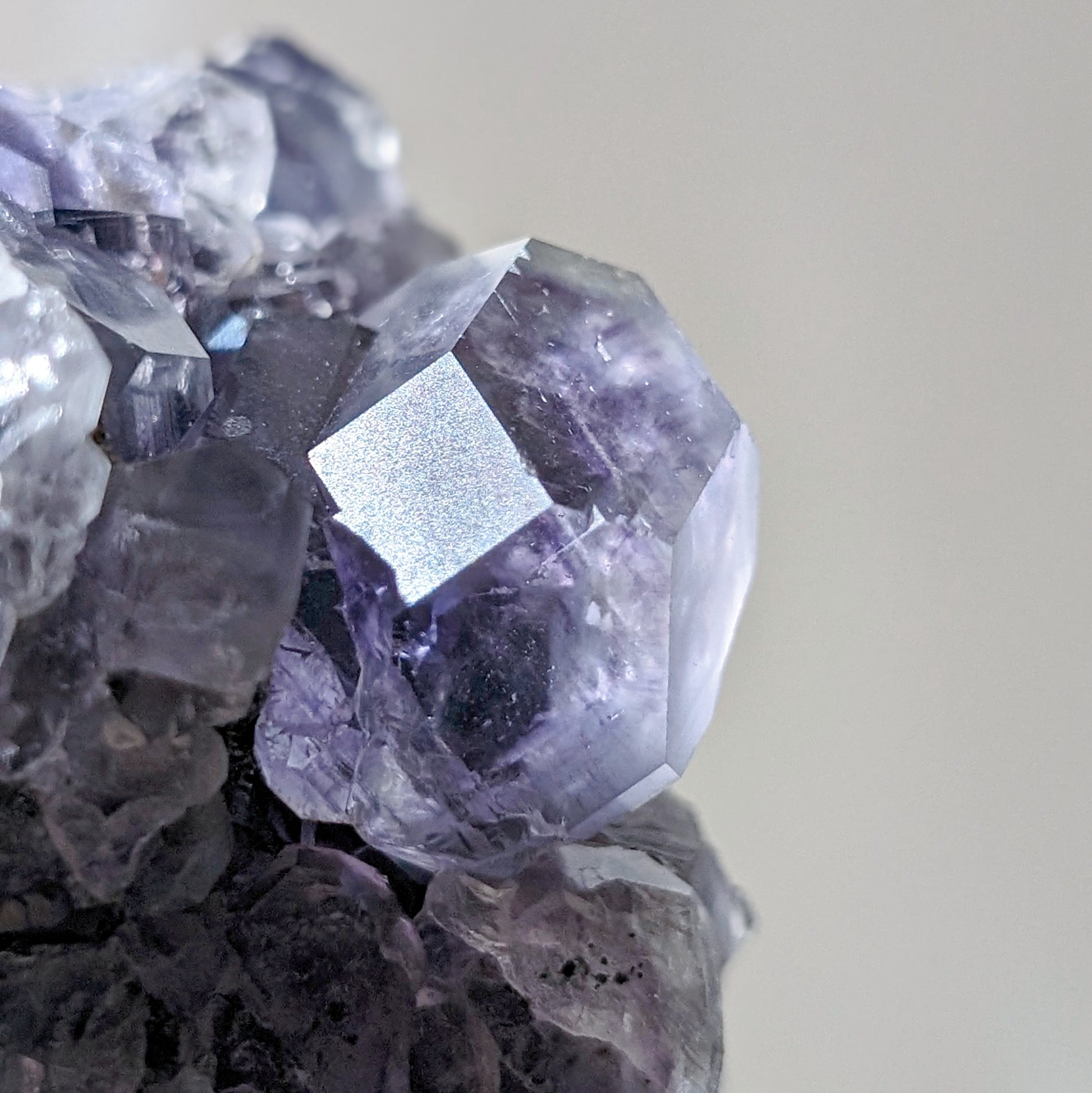 這顆坦桑藍帶有一點monotone的色系,底岩是冷灰色,中間最大的晶體是清晰的立方體。