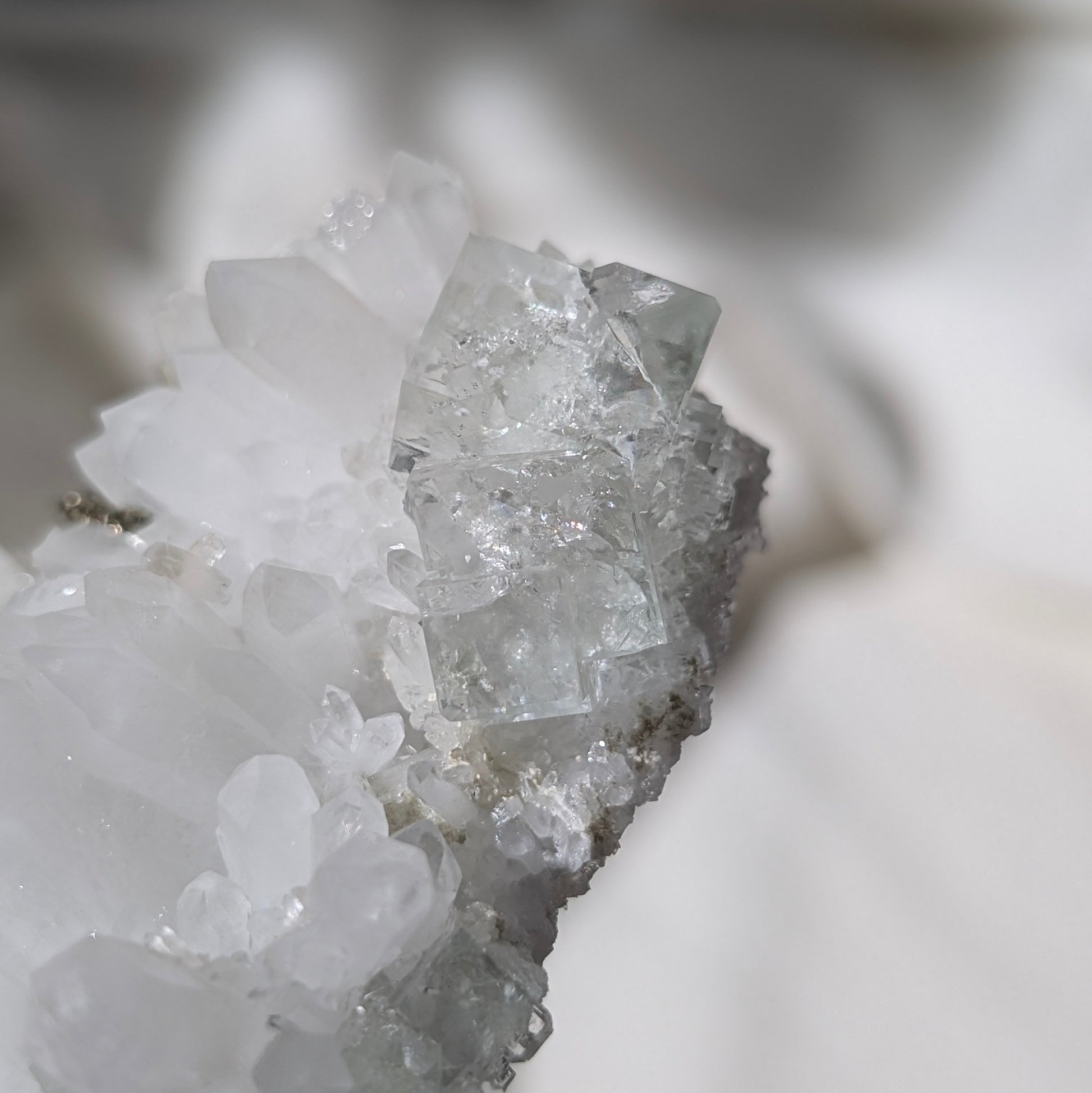 這顆香花嶺玻璃體型石晶體算完整而且裏面帶彩虹。