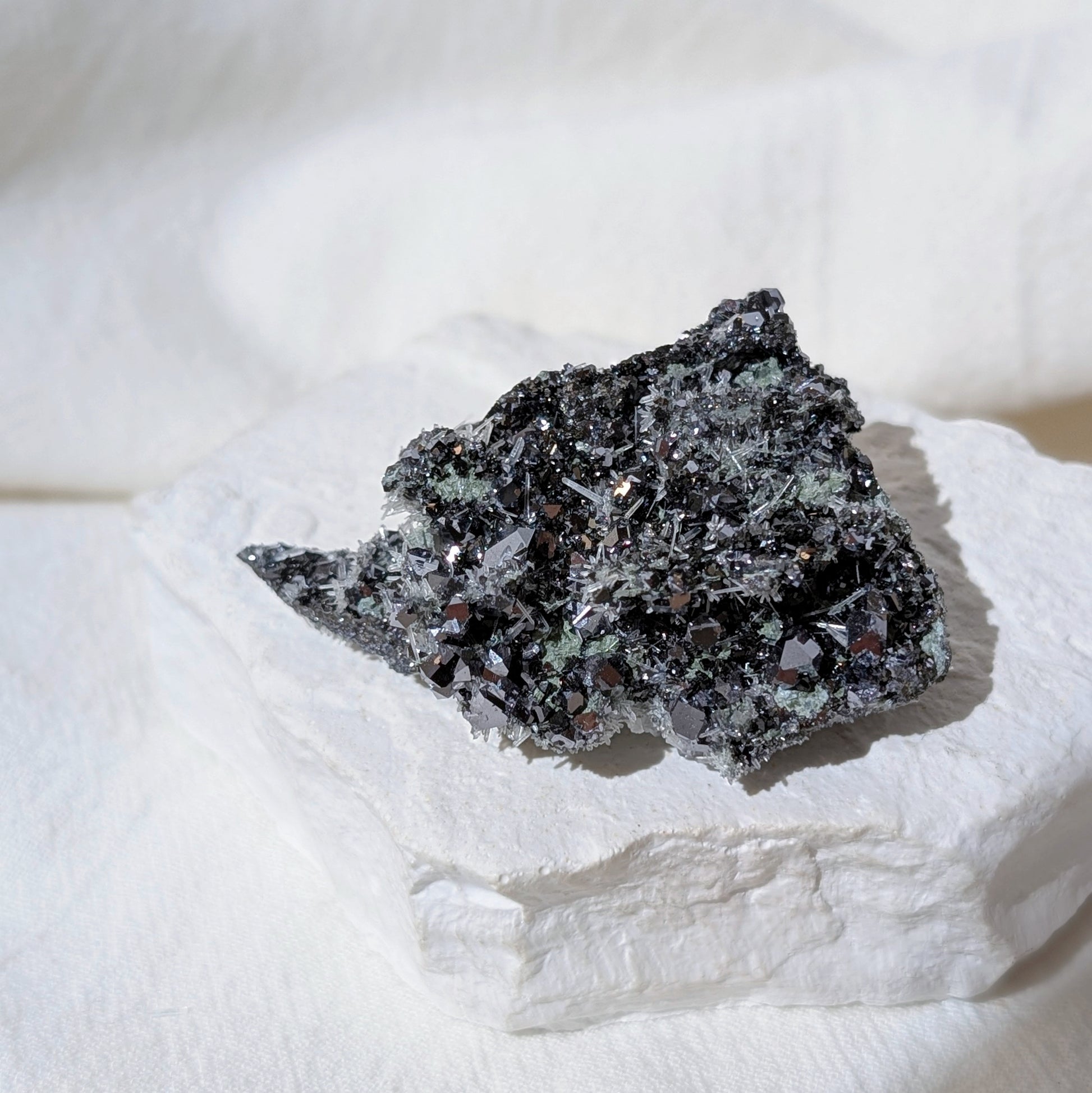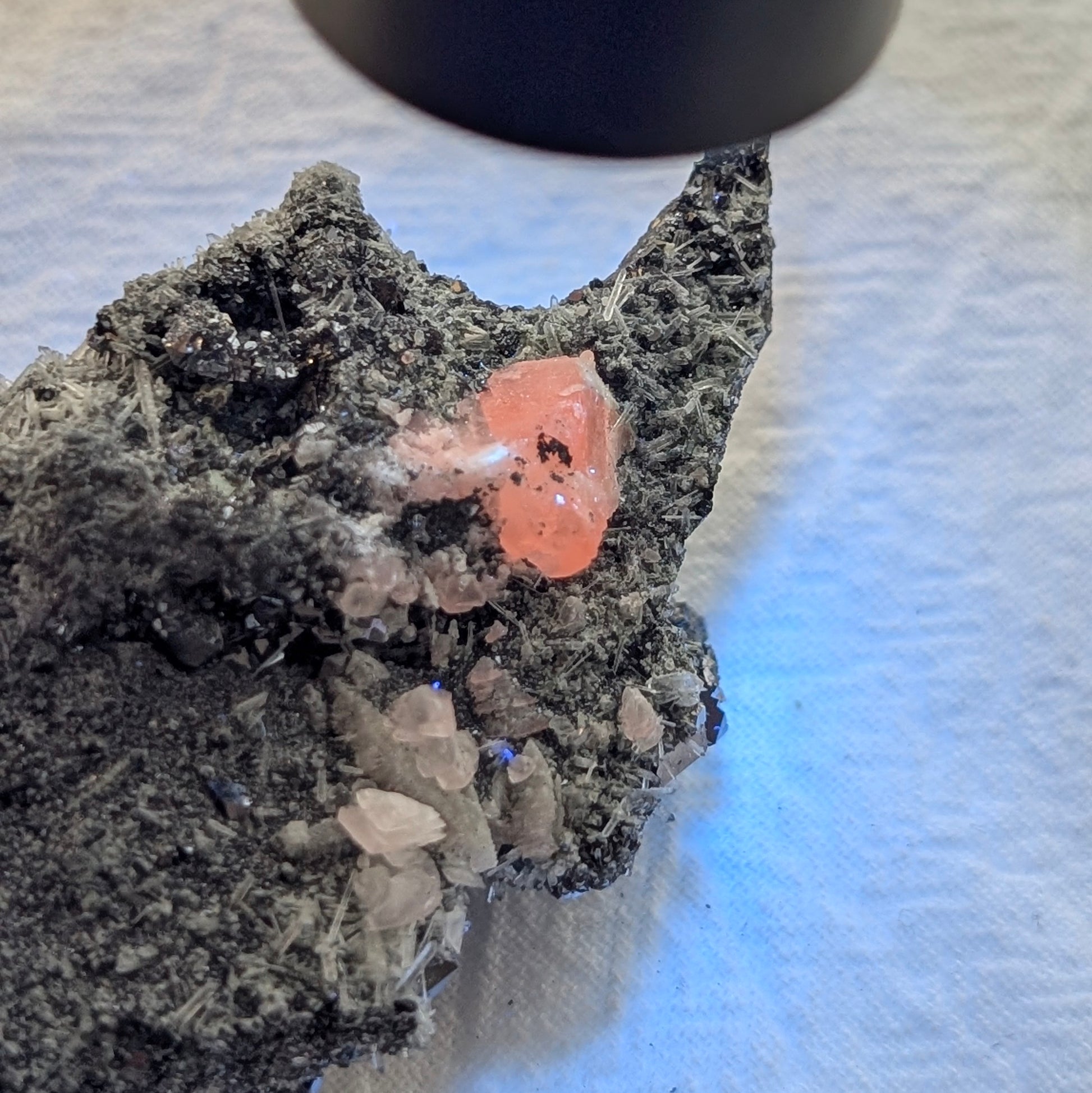 這顆是來自保加利亞的黃銅礦方鉛礦,跟針狀白水晶花共生,白水晶晶體完整,底部有方解石共生,方解石帶紅色螢光,具收藏價值。