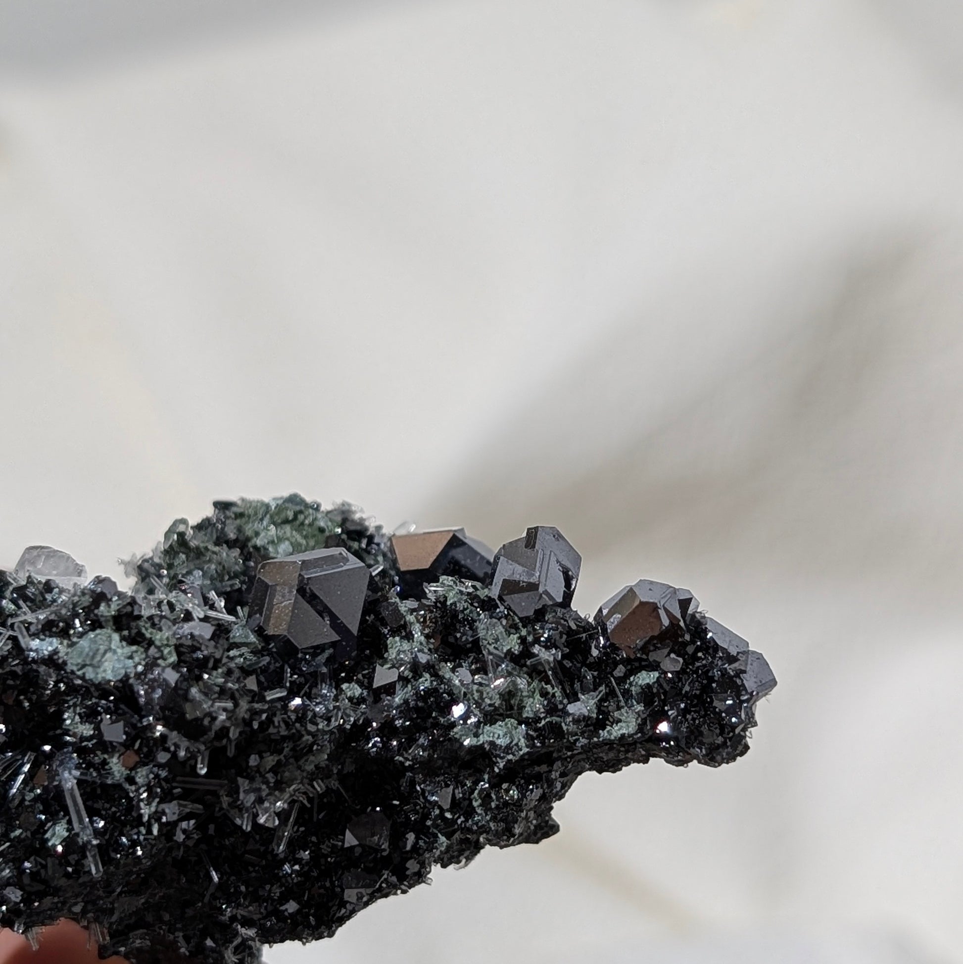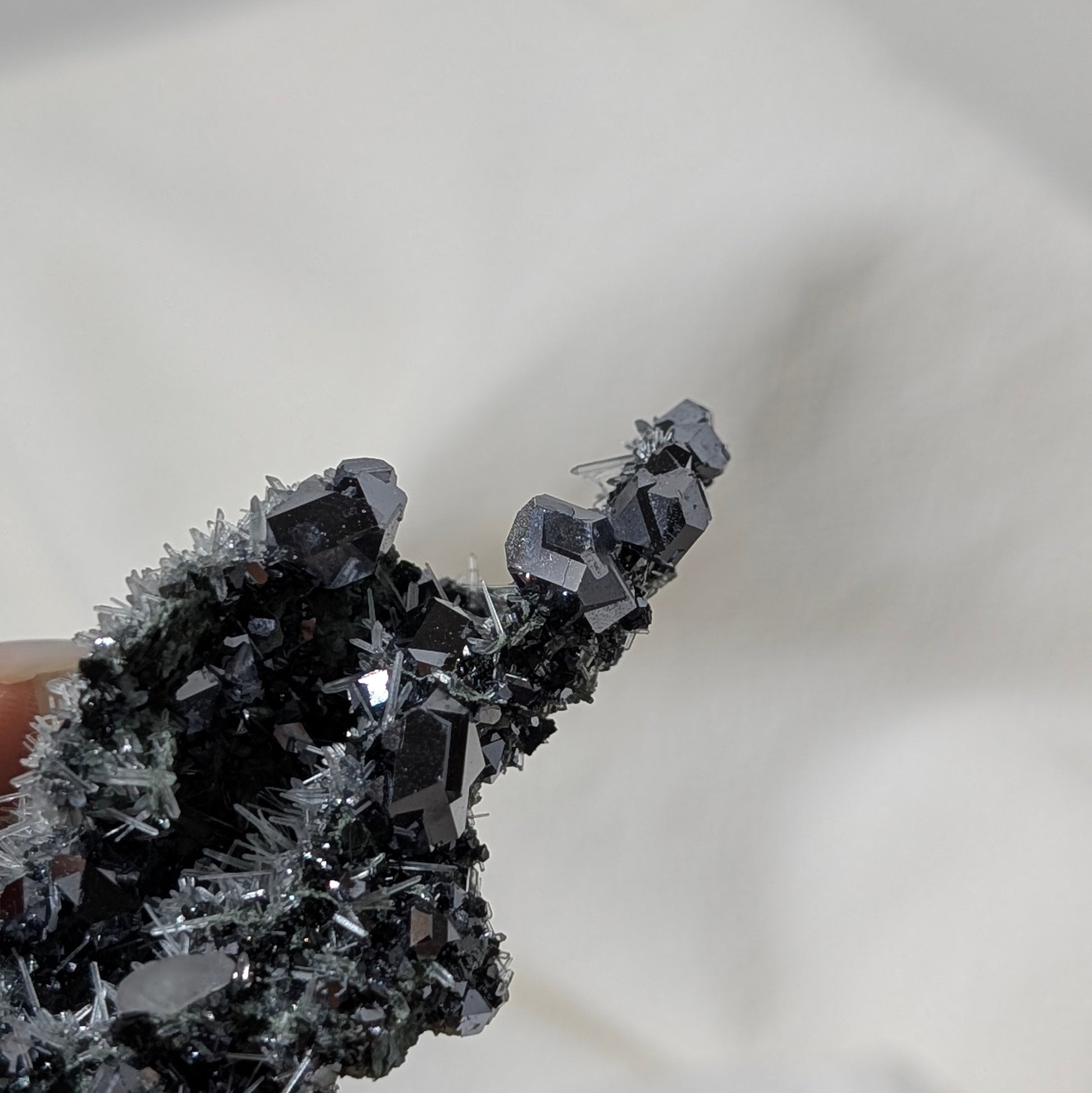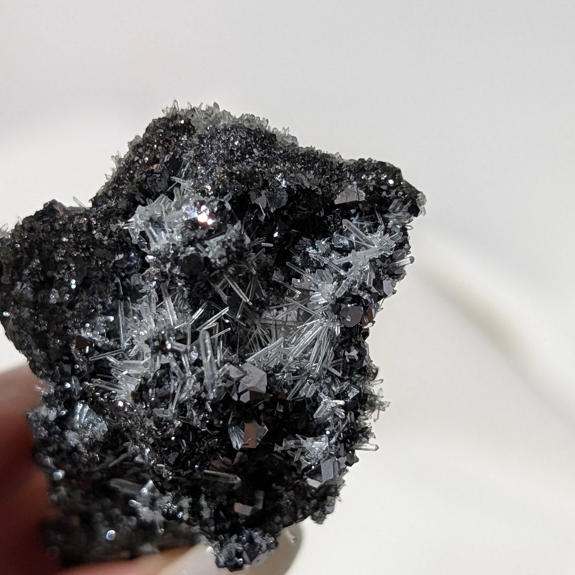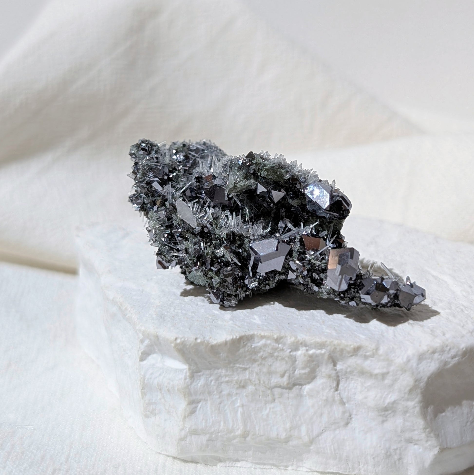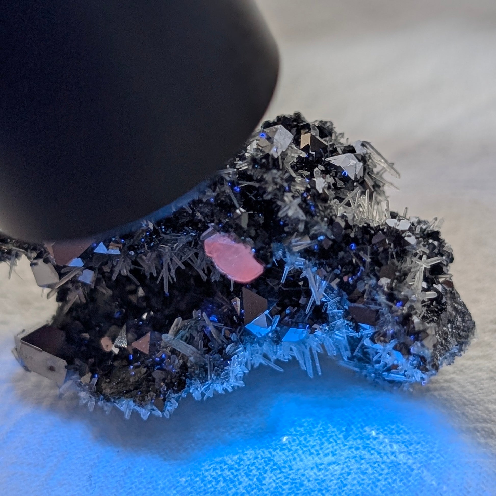 這顆是來自保加利亞的方鉛礦,跟針狀白水晶花共生,方鉛礦及白水晶晶體完整,帶有一個小小的方解石共生,方解石有紅色螢光,具收藏價值。