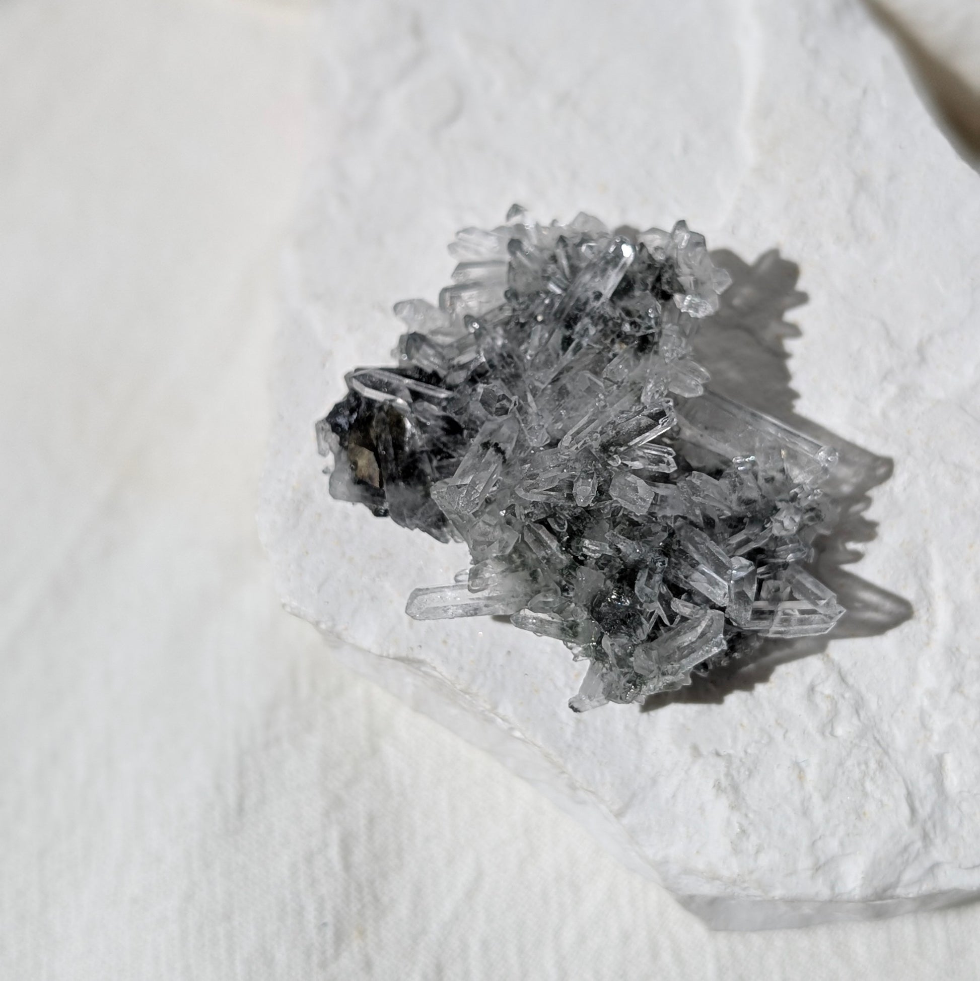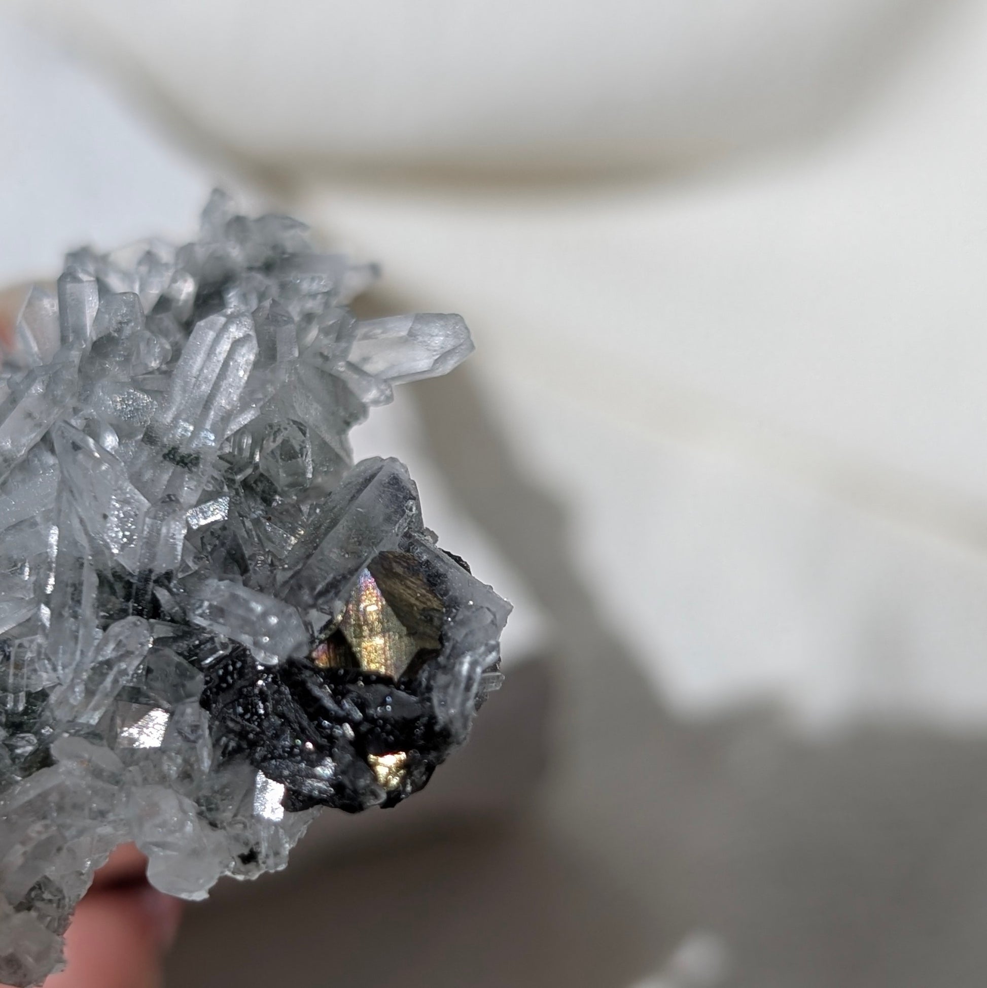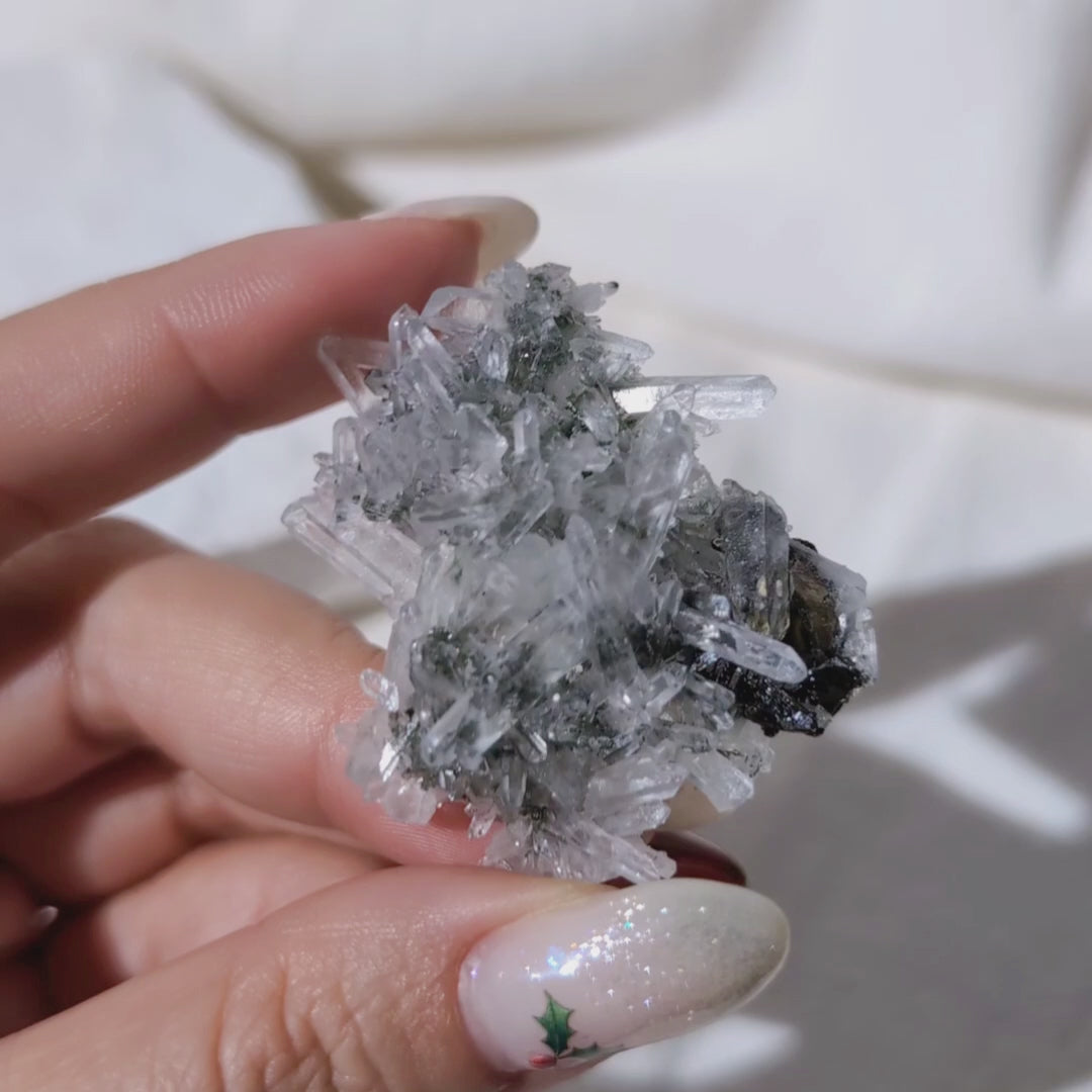 這顆是來自保加利亞的黃銅礦方鉛礦,跟白水晶花共生,白水晶晶體完整,具收藏價值。黃銅礦是能帶來豐盛及財富的礦石。它能清理我們頂輪的能量阻塞,也可以激活頂輪。如果你跟它有較強的感應可以試試拿它做冥想,它會幫助我們到達更深層的意識。