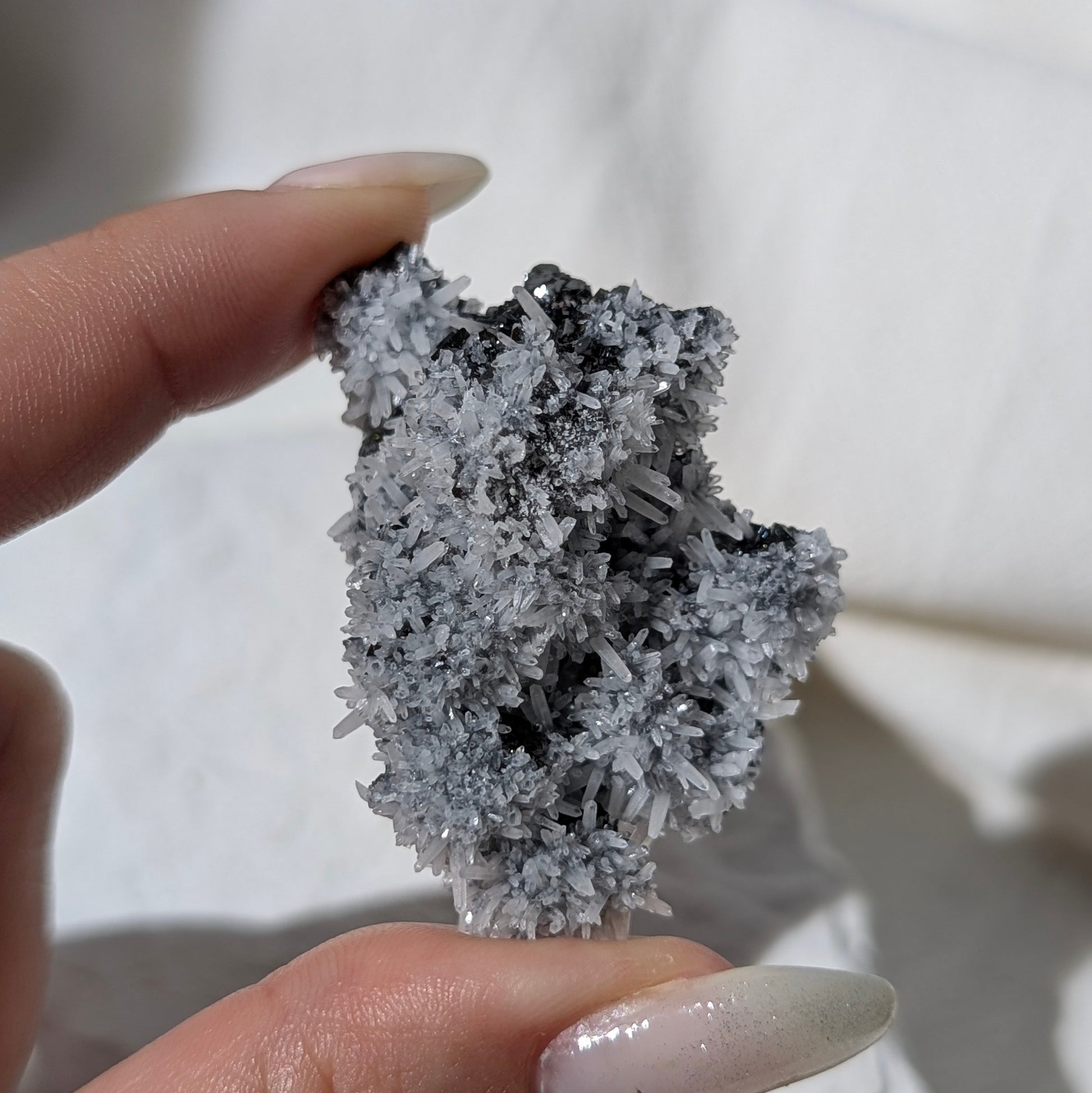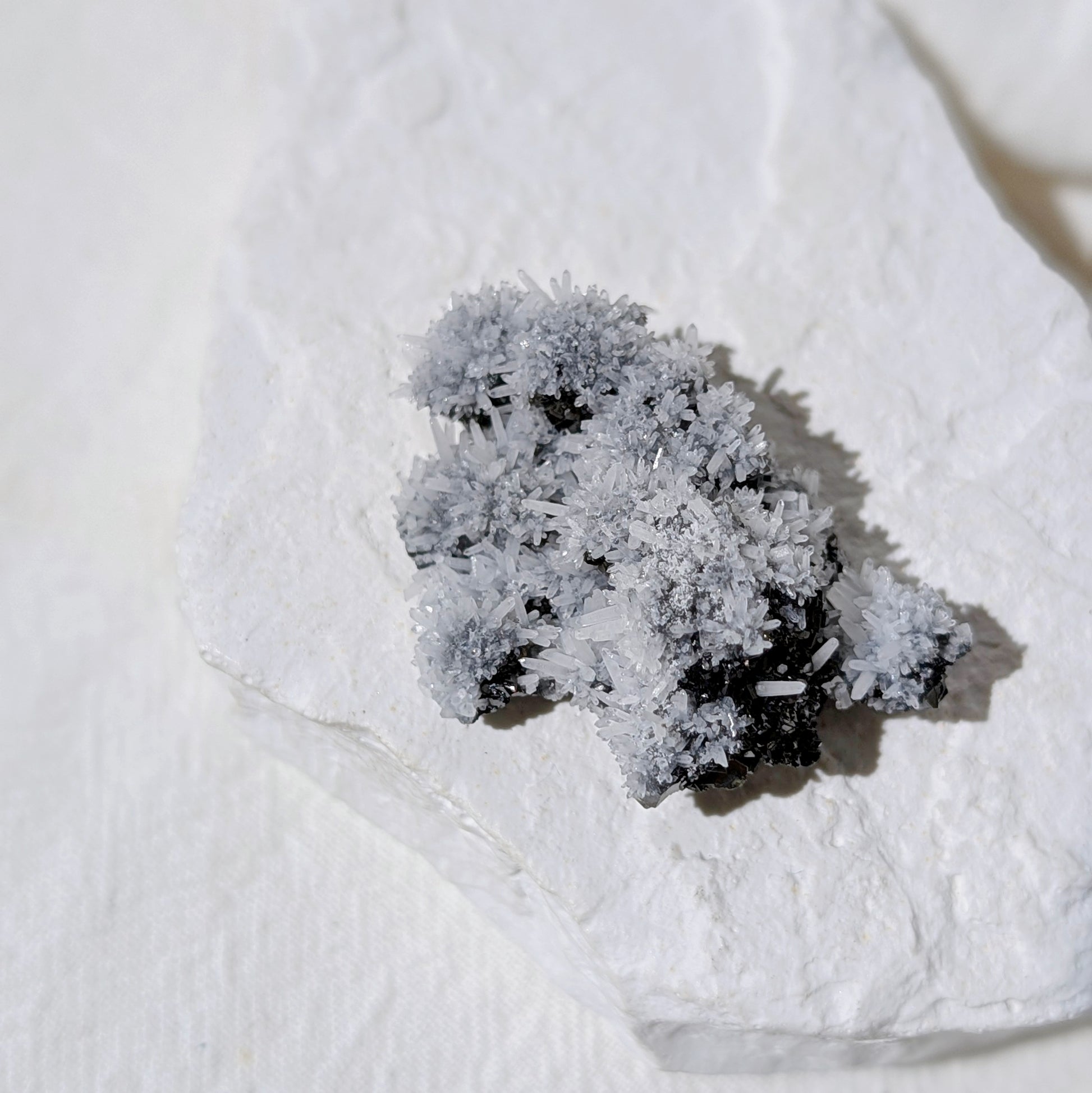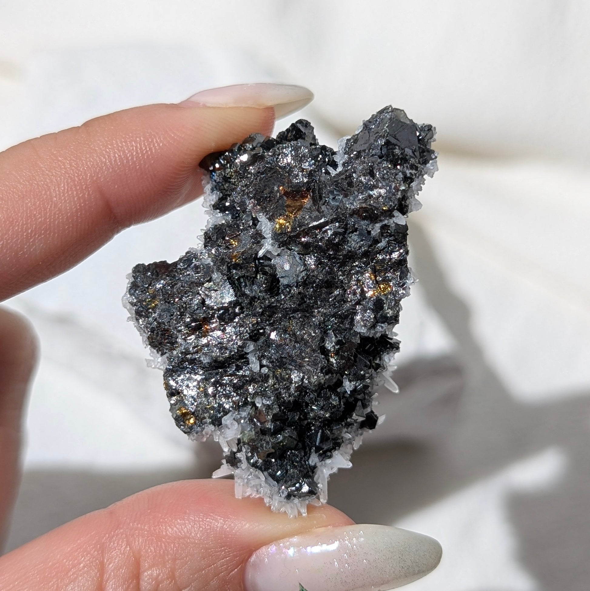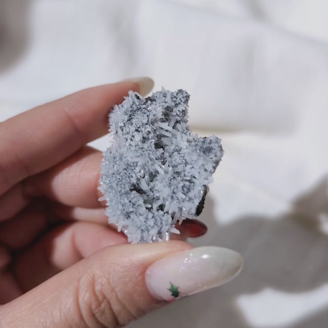 這顆是來自保加利亞的方鉛礦,跟針狀白水晶花共生,方鉛礦及白水晶晶體完整,帶有一個小小的方解石共生,方解石有紅色螢光,具收藏價值。