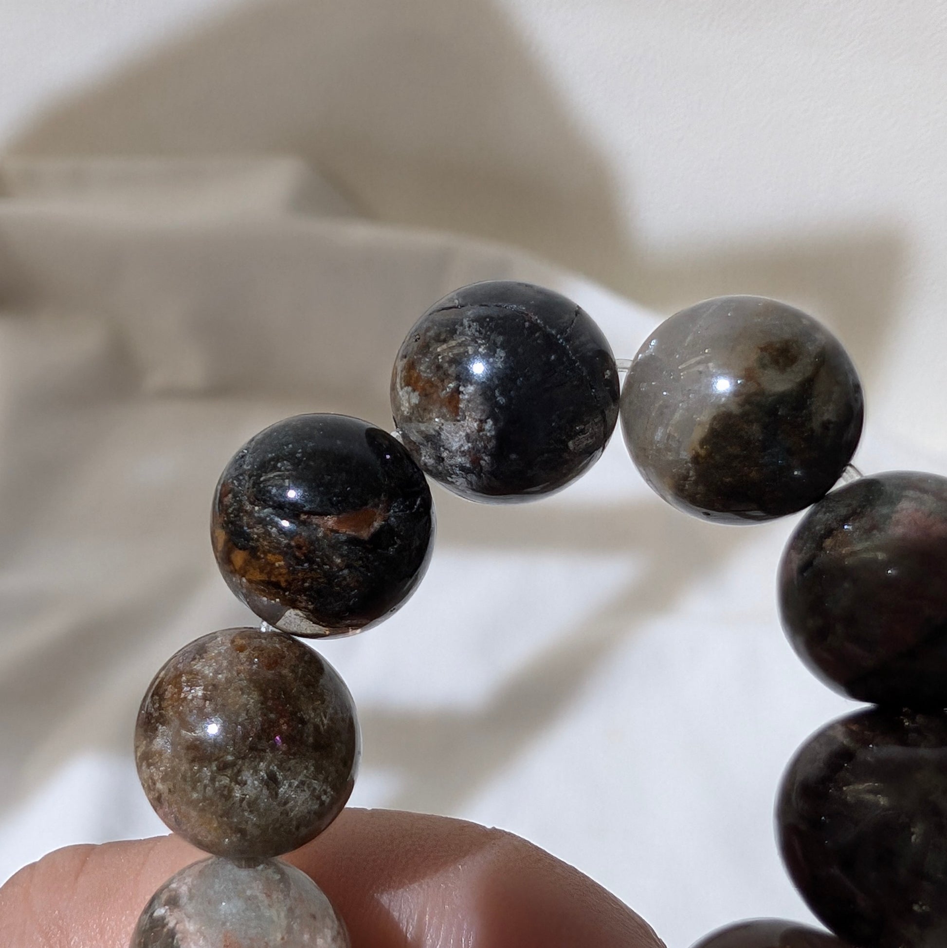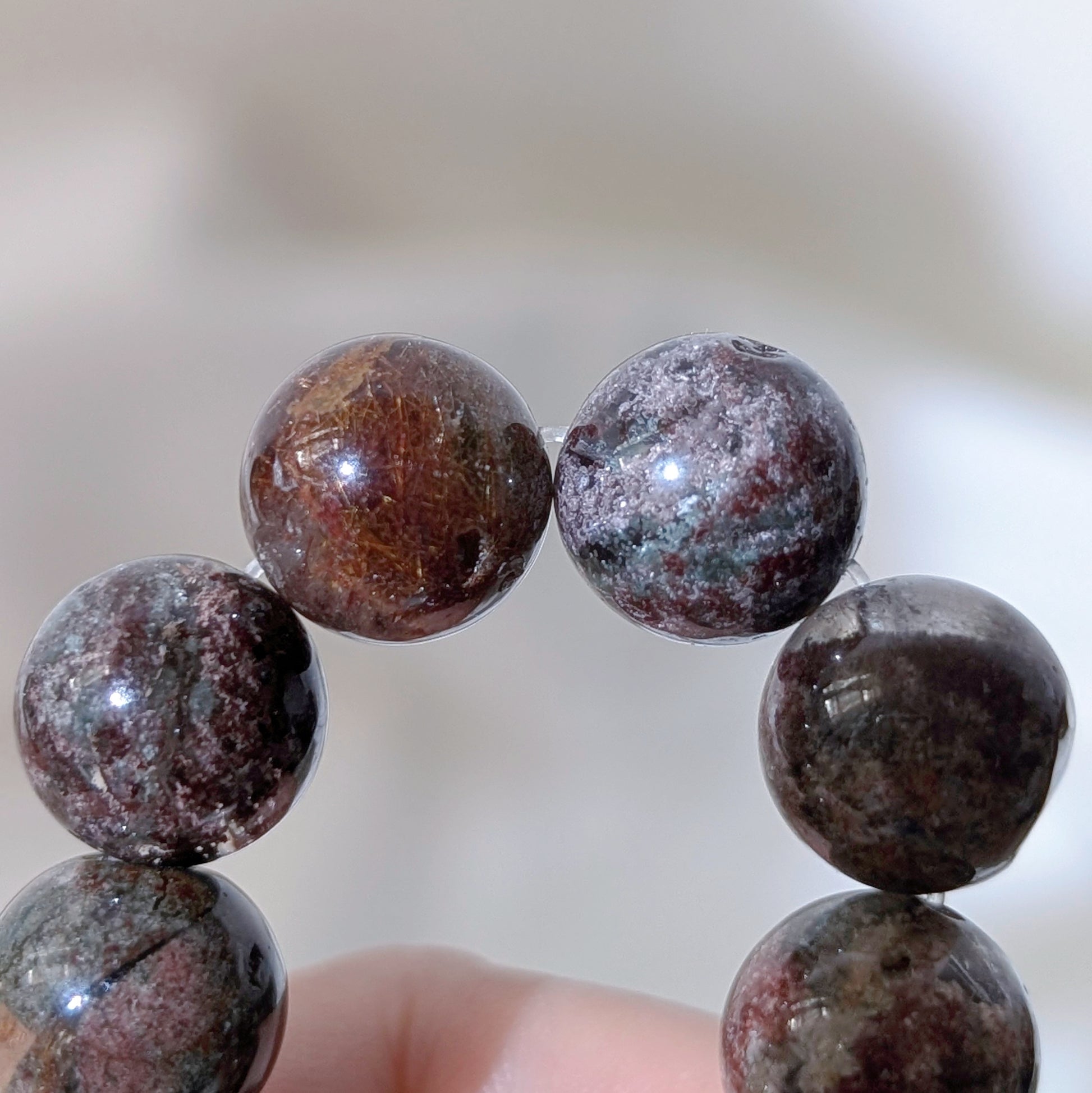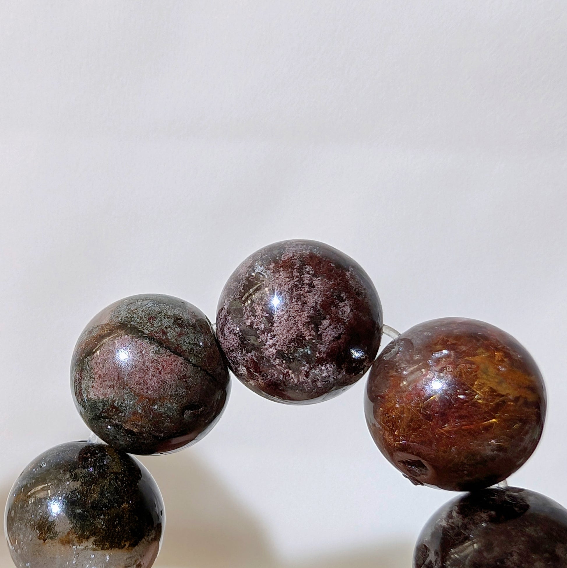 This amazing bracelet is full of mixed inclusion, garden quartz, lodilite, rutilated quartz, there are holes and cracks on the beads which is normal for polished phantom Quartz with much inclusions like this, but it doesn't take away the beauty of this bracelet, please beware as we don't offer refund or return.