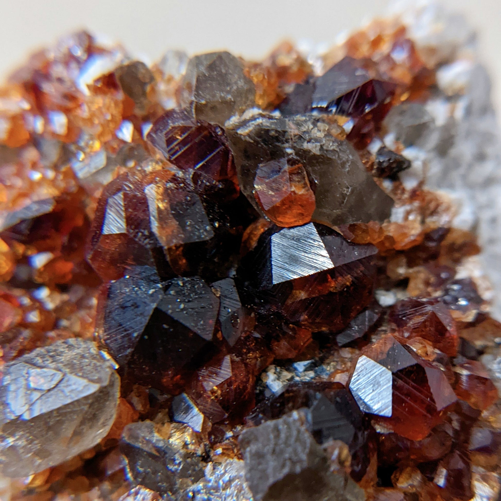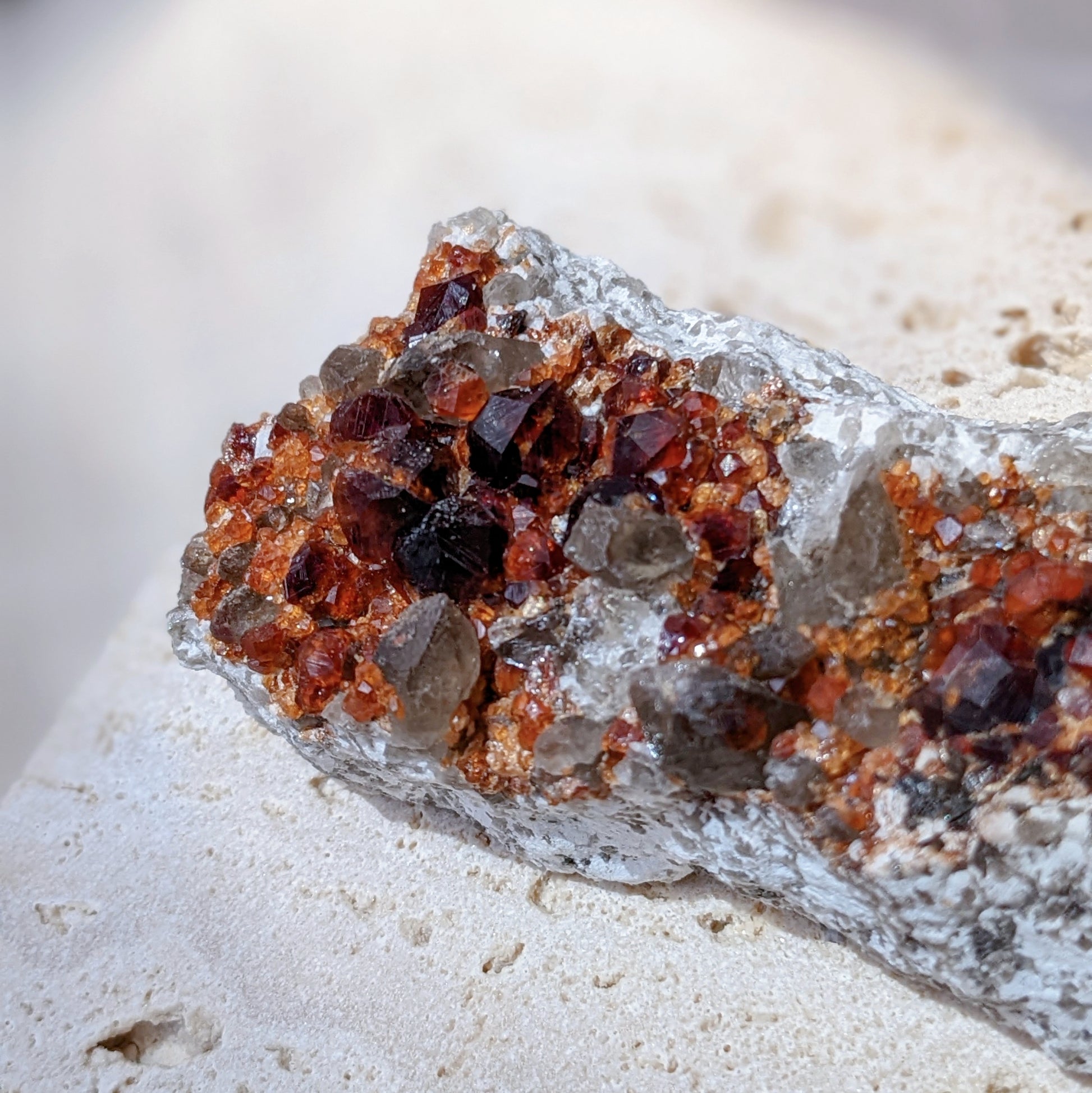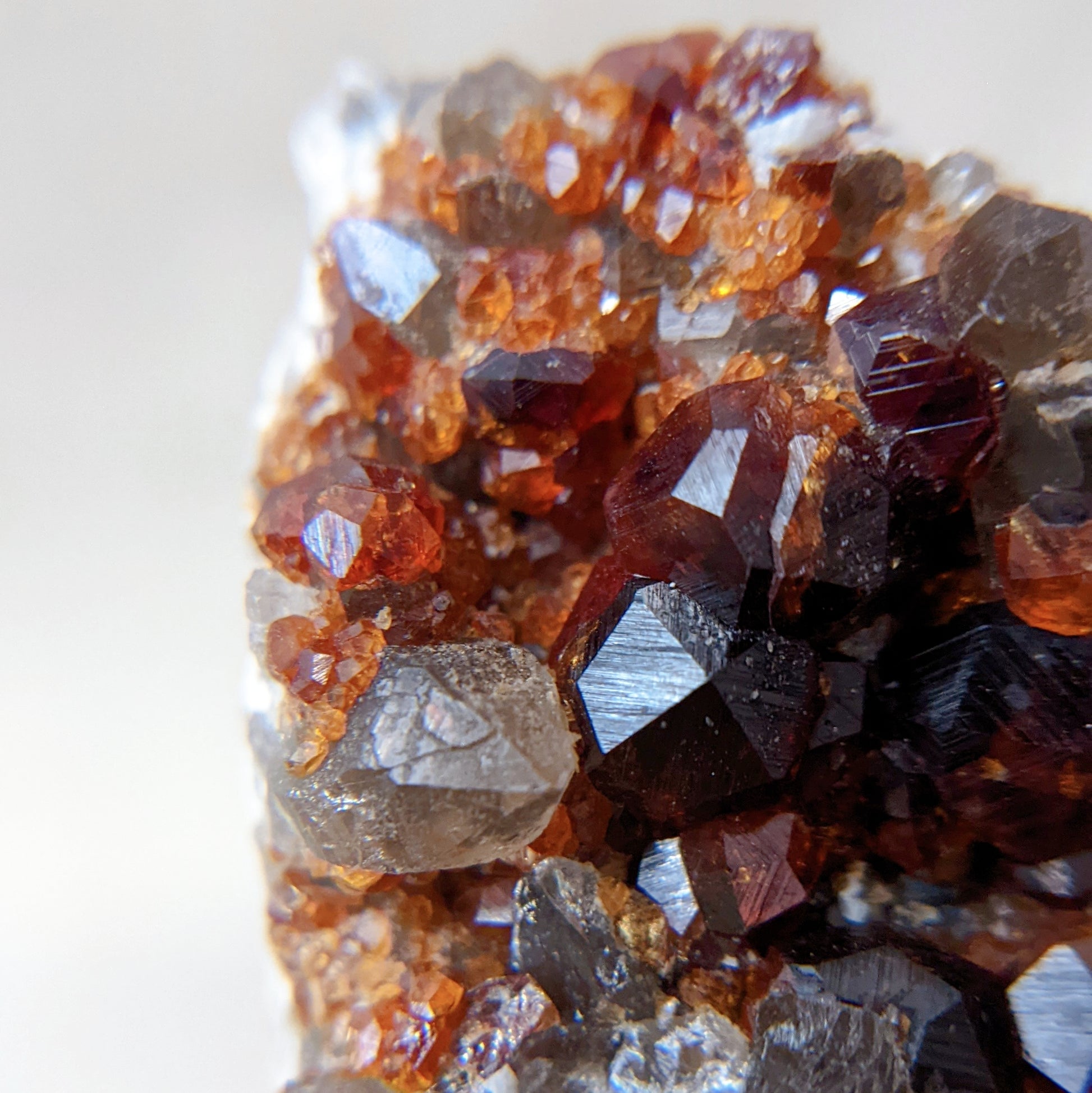 這顆煙晶石榴共生形態很特別,一般都是煙晶上長了石榴,這卻是煙晶長在石榴群的旁邊,煙晶上也長有小石榴石,母岩那邊是佈滿晶體完整的石榴石,生長紋也清晰可見,另外那邊的煙晶是兩顆重叠在一起,生長紋也是清晰可見,而且還帶著資料庫的,是一顆很難得的礦物標本。