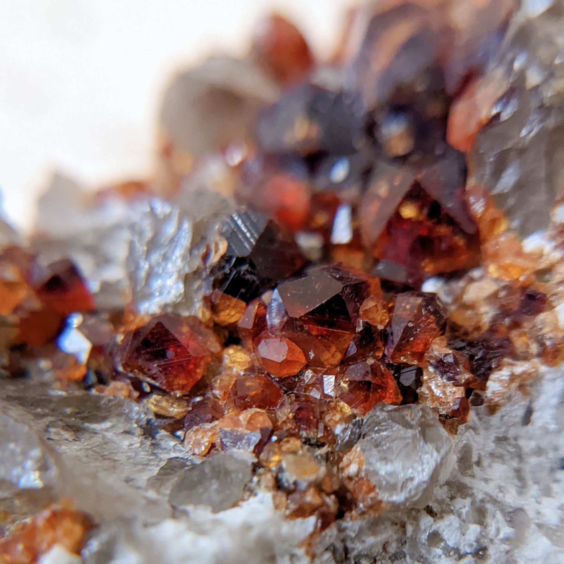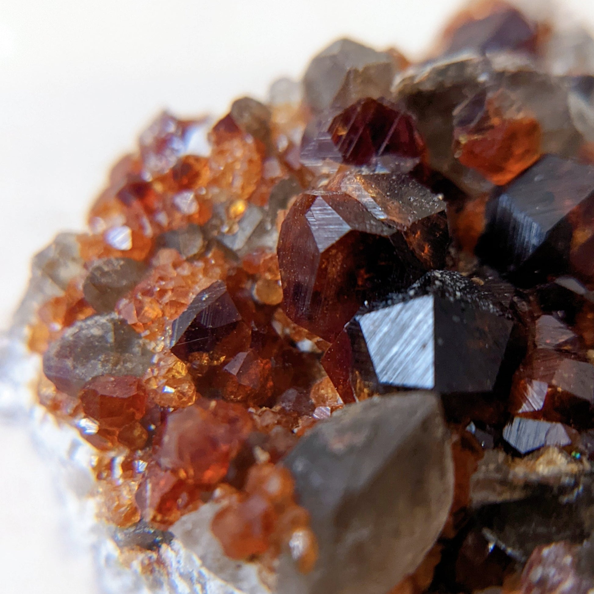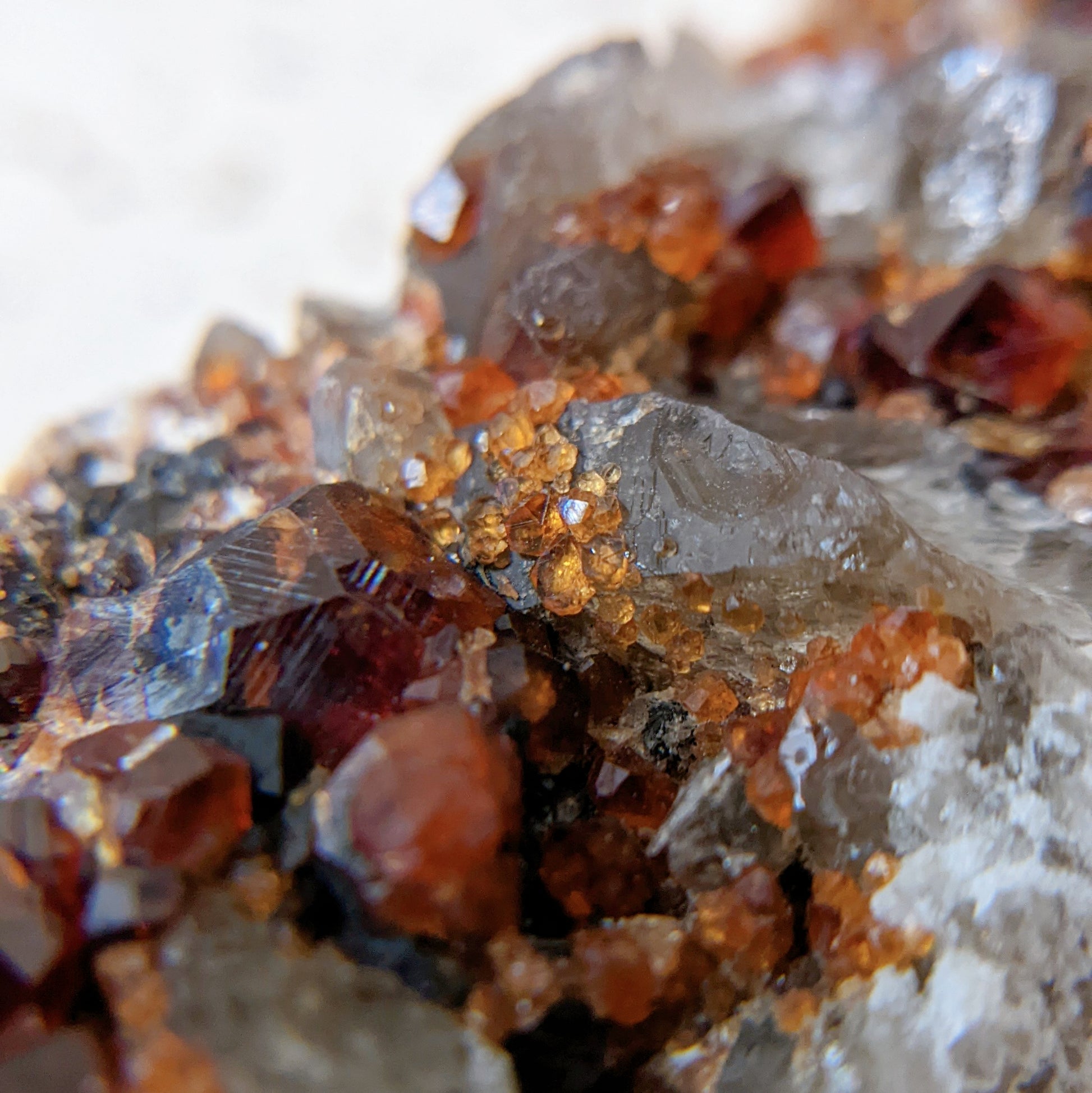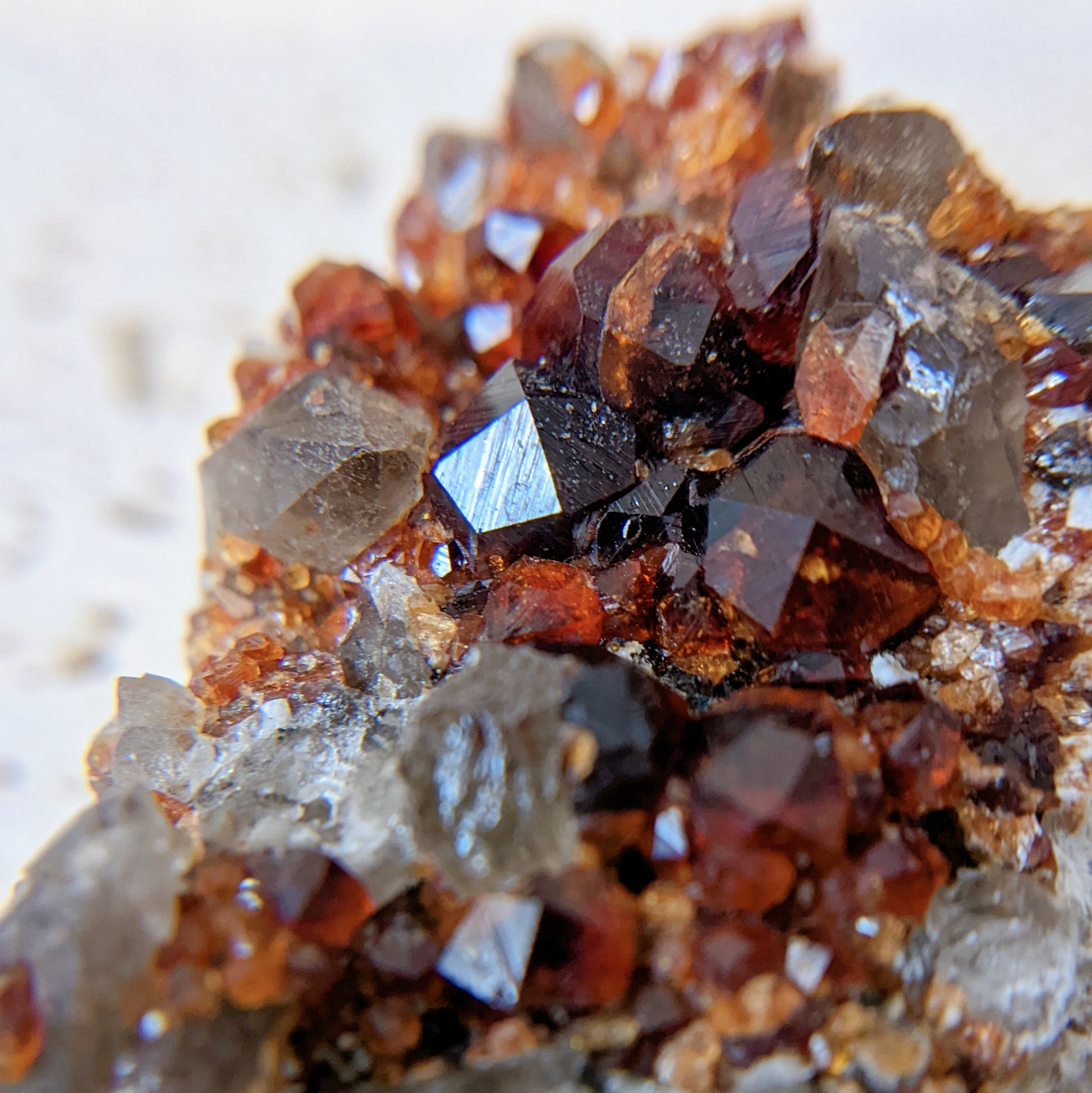 這顆煙晶石榴共生形態很特別,一般都是煙晶上長了石榴,這卻是煙晶長在石榴群的旁邊,煙晶上也長有小石榴石,母岩那邊是佈滿晶體完整的石榴石,生長紋也清晰可見,另外那邊的煙晶是兩顆重叠在一起,生長紋也是清晰可見,而且還帶著資料庫的,是一顆很難得的礦物標本。