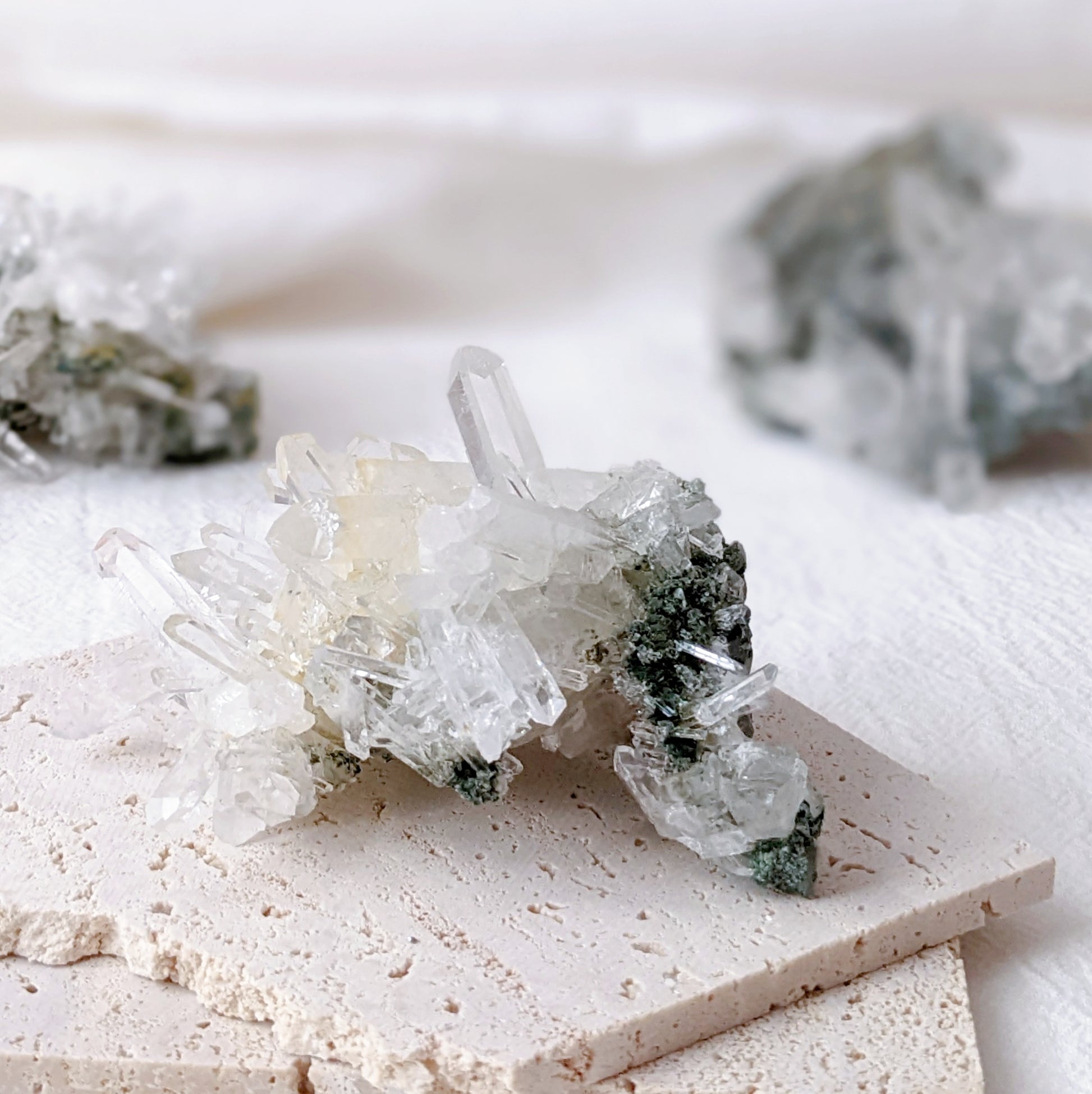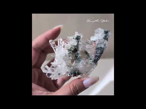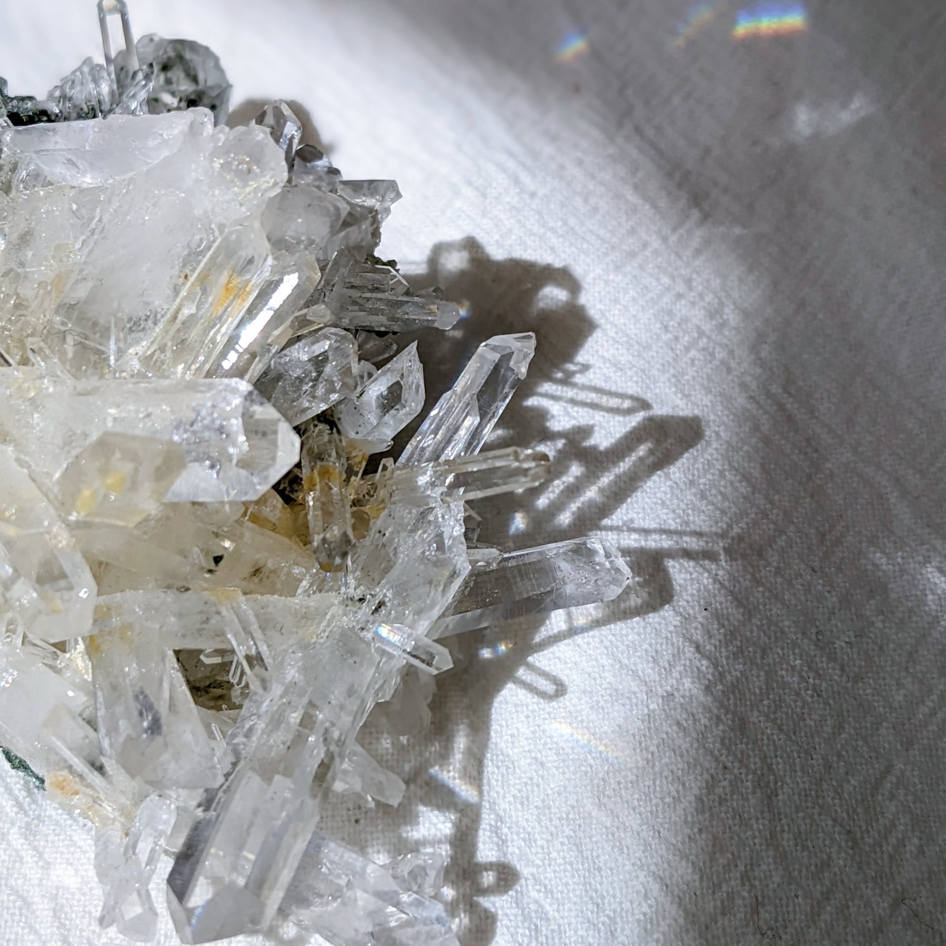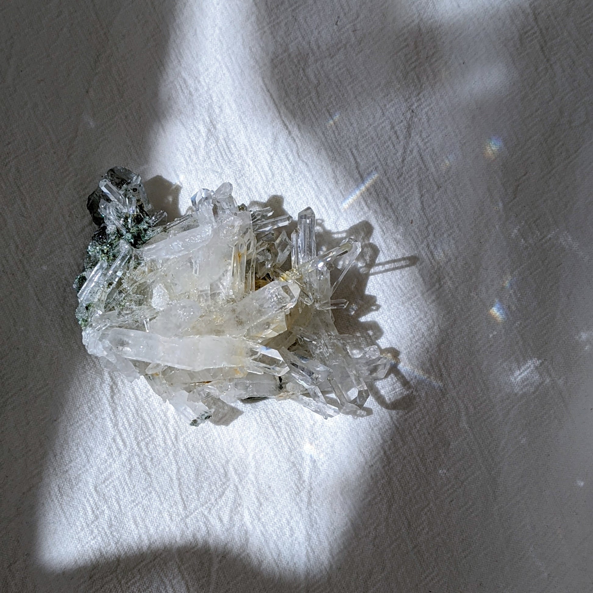 Rare Water Clear Green Lemurian Cluster Premium Grade with Clinochlore inclusion (Golden Healer)