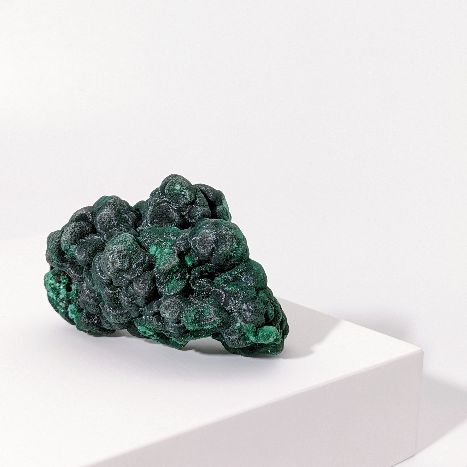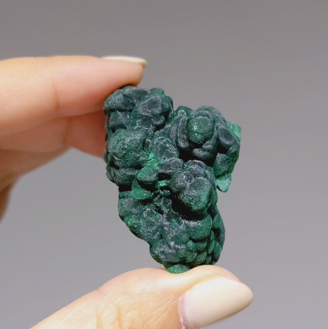 這顆是墨綠色的陽春球狀孔雀礦,陽春是中國的孔雀石之鄉,這裡出產的孔雀石品質優秀,色澤豔麗,具收藏價值,這顆孔雀礦整顆在燈光下都是絨狀貓眼效果,形狀完整。