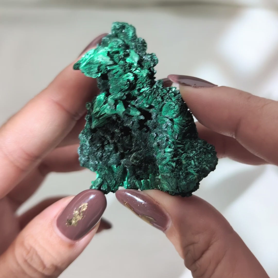 This vibrant green Malachite has a fibrous like and velvet texture under the light, it's super shiny under the light.