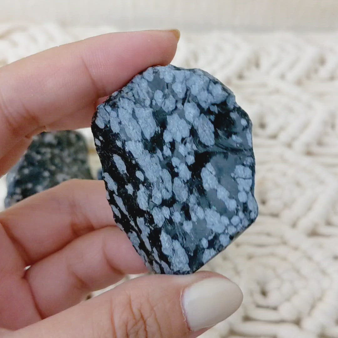 Obsidian is a natural volcanic glass, and the white snowflake pattern is formed by the mineral Cristobalite. It's one of the oldest stones on earth. Snowflake Obsidian is good to balance, purify, and ground our mind, body, and aura. It activates our root and third eye chakra, enhances our psychic ability and past life meditation. It helps keep us focused, and eliminates procrastination. It assists on breaking bad habits, and strengthen our mind.