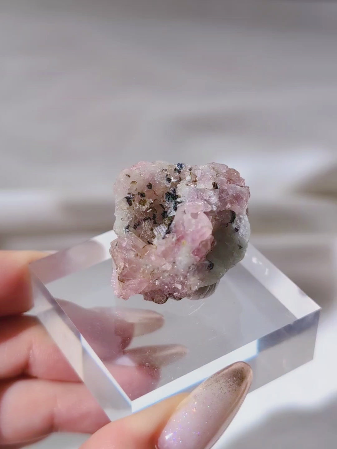 這是很有趣的一顆小晶洞,它表面上看著是粉紅碧璽,但其實晶洞裏有著大大小小正在生長的綠碧璽,是一顆西瓜碧璽,而且它的粉紅晶體算是很通透,很值得收藏。