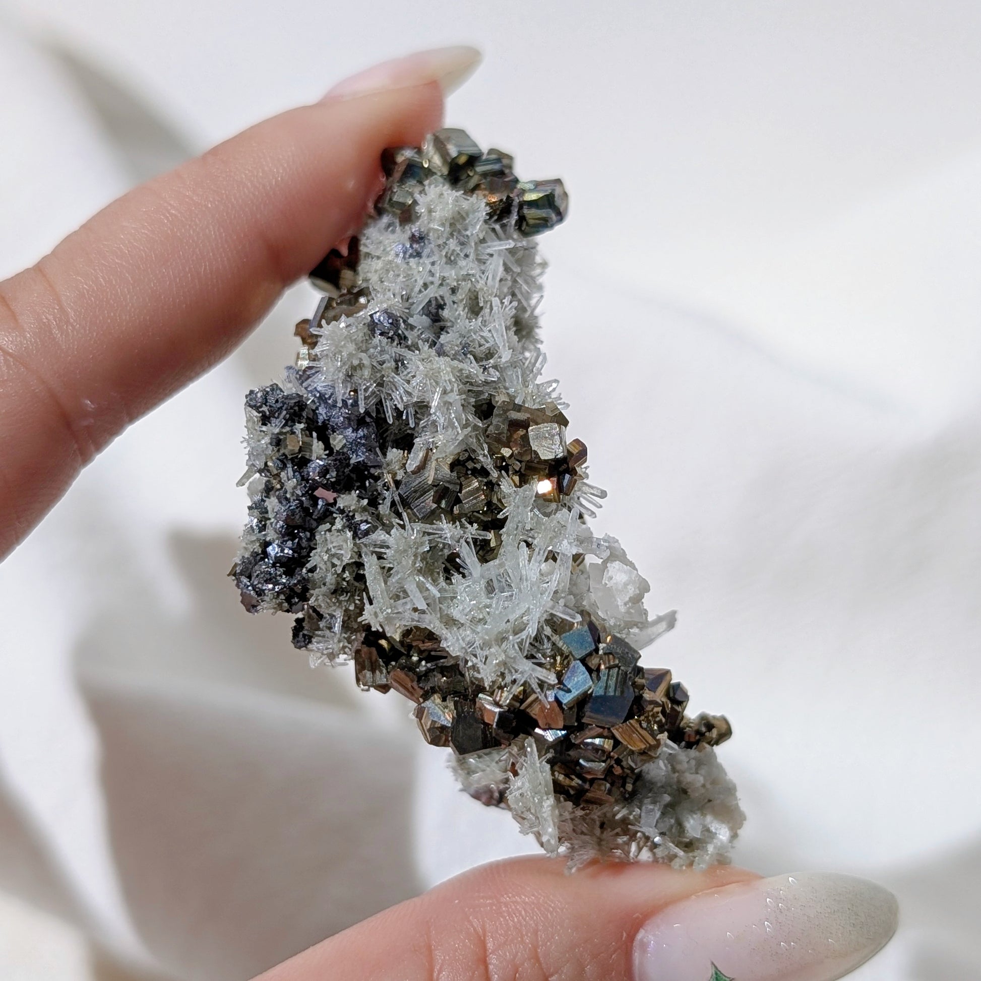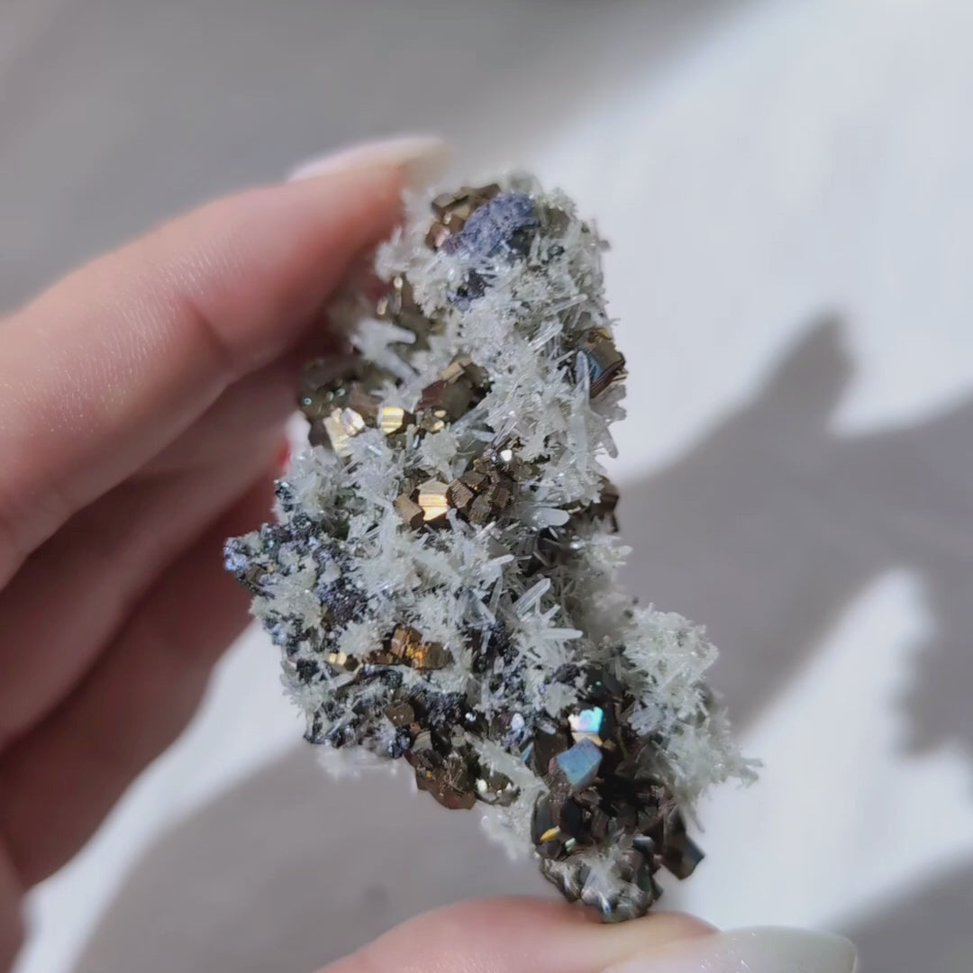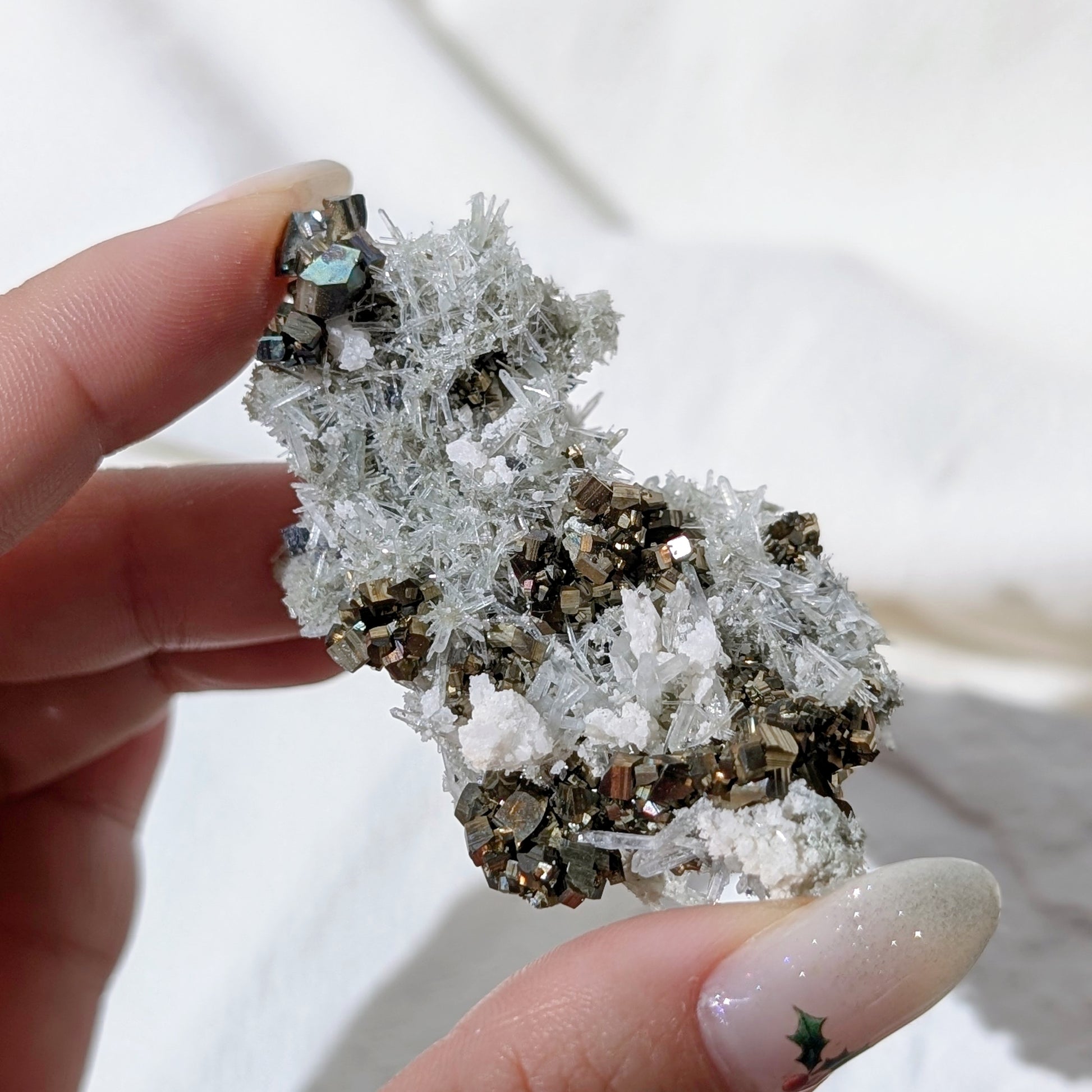 這顆是來自保加利亞的黃鐵礦方鉛礦,晶體光亮及完整,跟針狀白水晶共生,具收藏價值。黃鐵礦是能帶來豐盛及財富的礦石。它能清理我們頂輪的能量阻塞,也可以激活頂輪。如果你跟它有較強的感應可以試試拿它做冥想,它會幫助我們到達更深層的意識。