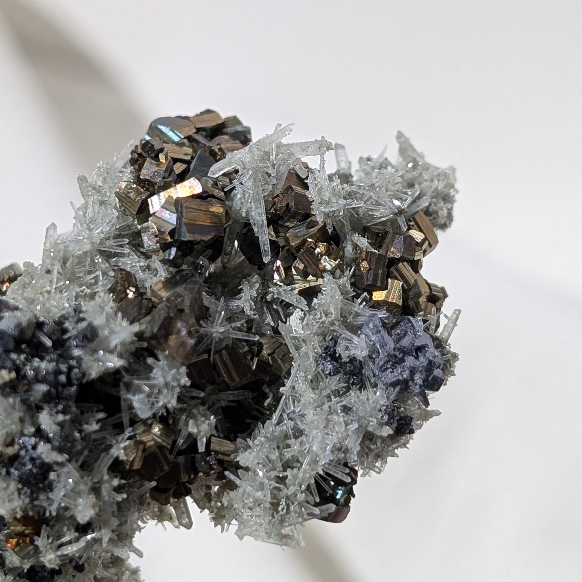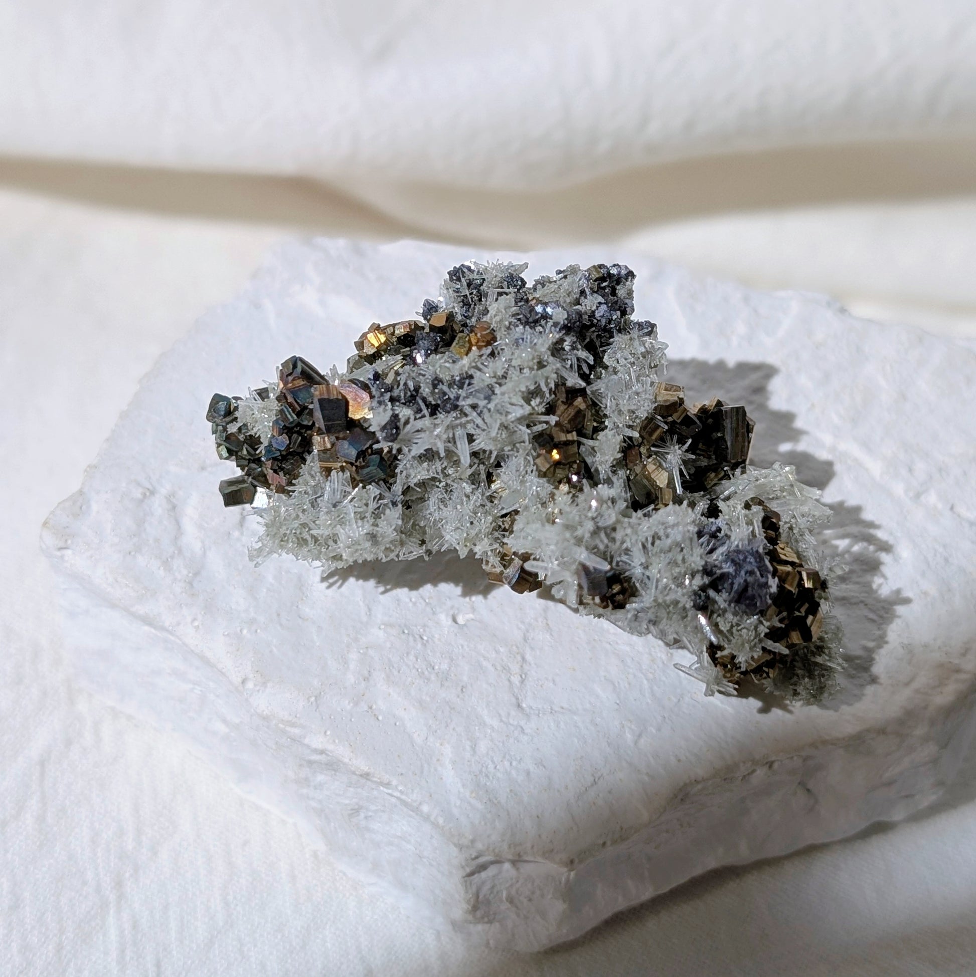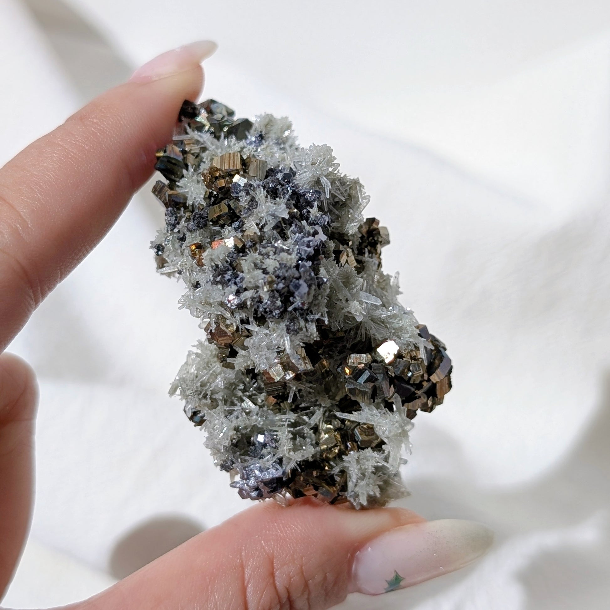 這顆是來自保加利亞的黃鐵礦方鉛礦,晶體光亮及完整,跟針狀白水晶共生,具收藏價值。黃鐵礦是能帶來豐盛及財富的礦石。它能清理我們頂輪的能量阻塞,也可以激活頂輪。如果你跟它有較強的感應可以試試拿它做冥想,它會幫助我們到達更深層的意識。