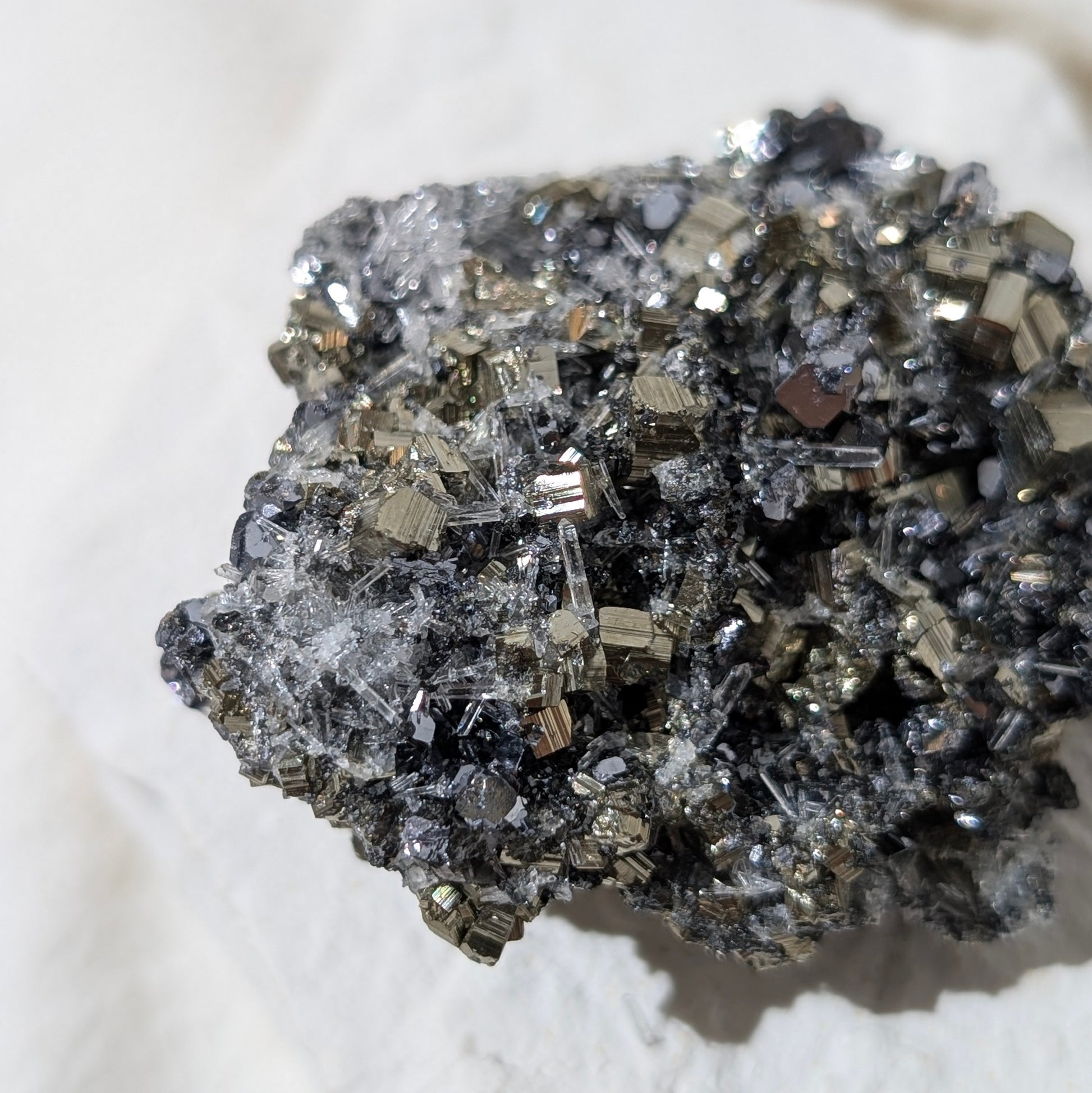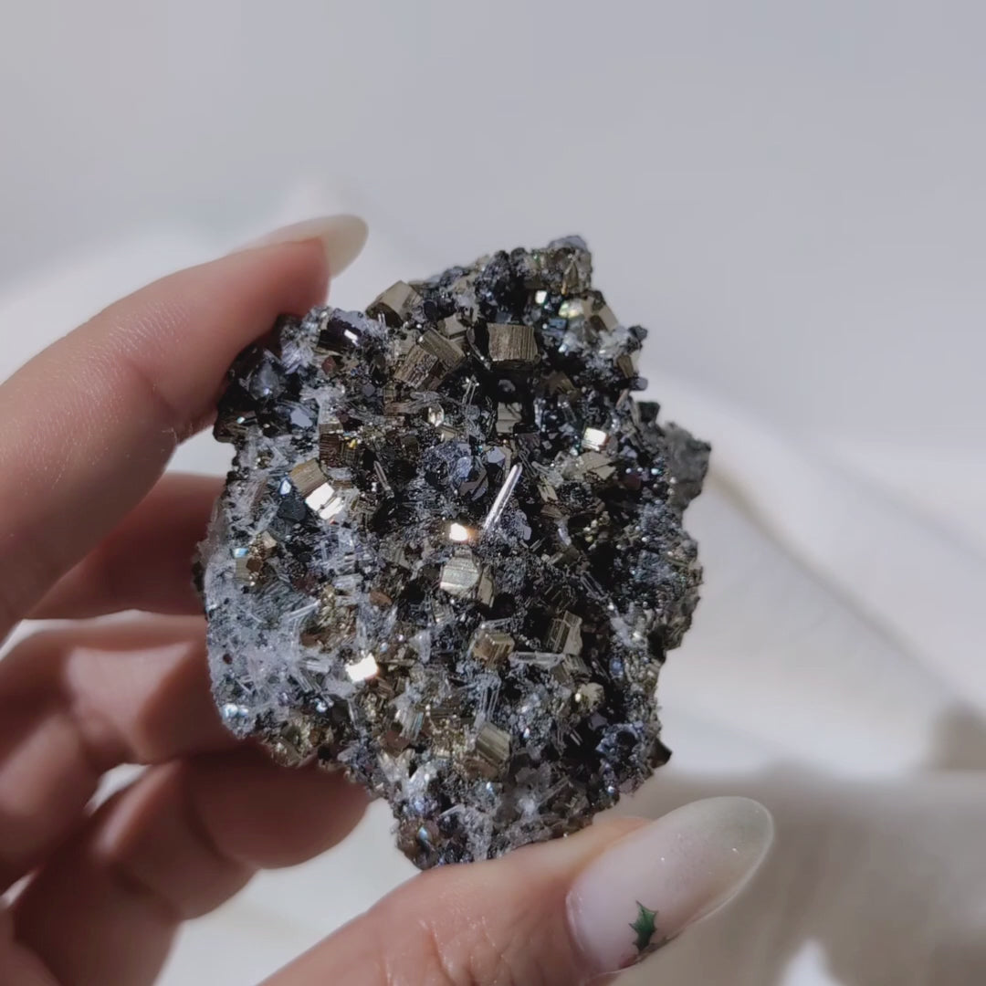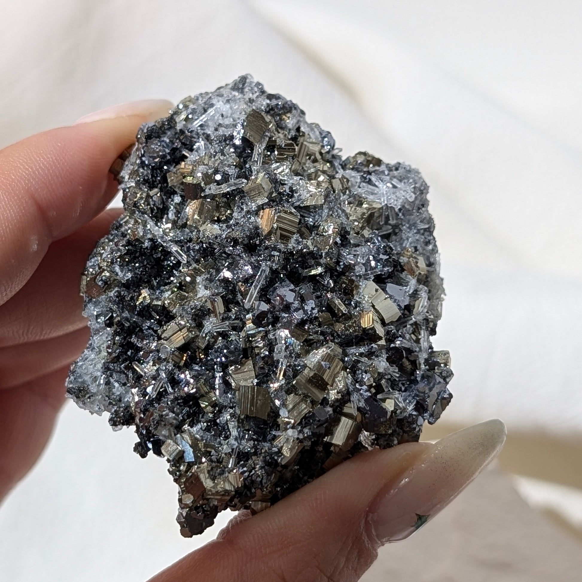 這顆是來自保加利亞的黃鐵礦方鉛礦,晶體光亮及完整,跟針狀白水晶共生,具收藏價值。黃鐵礦是能帶來豐盛及財富的礦石。它能清理我們頂輪的能量阻塞,也可以激活頂輪。如果你跟它有較強的感應可以試試拿它做冥想,它會幫助我們到達更深層的意識。