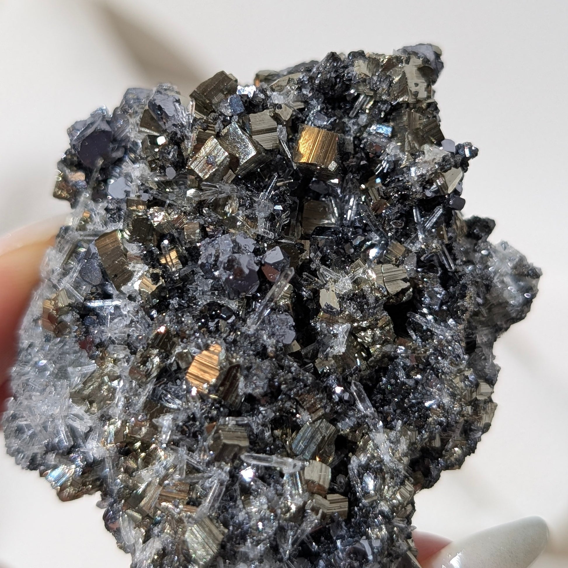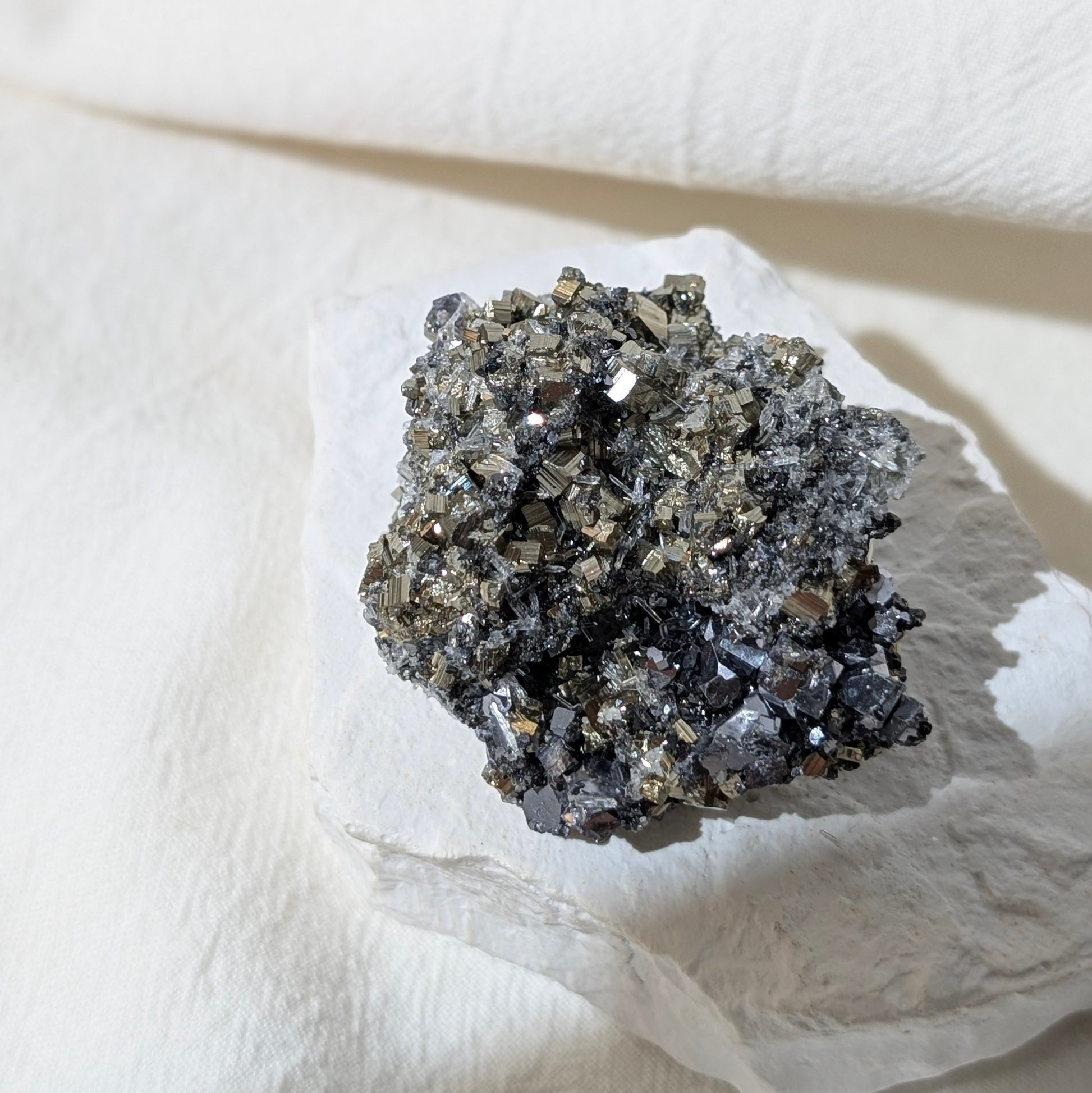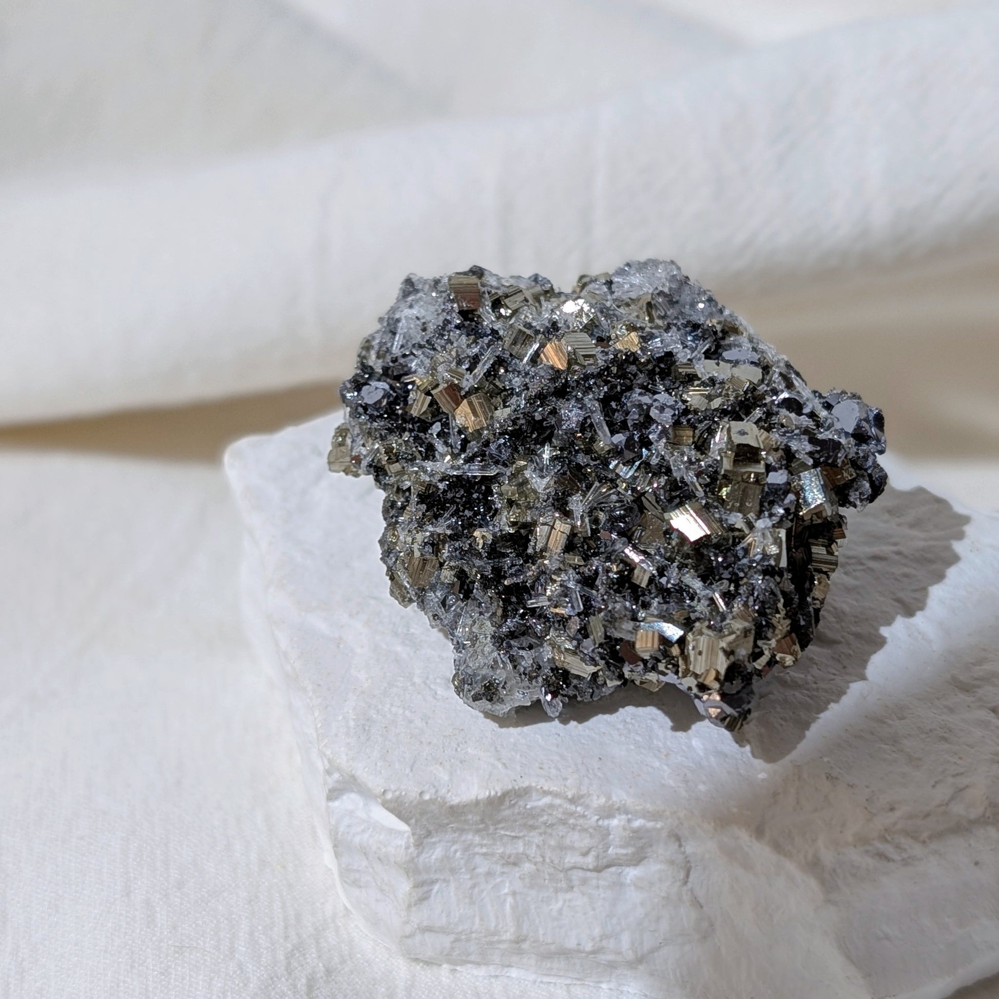這顆是來自保加利亞的黃鐵礦方鉛礦,晶體光亮及完整,跟針狀白水晶共生,具收藏價值。黃鐵礦是能帶來豐盛及財富的礦石。它能清理我們頂輪的能量阻塞,也可以激活頂輪。如果你跟它有較強的感應可以試試拿它做冥想,它會幫助我們到達更深層的意識。