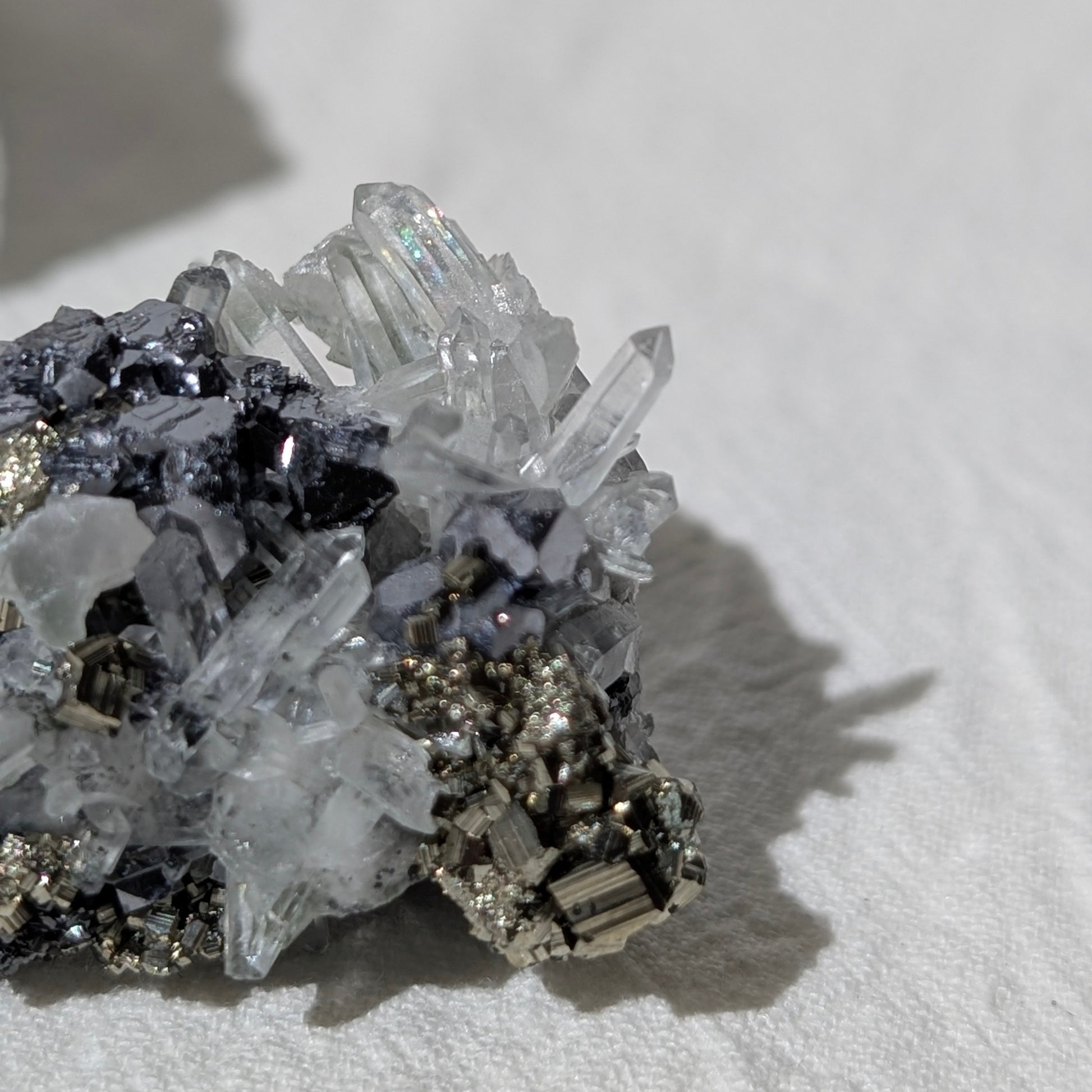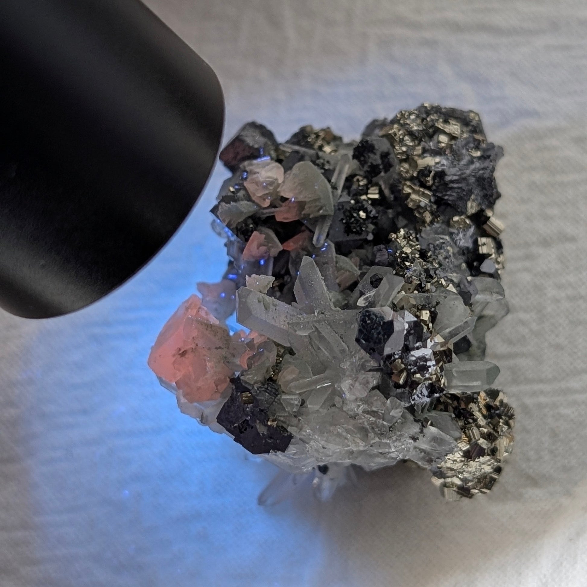 這顆是來自保加利亞的黃鐵礦方鉛礦,晶體光亮及完整,跟針狀白水晶及方解石共生,方解石有紅色螢光,具收藏價值。黃鐵礦是能帶來豐盛及財富的礦石。它能清理我們頂輪的能量阻塞,也可以激活頂輪。如果你跟它有較強的感應可以試試拿它做冥想,它會幫助我們到達更深層的意識。