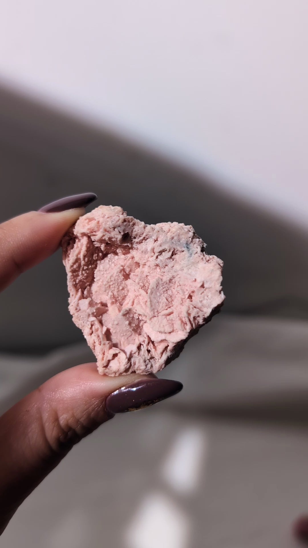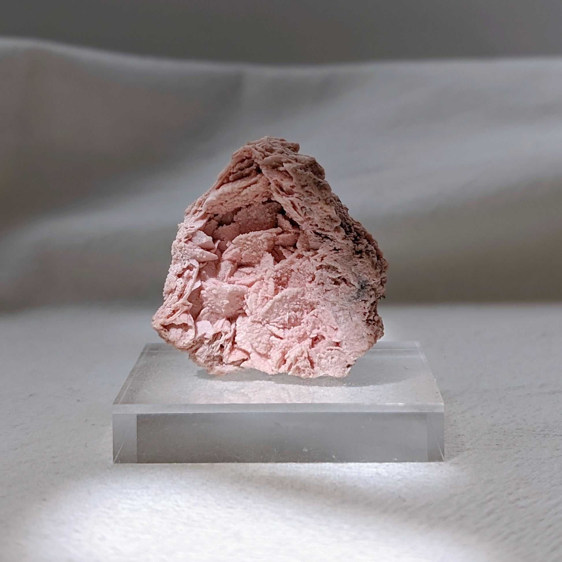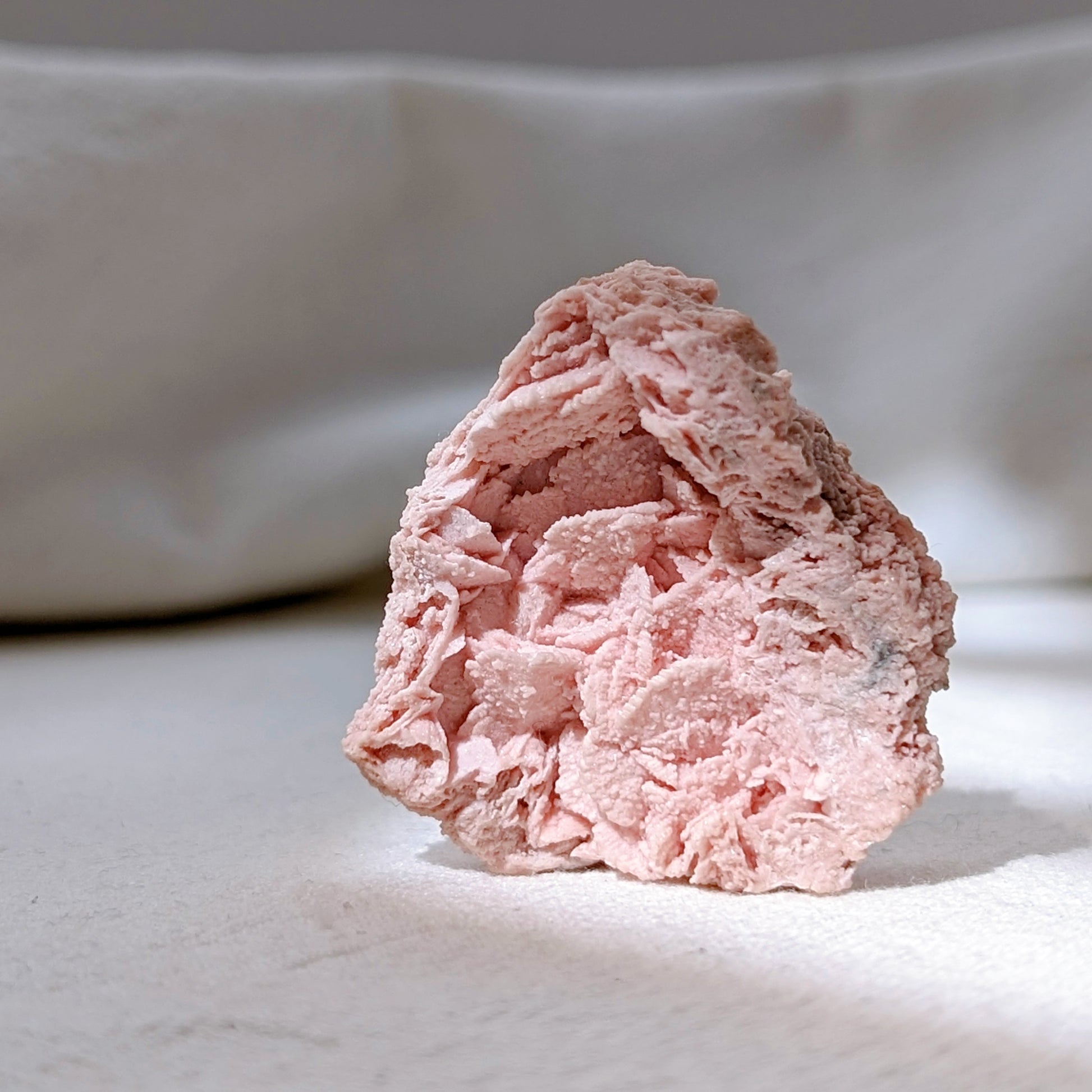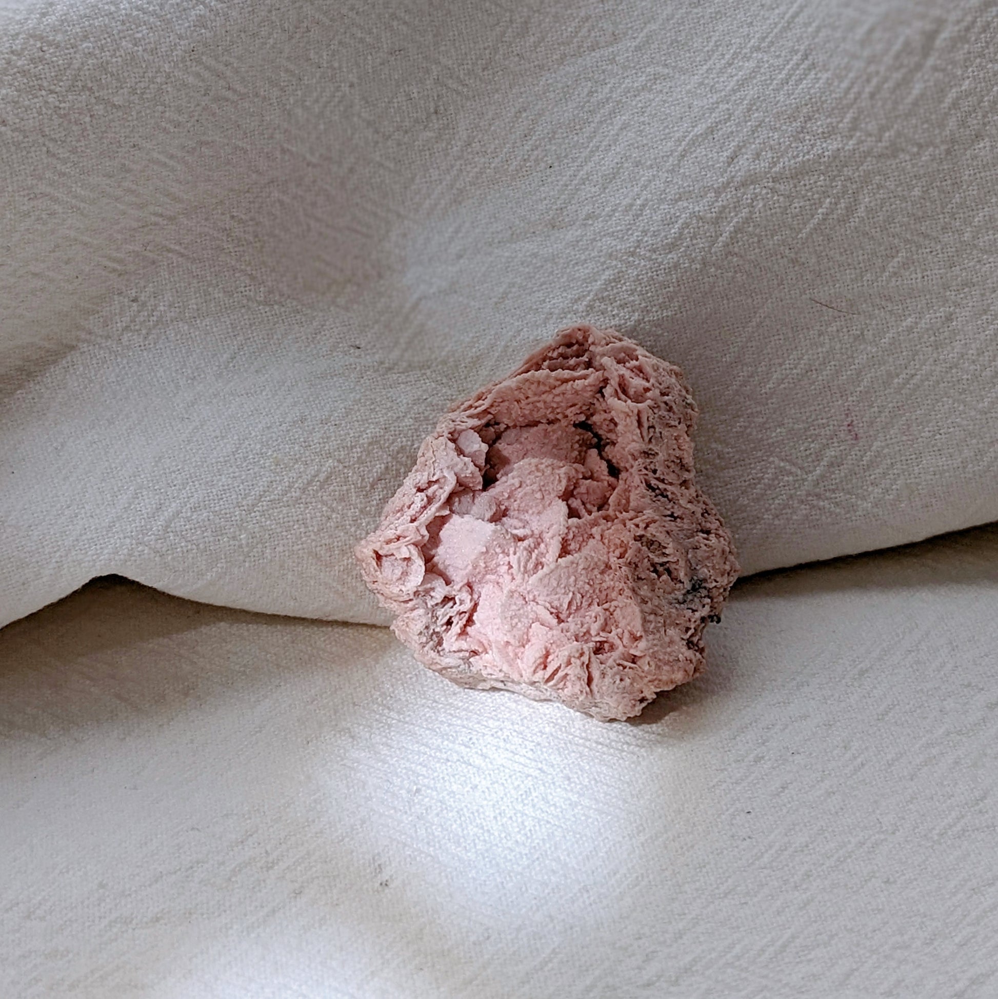 這塊來自祕魯的玫瑰菱錳礦,帶著柔和的粉紅與白色條紋,如同心靈裡溫柔的光。