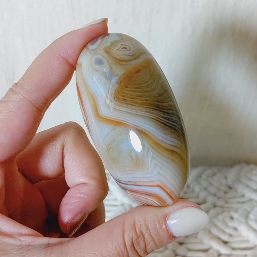 Agate is a stabilising stone, it restores vitality and motivation, and stimulates creativity. It's a stone of courage and protection. It attracts prosperity, new resources, and good luck. It promotes confidence when performing on stage or in live. It stimulates metabolism, and heals lower back problems. It improves concentration, and protects against envy, rage, and resentment from self or from others. It clears blockages and traumas that associates with the Root Chakra. It helps us overcome procrastination or indecision, it encourages positive life choices.