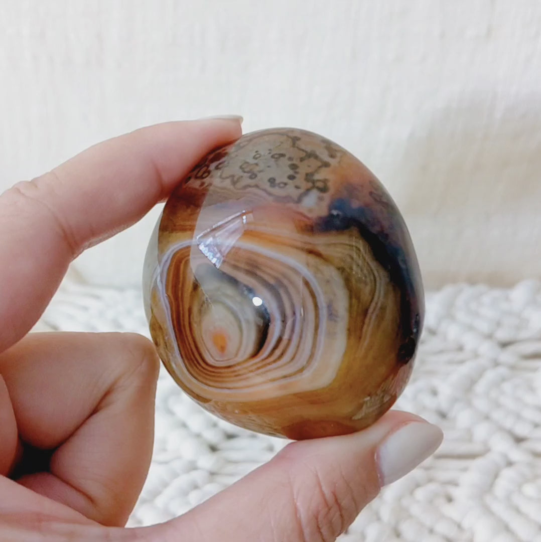 Agate is a stabilising stone, it restores vitality and motivation, and stimulates creativity. It's a stone of courage and protection. It attracts prosperity, new resources, and good luck. It promotes confidence when performing on stage or in live. It stimulates metabolism, and heals lower back problems. It improves concentration, and protects against envy, rage, and resentment from self or from others. It clears blockages and traumas that associates with the Root Chakra. It helps us overcome procrastination or indecision, it encourages positive life choices.