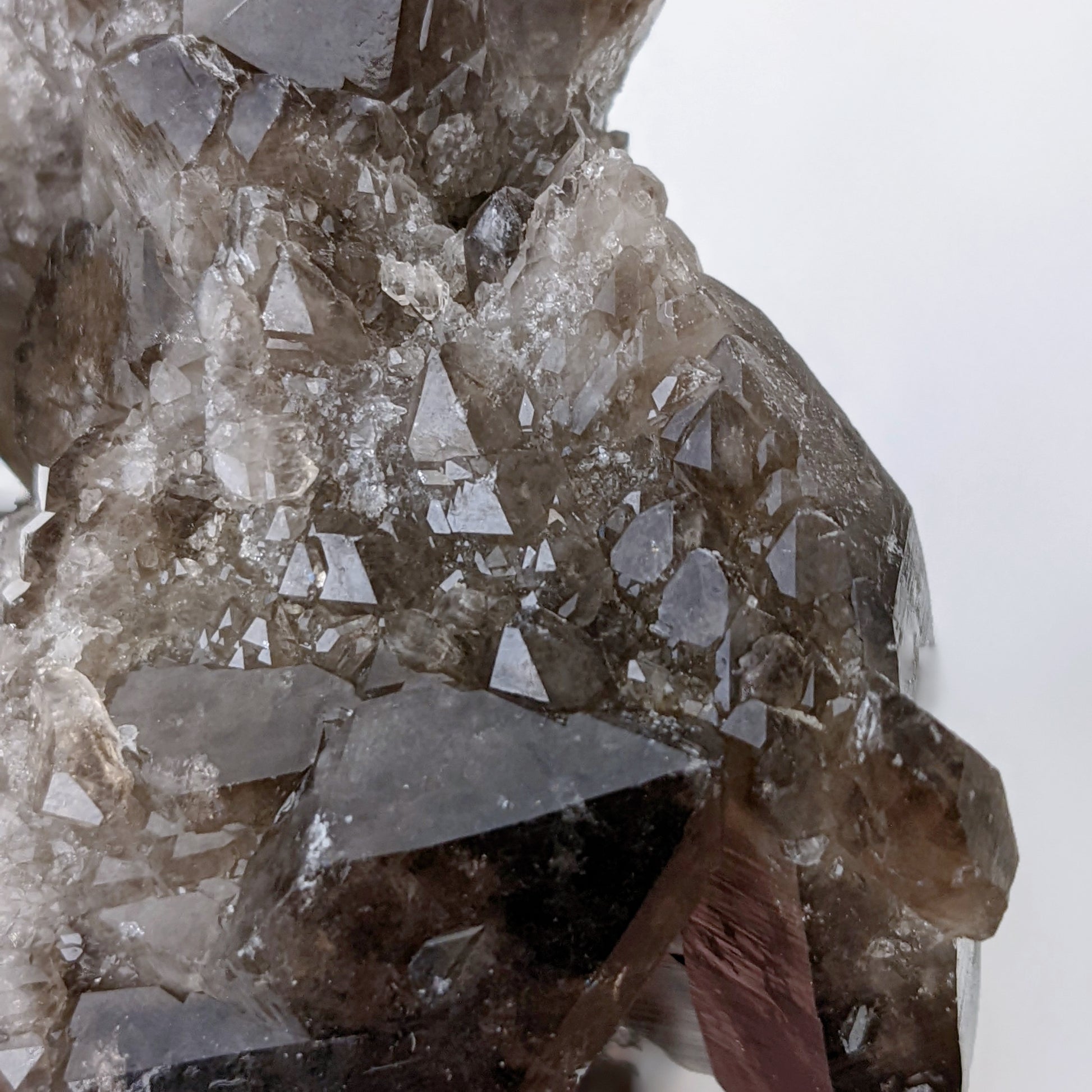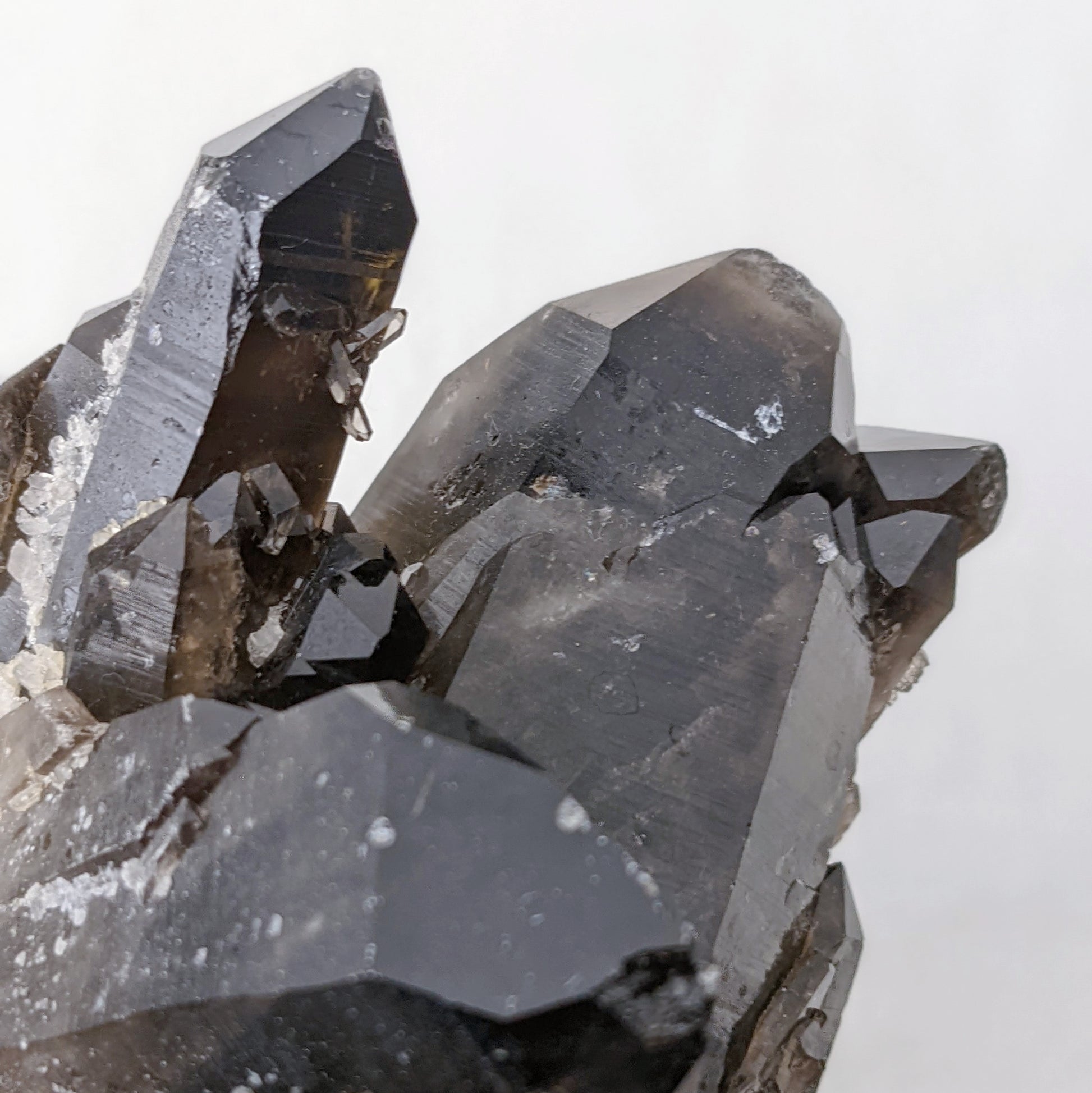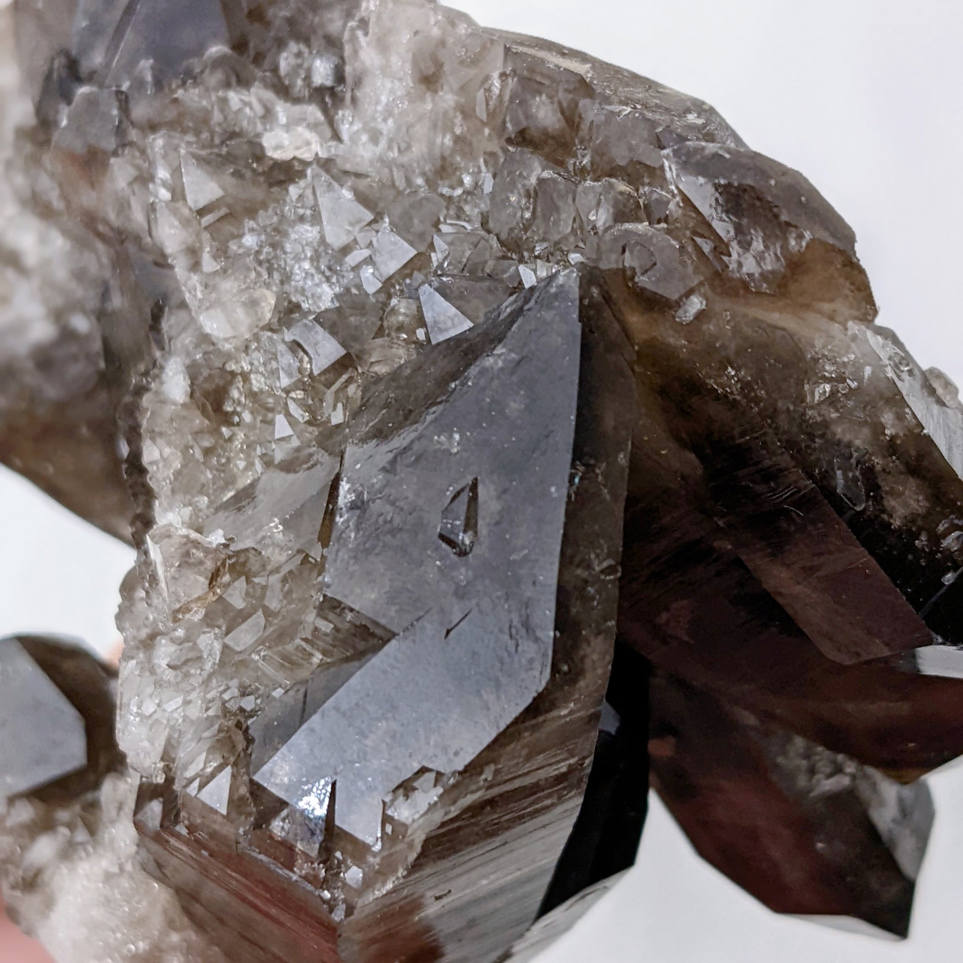 好看的茶晶簇不是很容易找到,這顆茶晶顏色接近墨晶,是非常沉穩的茶色,晶體算是難得的大而且表面是超亮面,晶柱打燈能穿透,它的結構十分獨特,整顆是由很多大大小小的雙尖茶晶柱組成,而且是一顆自我修復水晶(self-healed quartz),底部並不是開採造成的斷裂,而是天然環境斷裂後再自己長成的天然三角紋路,這個過程也讓它成為了一顆浮生水晶,意思是它並不是透過人工開鑿,它自然斷裂後因為環境許可繼續生長,所以變成雙尖水晶簇,雙尖水晶簇較為罕見,通常都是單顆,這裡其中一顆晶柱還長有資料庫的三角紋。