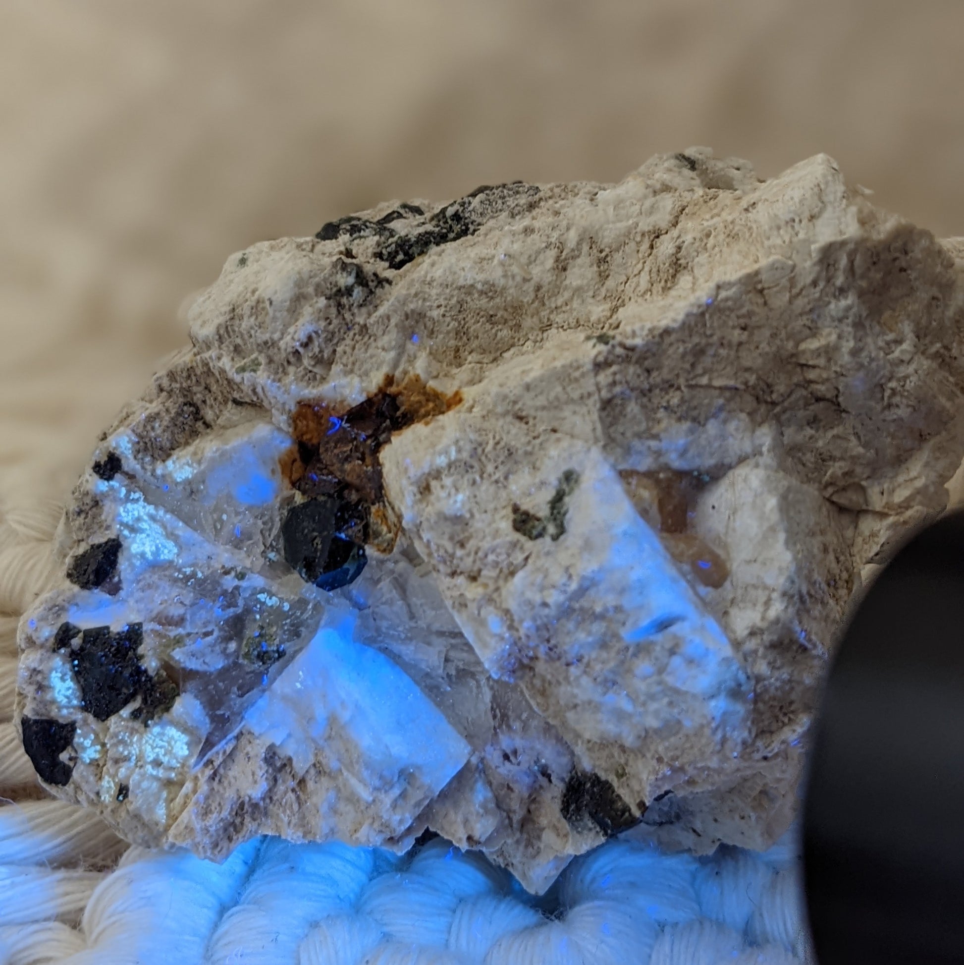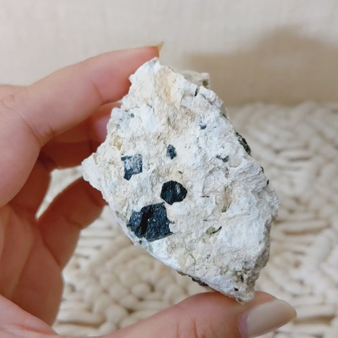 來塊可愛的黑白配,好像一顆巨型的黑白牛軋糖 。這是黑碧璽跟長石共生的原石,比較少見的配搭,長石照燈會有藍色螢光。