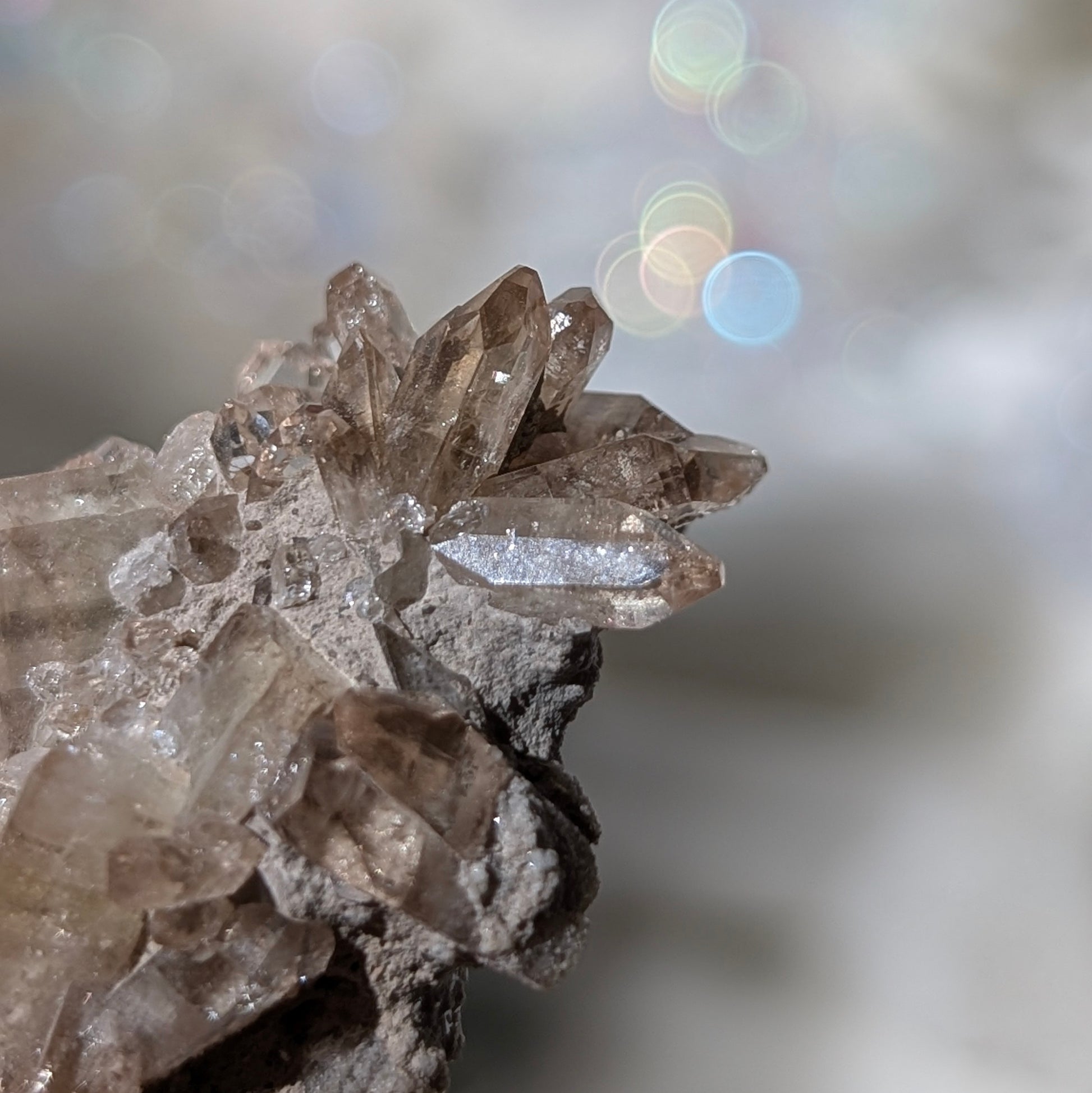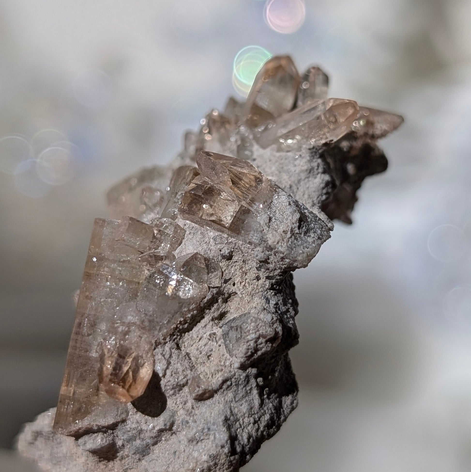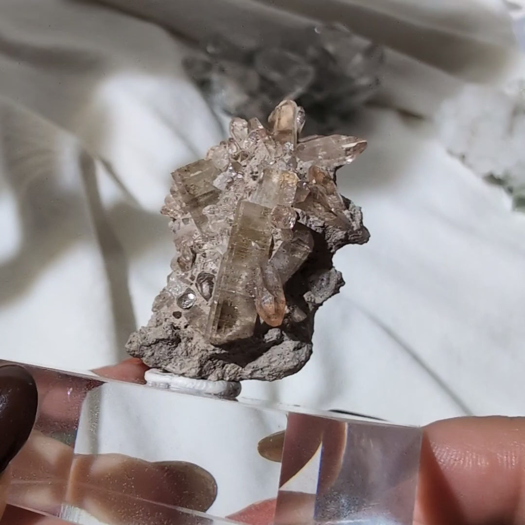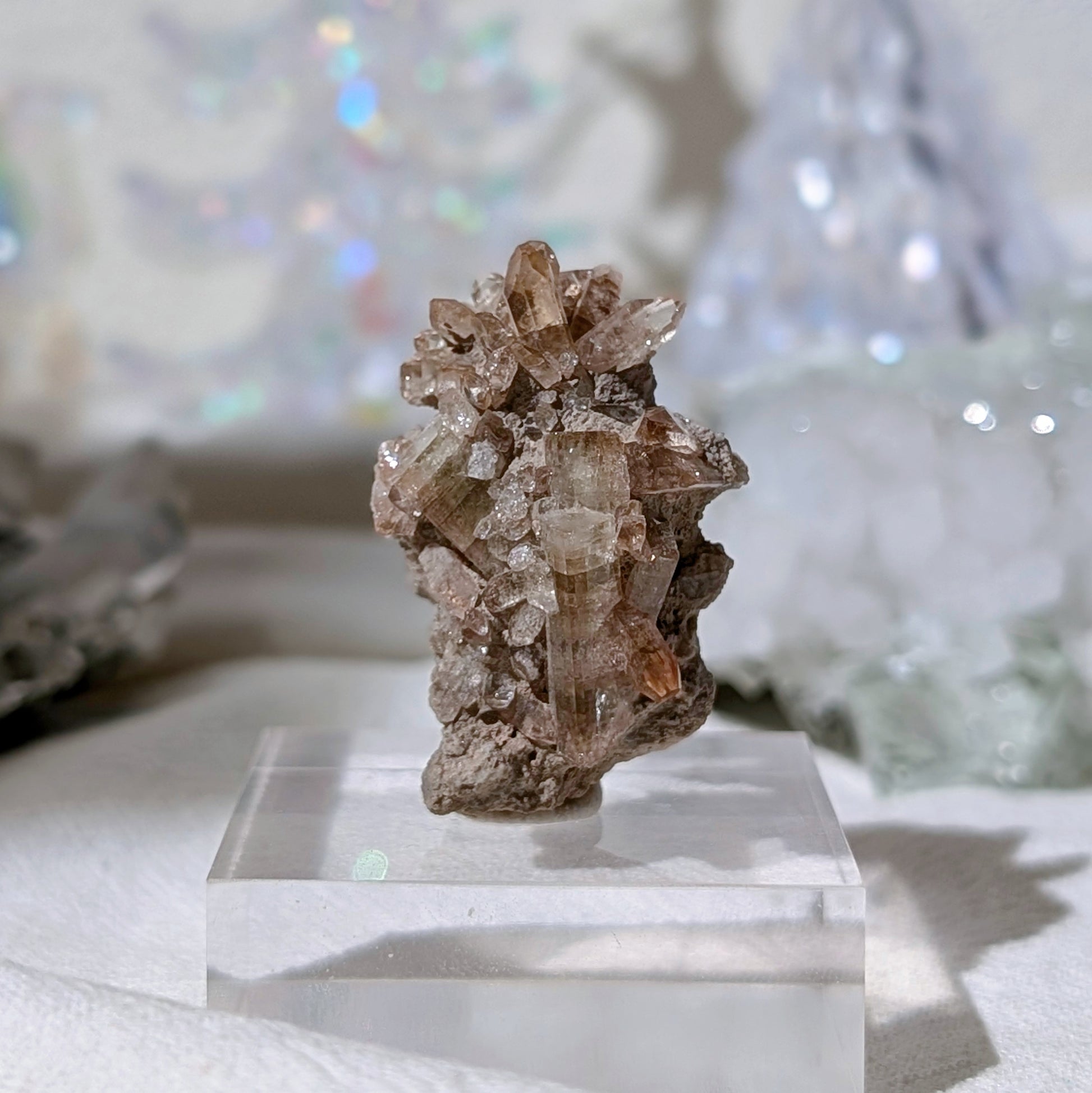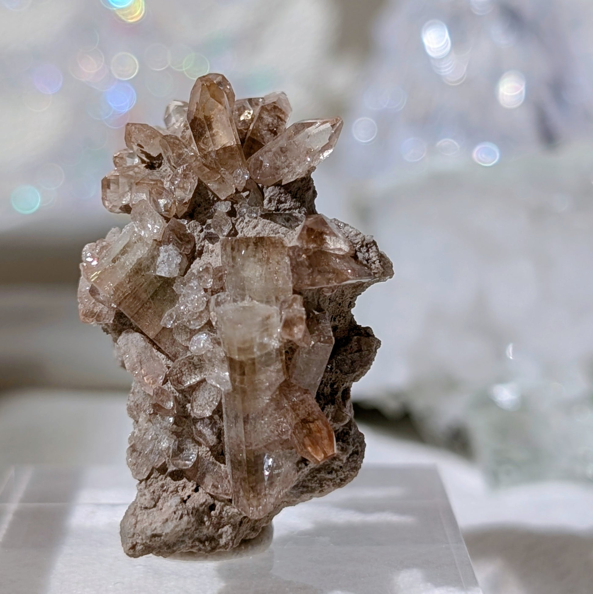 這是一個小托帕簇,晶體十分透亮,這顆是由很多顆大大小小的托帕組成的,正面呈小花形狀,適合收藏於礦標盒子。